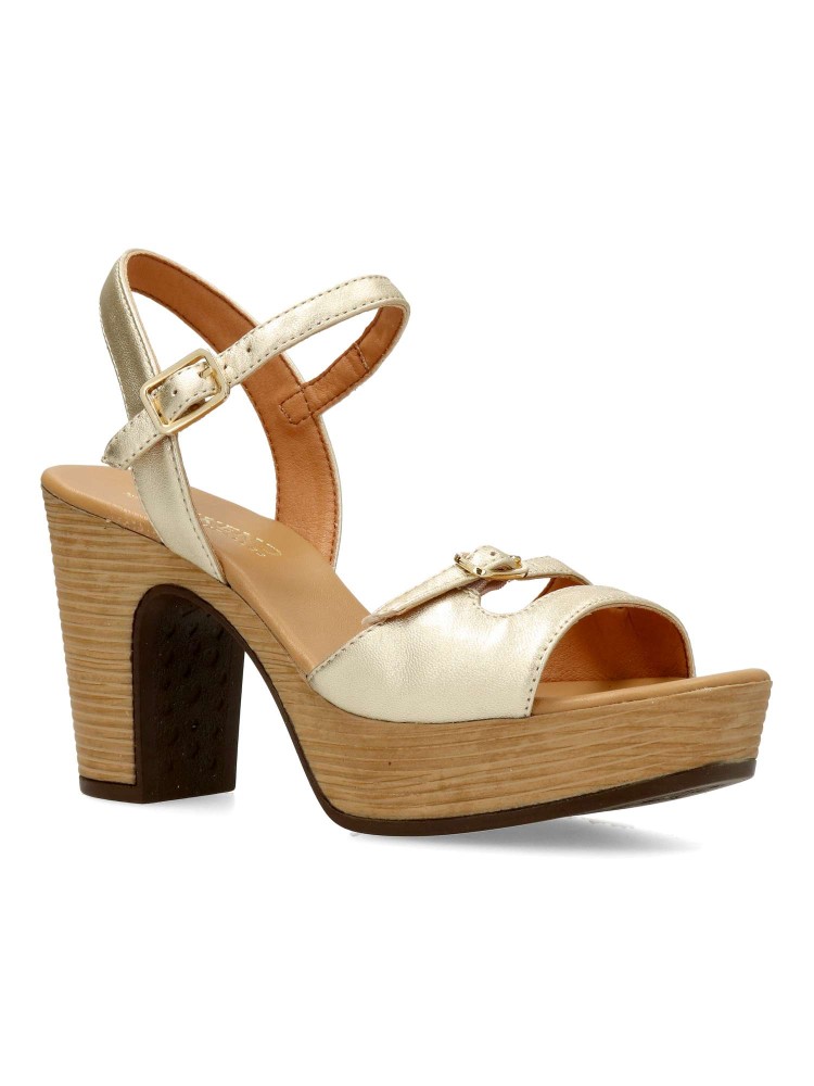 Sandalias de piel de color platino. Modelo que apuesta por un diseño original y lleno de personalidad. Tacón efecto madera de 9 cm. Plataforma de 3 cm. Unas sandalias con personalidad propia con las que lucirás perfecta cualquier look.
