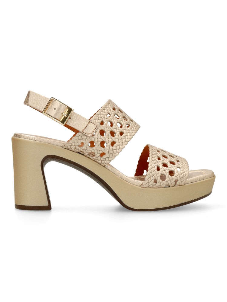 Sandalia de mujer, fabricada en piel de primera calidad. Forro interior y plantilla de piel. Cierre de hebilla. Modelo cómodo y elegante de tiras. Tacón al tono de 7,5 cm. Plataforma 2,5 cm. Fácil de combinar en eventos y celebraciones. Hecho en España.