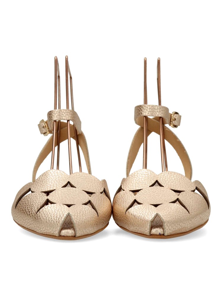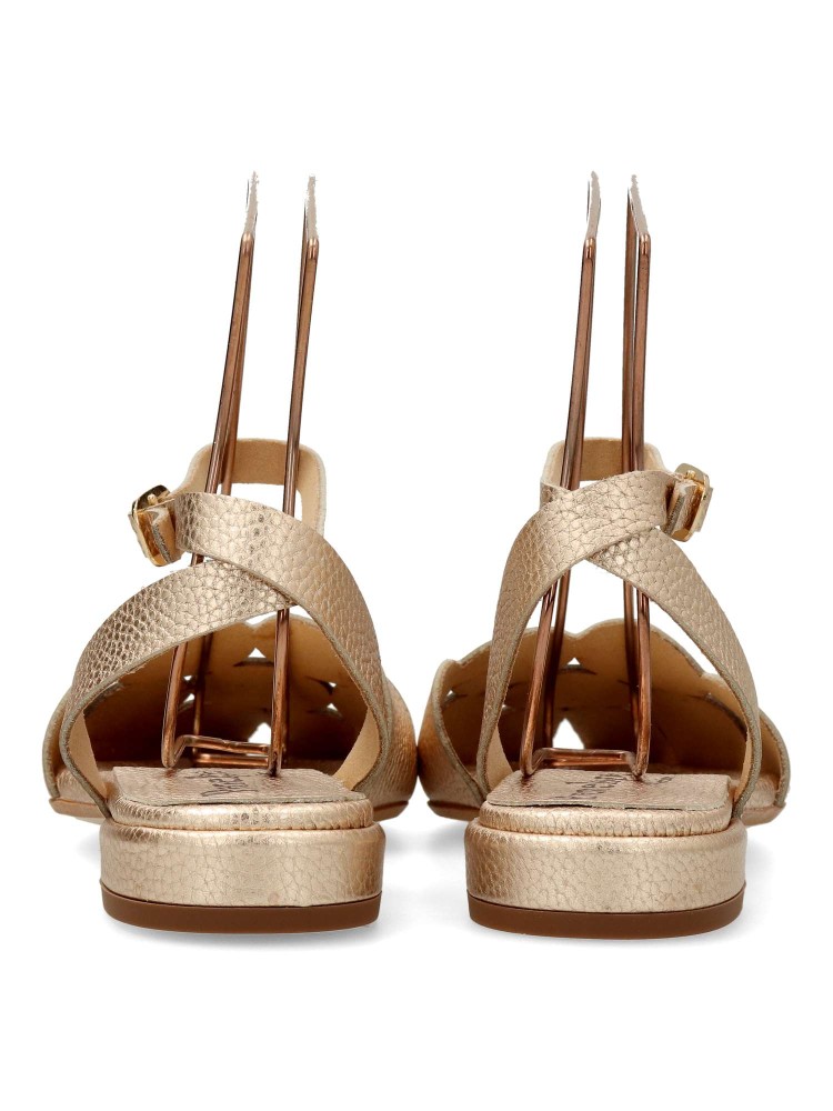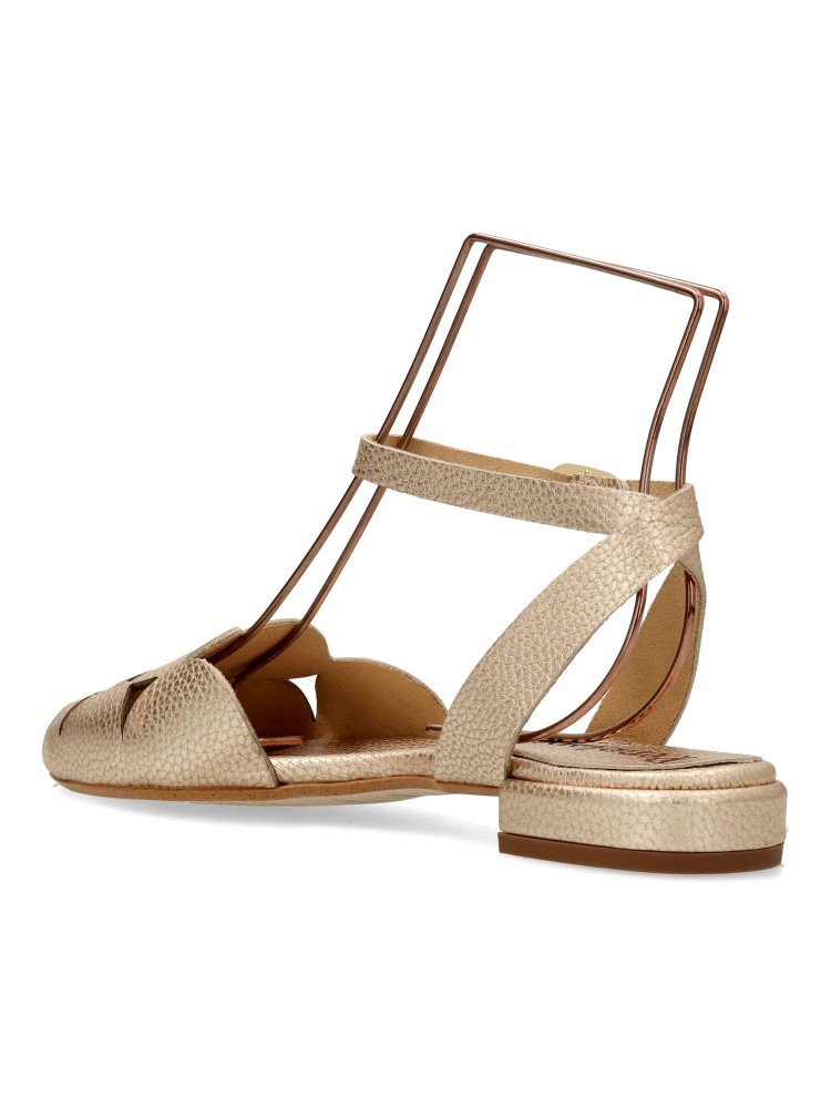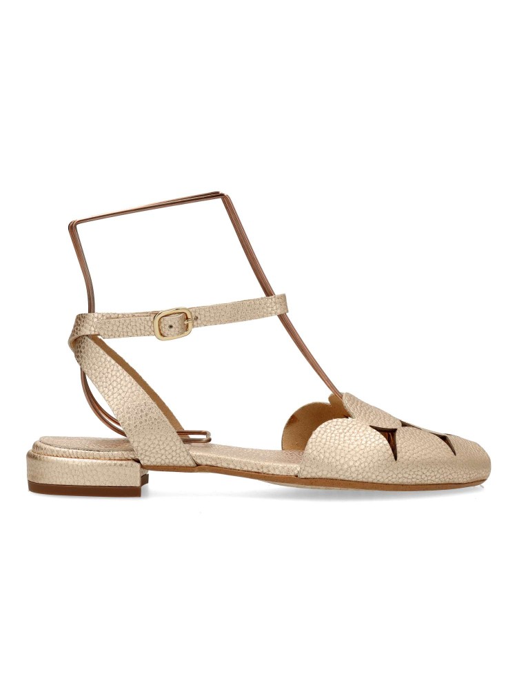 Sandalia plana de mujer, fabricada en piel metalizada. Tiras al tobillo con cierre de hebilla. Forro interior y plantilla de piel. Color platino. Modelo cómodo y elegante, ideal tanto en tu día a día, como para eventos y celebraciones. Hecho en España.