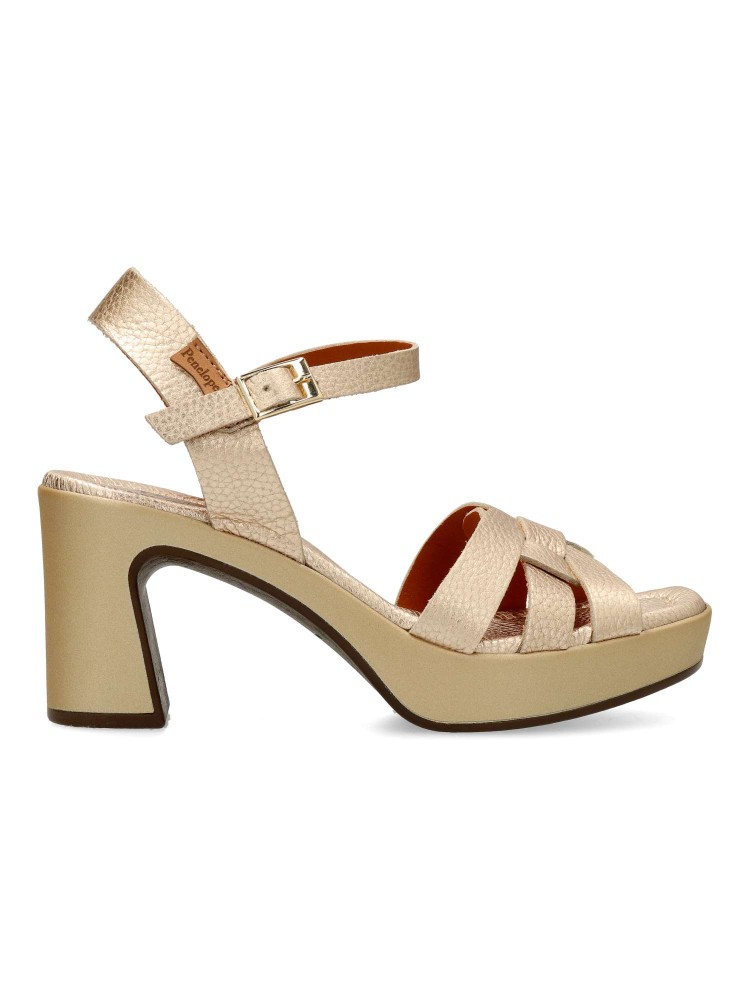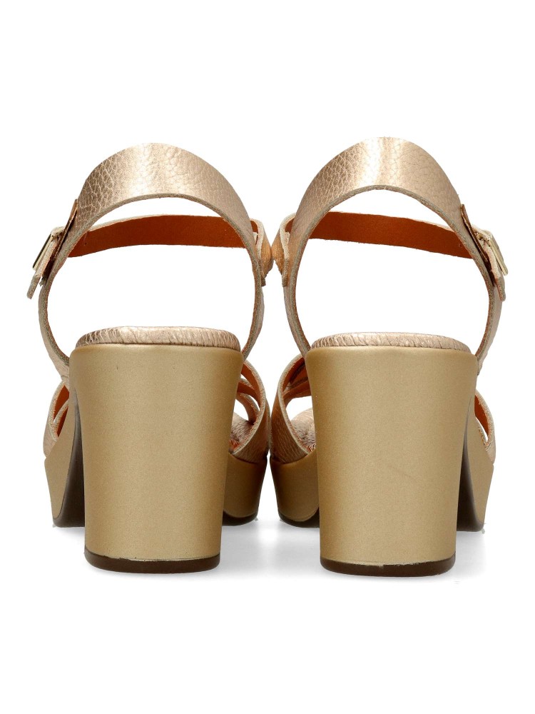 Sandalia de mujer, fabricada en piel de primera calidad. Forro interior y plantilla de piel. Cierre de hebilla. Modelo cómodo y elegante de tiras. Tacón al tono de 7,5 cm. Plataforma 2,5 cm. Fácil de combinar en eventos y celebraciones. Hecho en España.