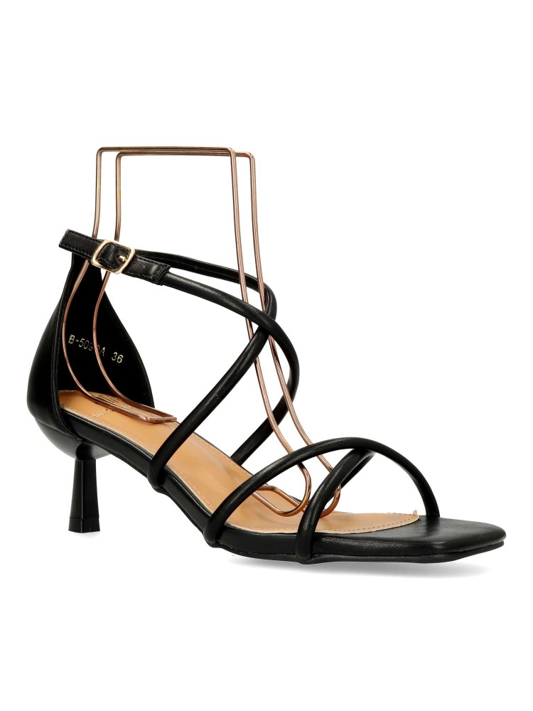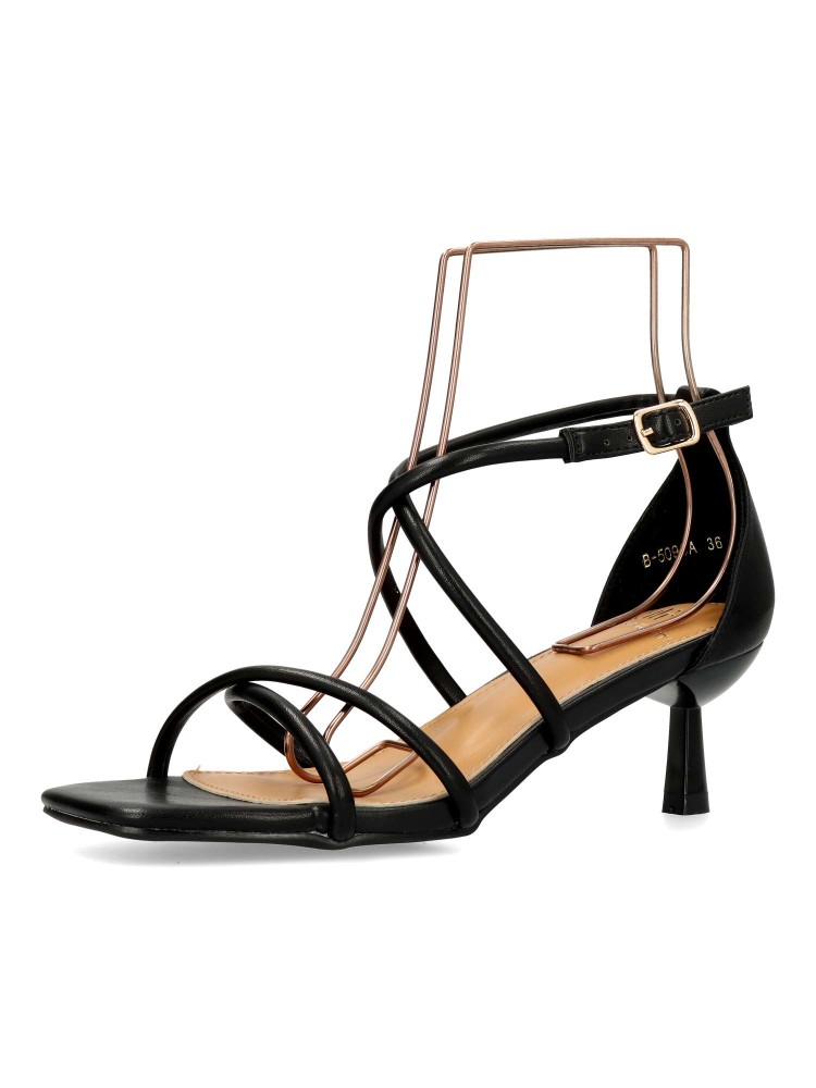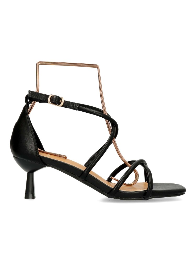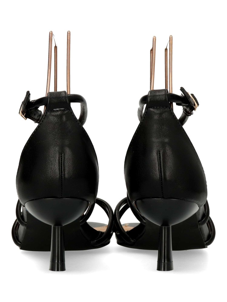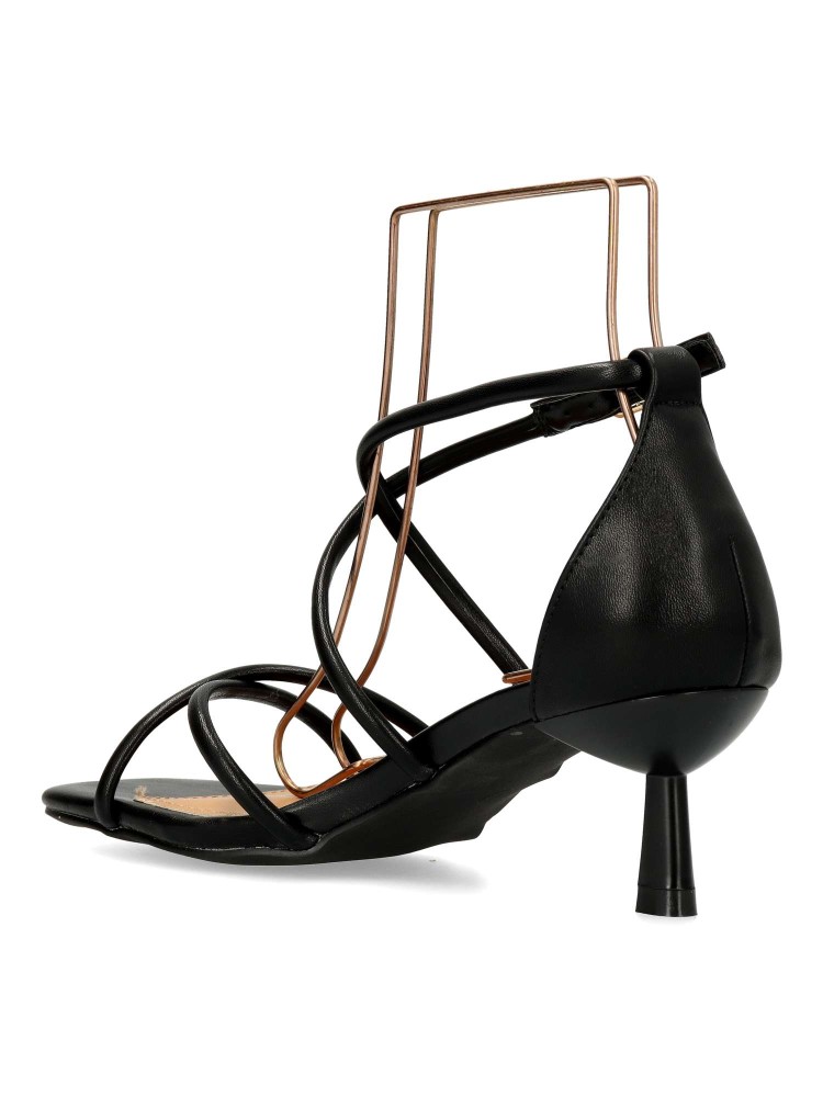 Sandalia de fiesta metalizada para mujer. Modelo de tiras cruzadas, con cierre de hebilla. Fabricado en piel sintética, con suela de goma. Tacón fino de 5 cm. de altura. Color negro. Ideal para bodas, comuniones y demás eventos y celebraciones.