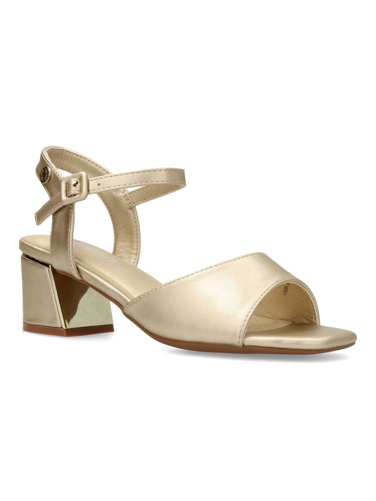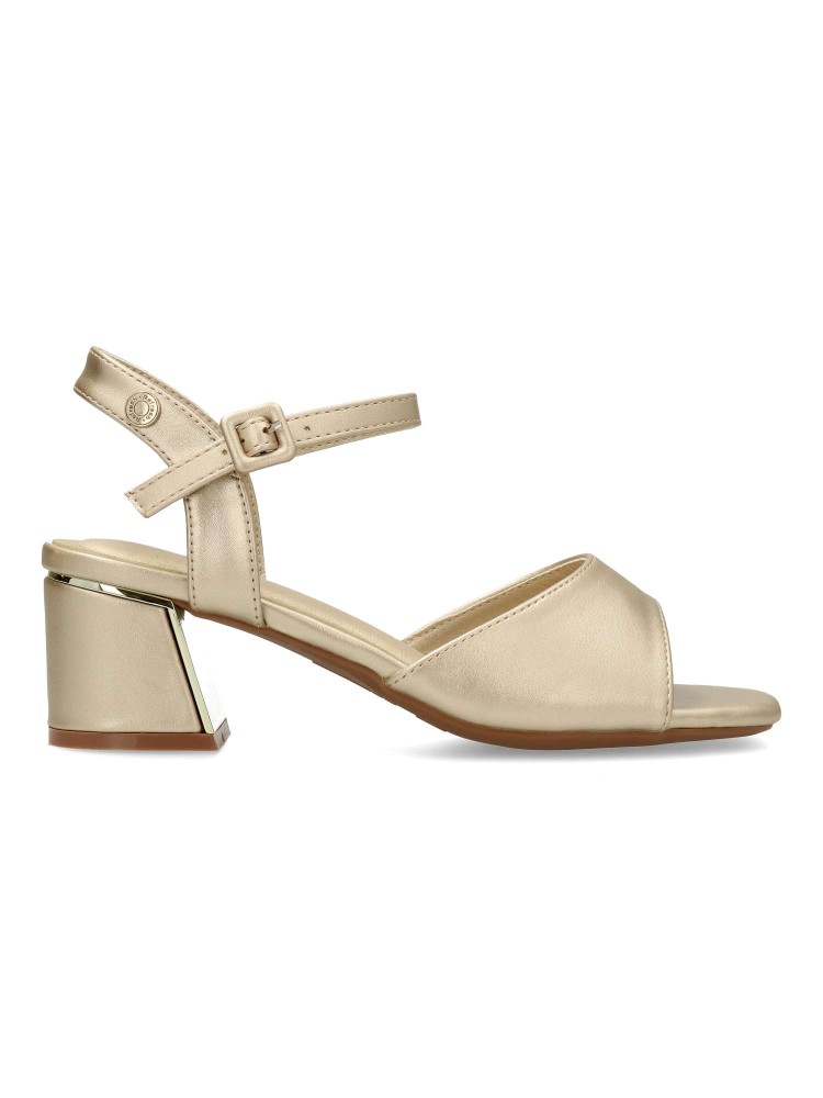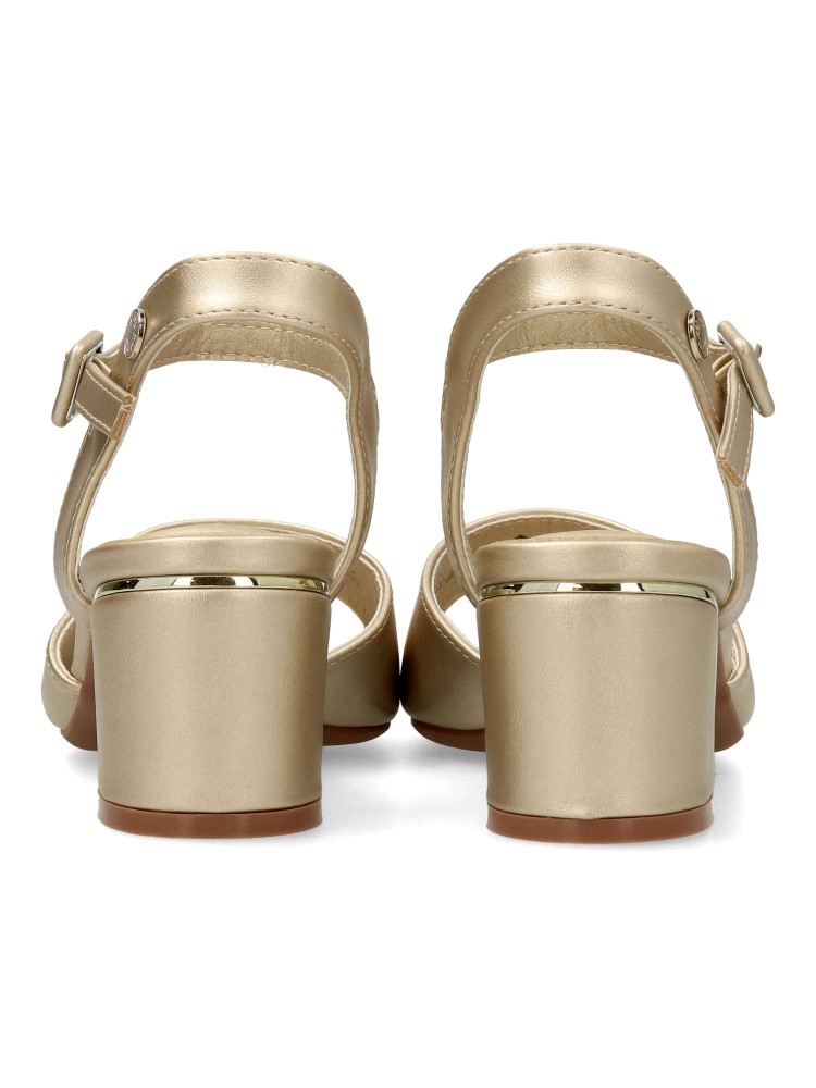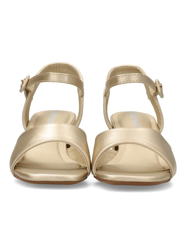 Sandalia fiesta de mujer, fabricada en piel sintética. Pala y pulsera trasera con hebilla para sujetar al tobillo. Cómoda planta acolchada. Tacón forrado en el mismo material que el corte, con pieza metalizada. Tacón ancho de 5,5 cm. Certificado vegano.