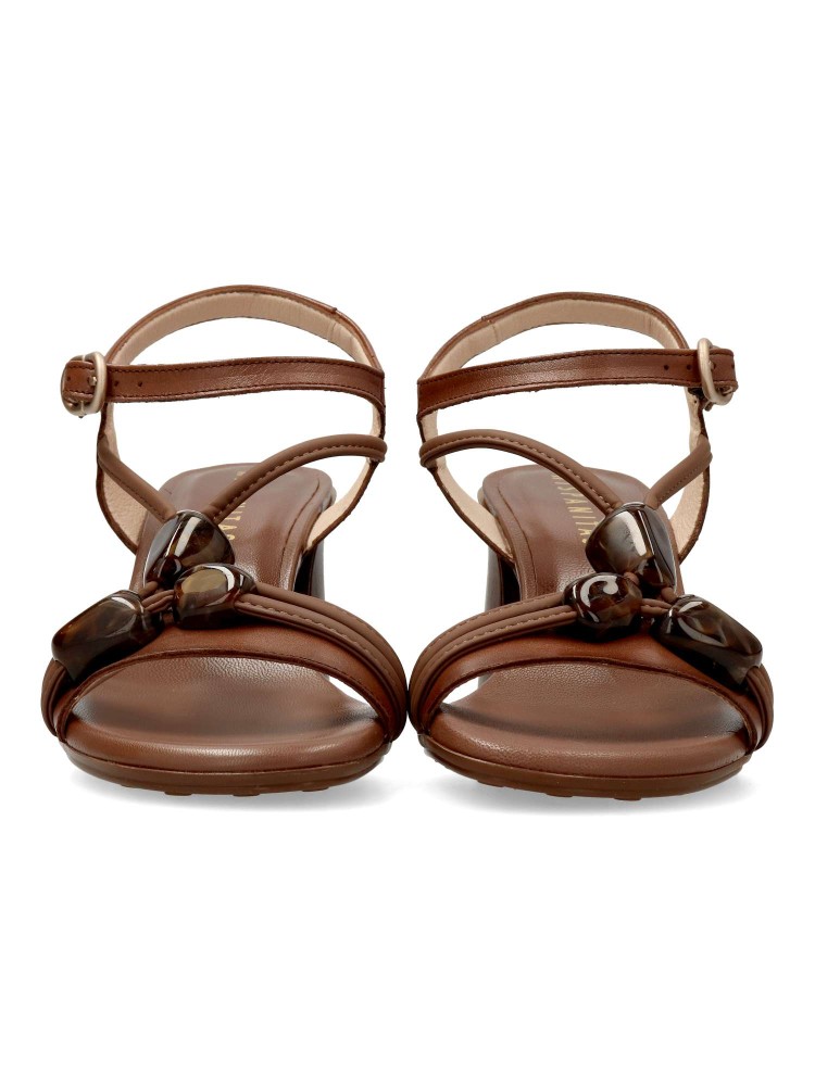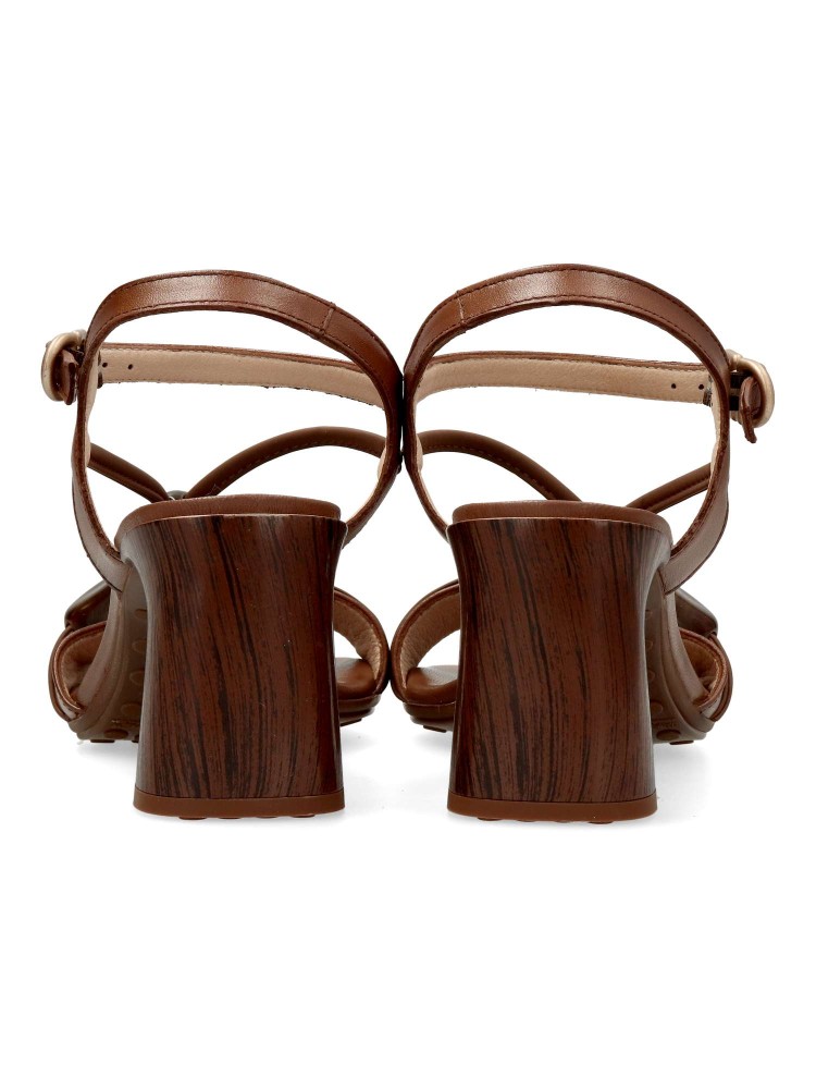 Sandalia destalonada de tiras, elaborada en piel, con detalles artesanales. Cierre de hebilla. Tacón efecto madera de 7 cm. Color avellana. Tecnología TRIFLOW, que aporta flexibilidad y confort en la pisada. La mejor apuesta para cualquier ocasión.