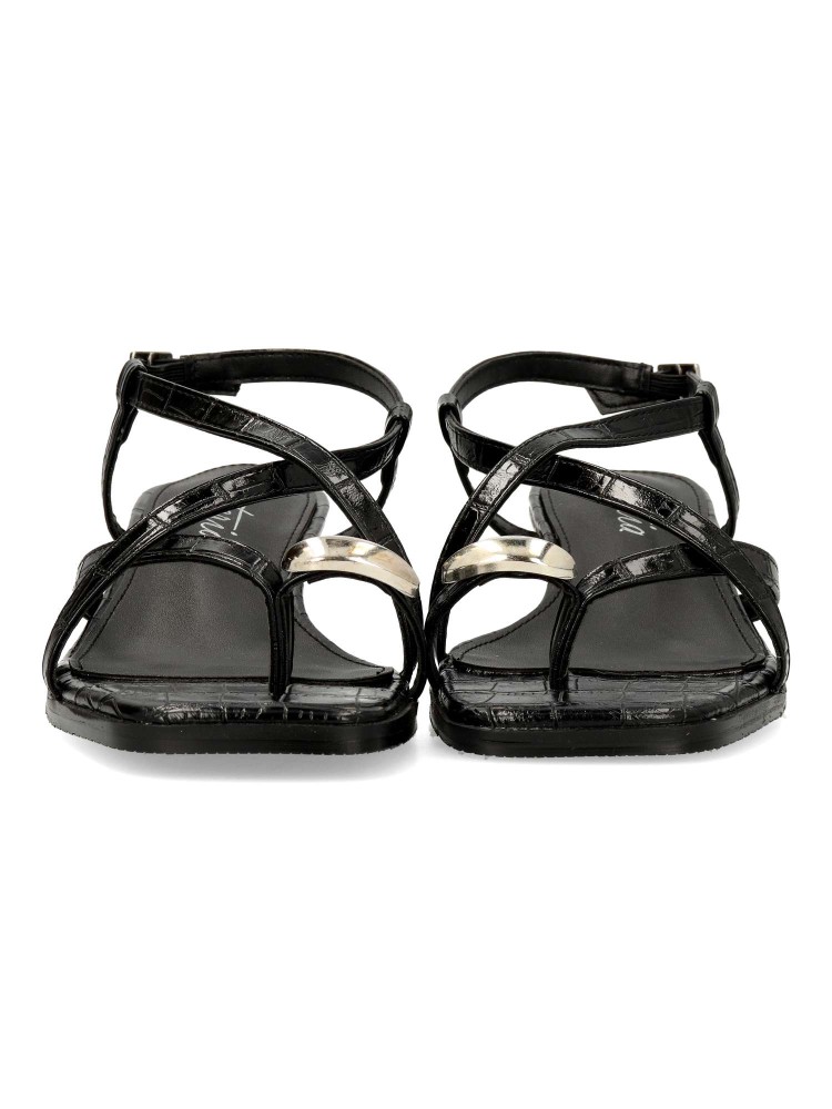 Sandalia cómoda para mujer. Fabricada en piel sintética con suela de goma. Color negro. Versátiles y actuales, se adaptan a diferentes momentos del día con naturalidad y sofisticación, convirtiéndose en un imprescindible de la temporada. 100% veganas.