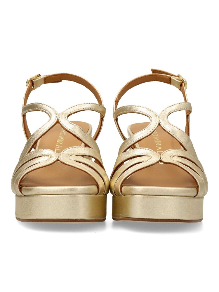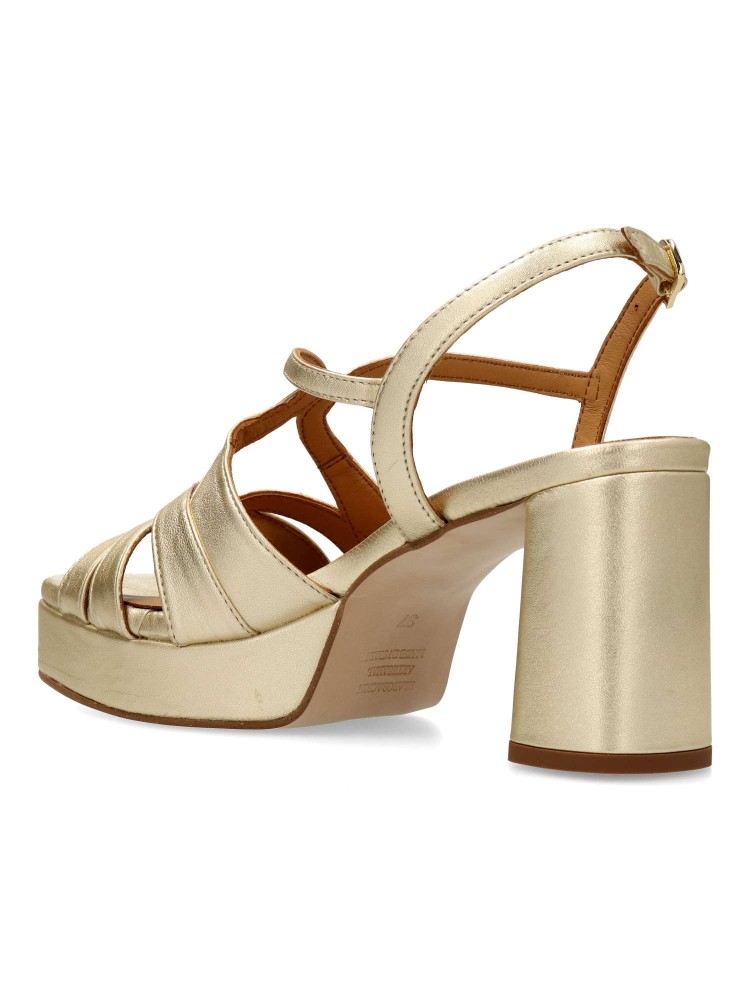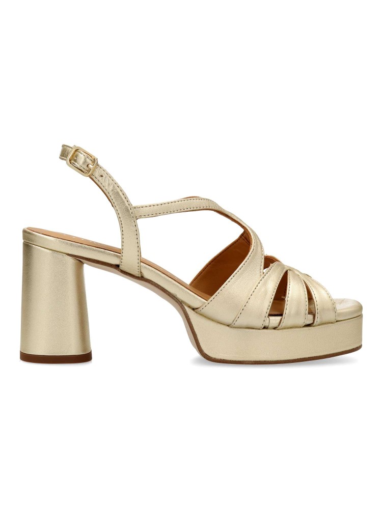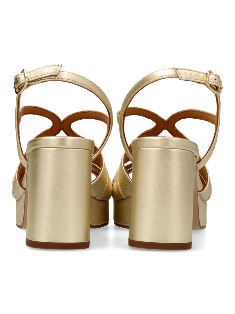 Sandalia de fiesta metalizada para mujer, fabricada en piel. Modelo de tiras con cierre de hebilla. Tacón de 8 cm. Plataforma 2,5 cm. Estilo único que envuelve el pie para crear un escote elegante. Modelo que estiliza gracias a su diseño especial.
