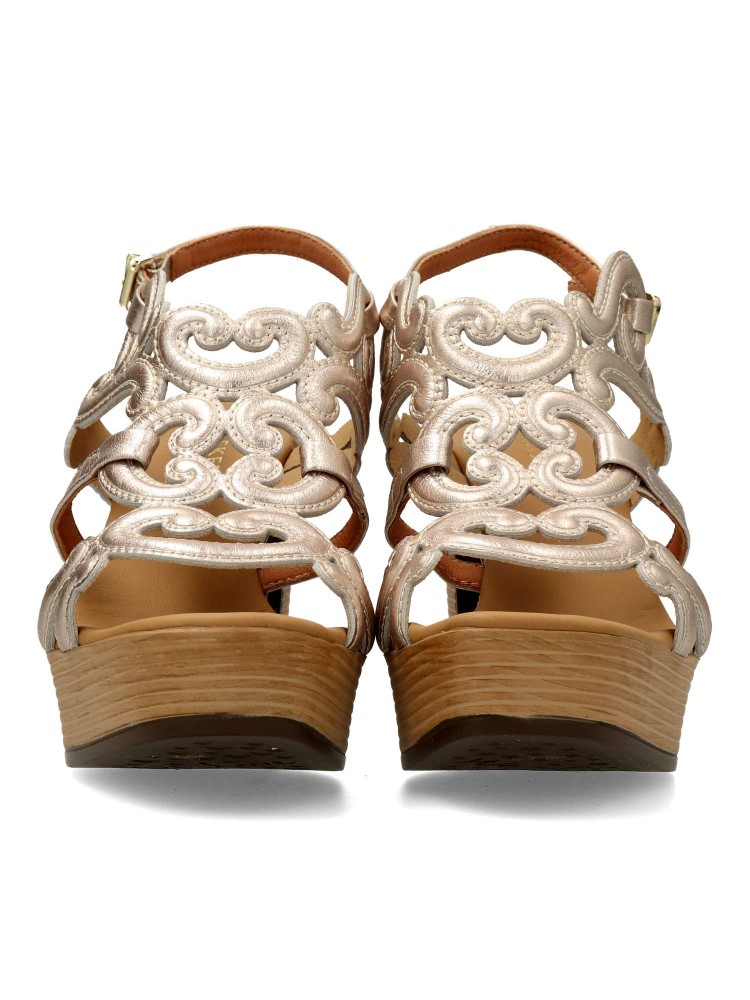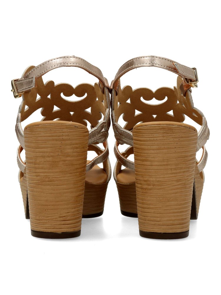 Sandalias de piel de color platino. Modelo que apuesta por un diseño original y lleno de personalidad. Tacón efecto madera de 9 cm. Plataforma de 3 cm. Unas sandalias con personalidad propia con las que lucirás perfecta cualquier look.