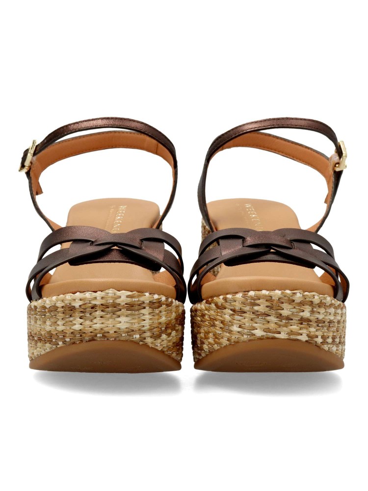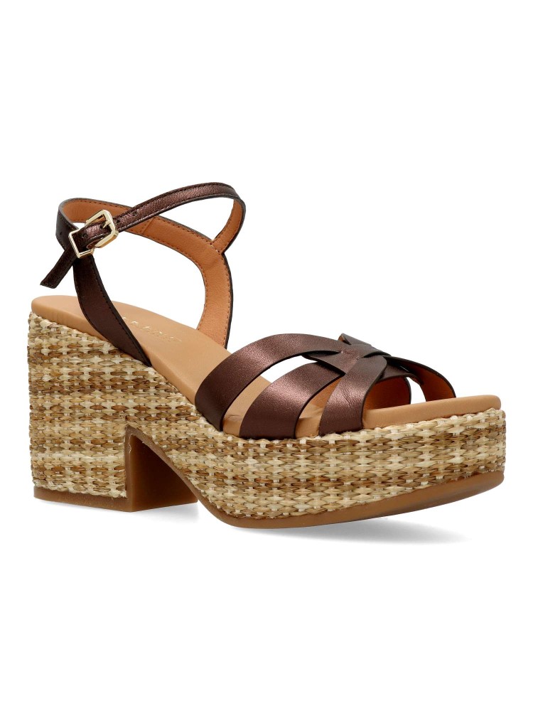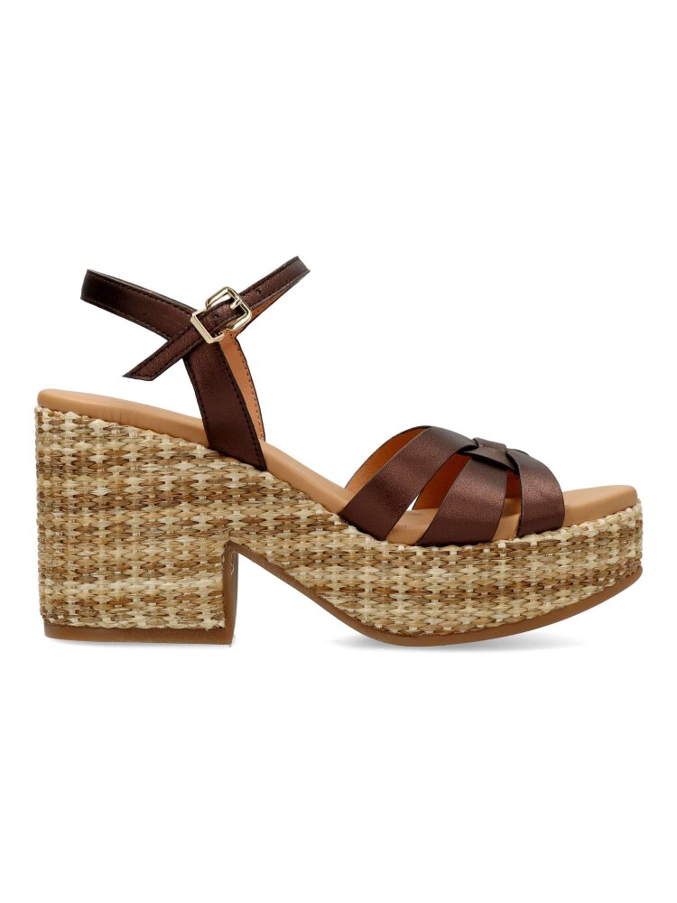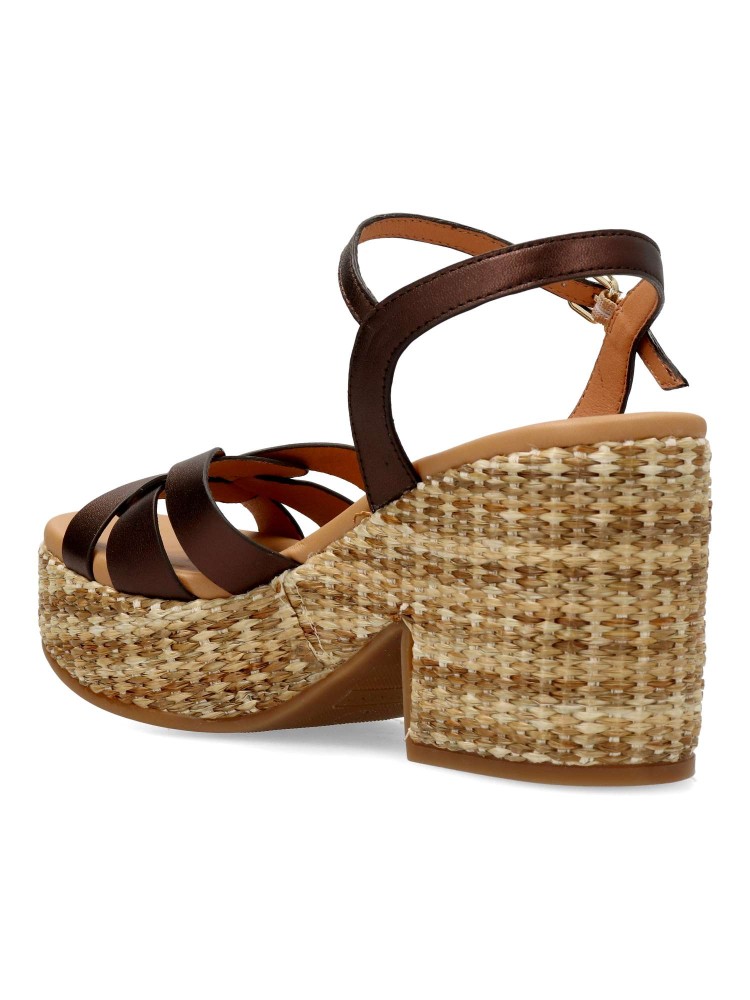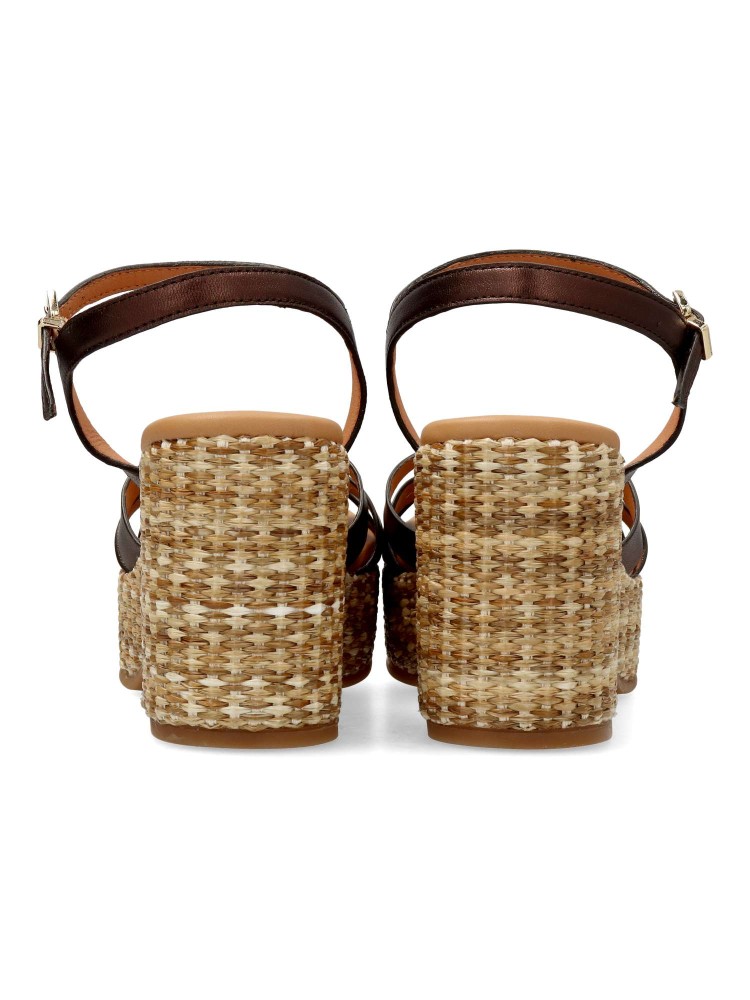 Sandalia de piel color marrón con plataforma de rafia. Un modelo tan atrevido como original. Diseñadas para lucirlas con comodidad en citas y eventos especiales. Diseño veraniego que combina la rafia con las tiras cruzadas de piel para aportarle elegancia