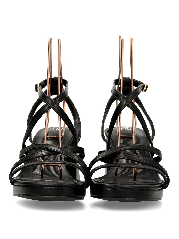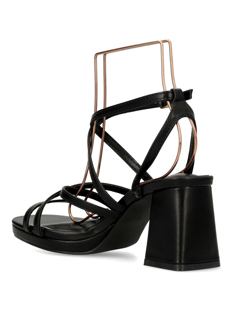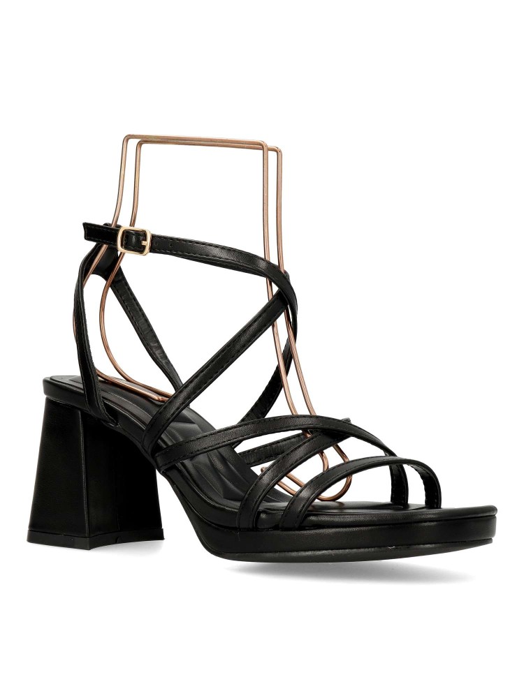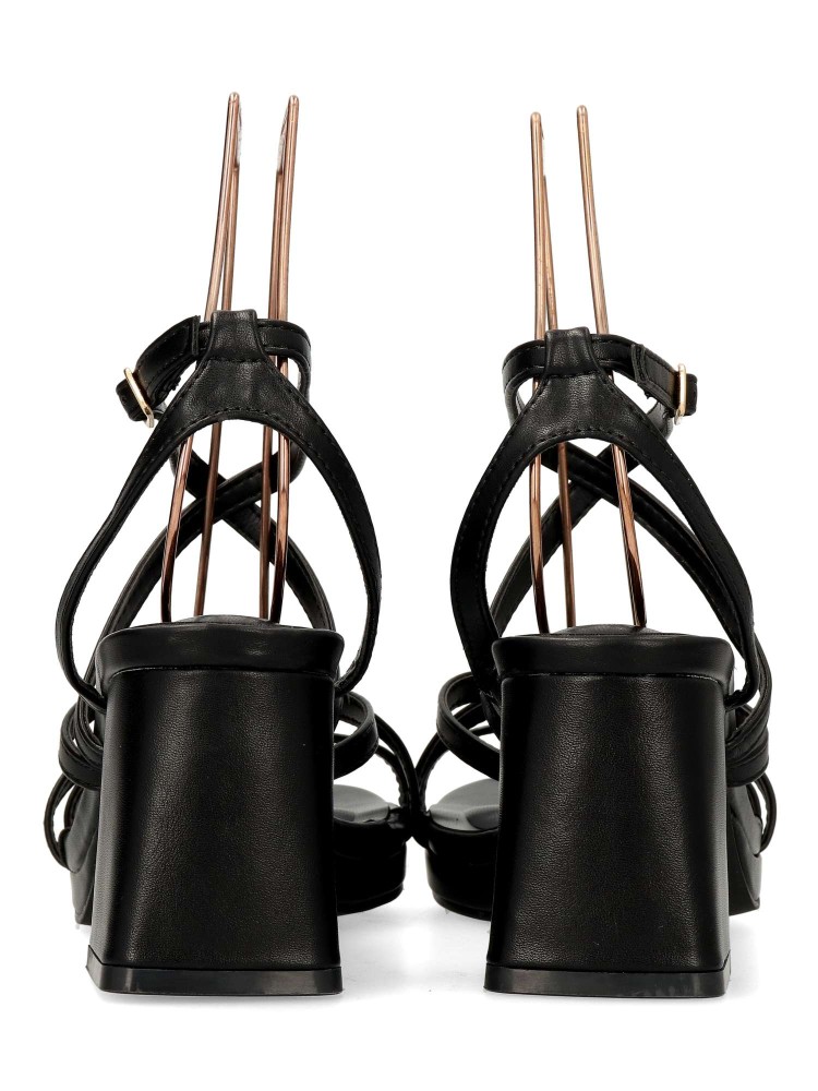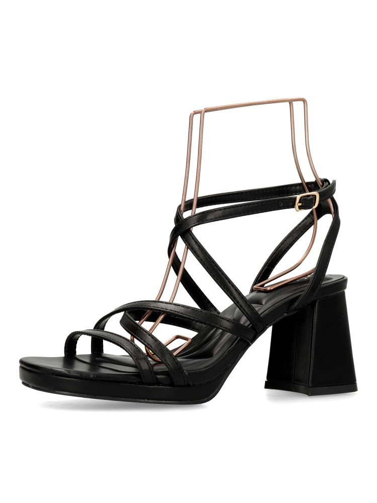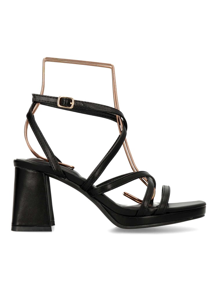 Sandalia de fiesta para mujer. Modelo elegante de tiras, con pulsera al tobillo y cierre de hebilla. Fabricado en piel sintética, con suela de goma. Tacón ancho de 7 cm. Color negro. Ideal para fiestas, eventos y celebraciones.