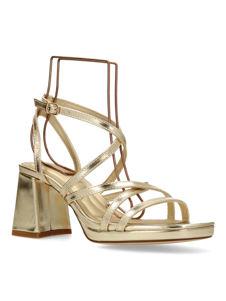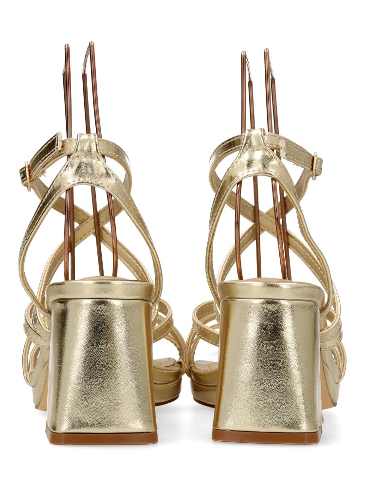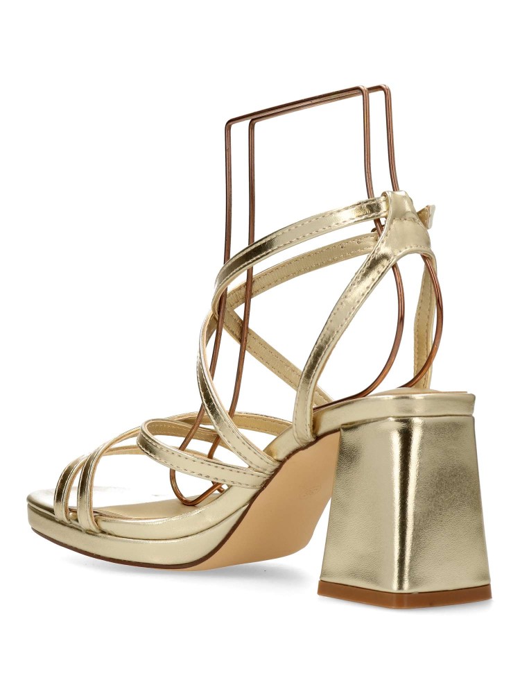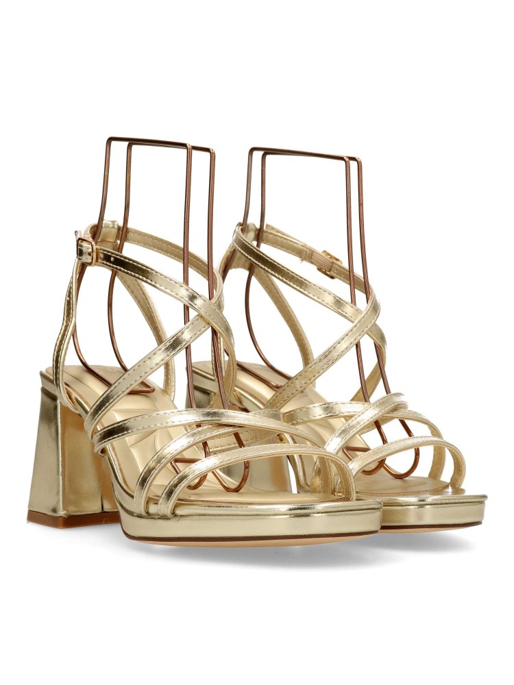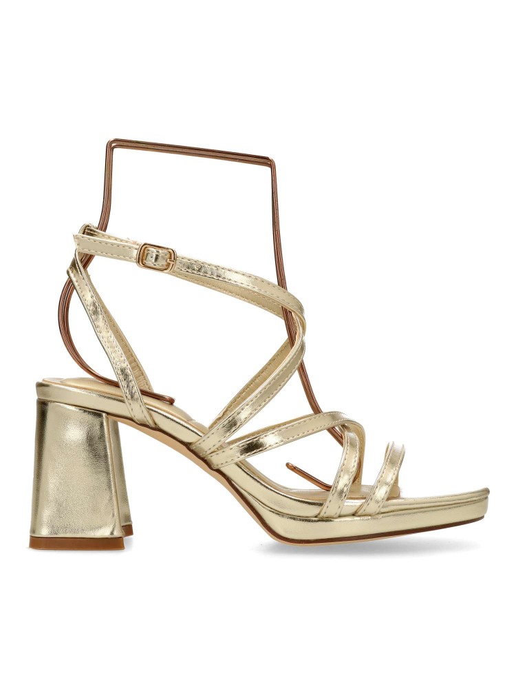Sandalia de fiesta para mujer. Modelo elegante de tiras, con pulsera al tobillo y cierre de hebilla. Fabricado en piel sintética metalizada, con suela de goma. Tacón ancho de 7 cm. Color oro. Ideal para fiestas, eventos y celebraciones.