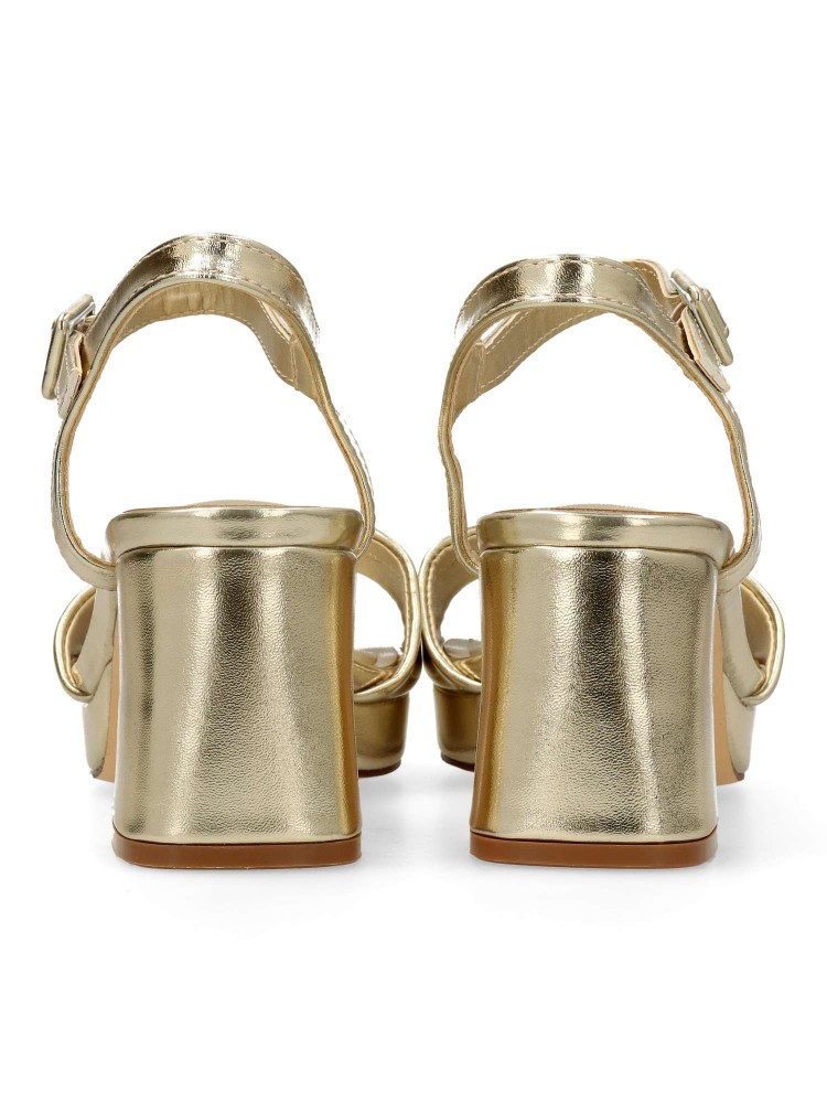 Sandalia de fiesta para mujer. Modelo elegante de tira ancha, con pulsera al tobillo y cierre de hebilla. Fabricado en piel sintética, con suela de goma. Tacón ancho de 6,5 cm. Color oro. Ideal para bodas, comuniones, bautizos y demás celebraciones.