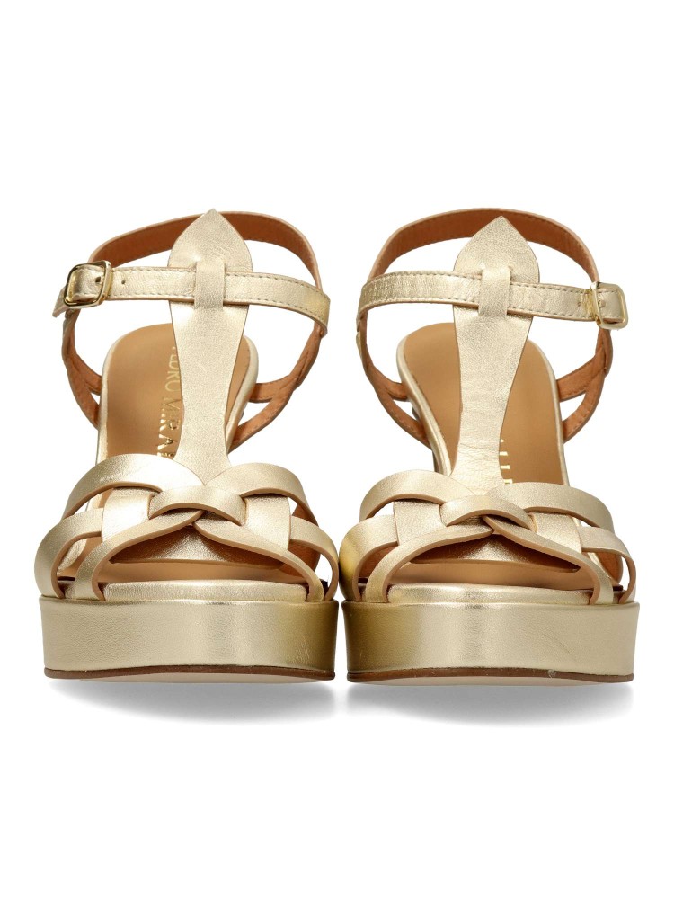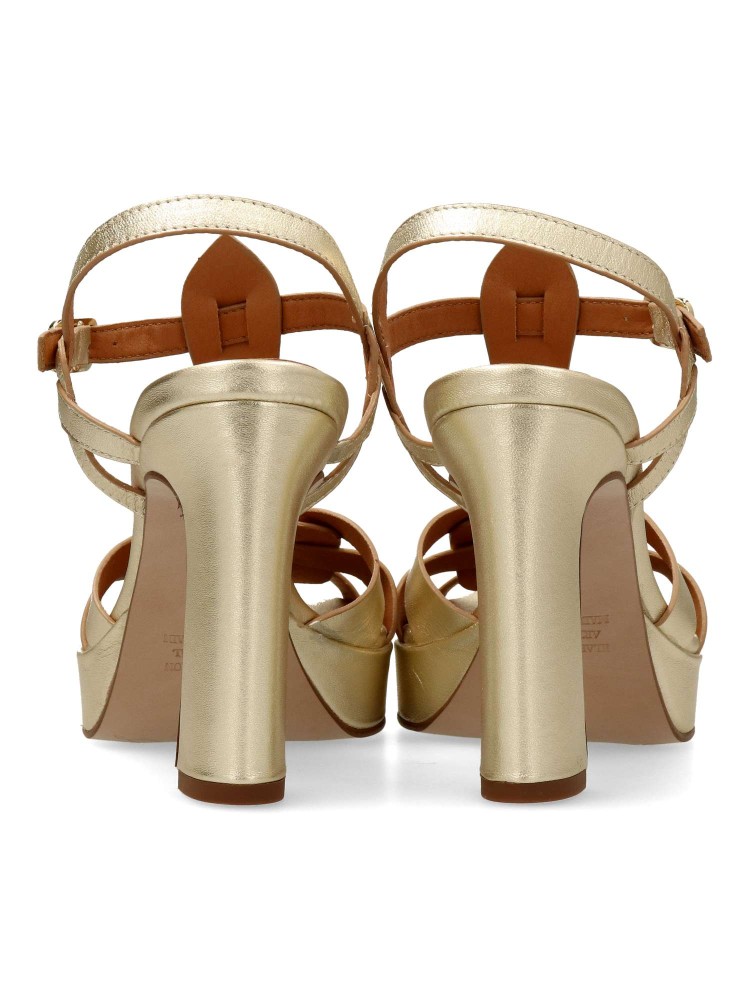 Sandalia de fiesta metalizada para mujer, fabricada en piel. Modelo de tiras con cierre de hebilla. Tacón de 10 cm. Plataforma 2,5 cm. La combinación de las tiras de la pala con el tacón retro y la plataforma aportan personalidad al modelo.