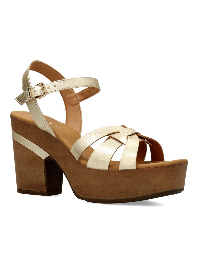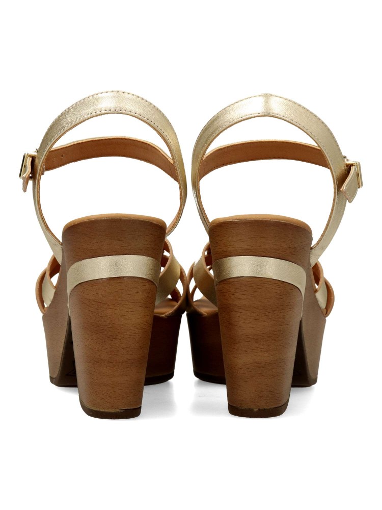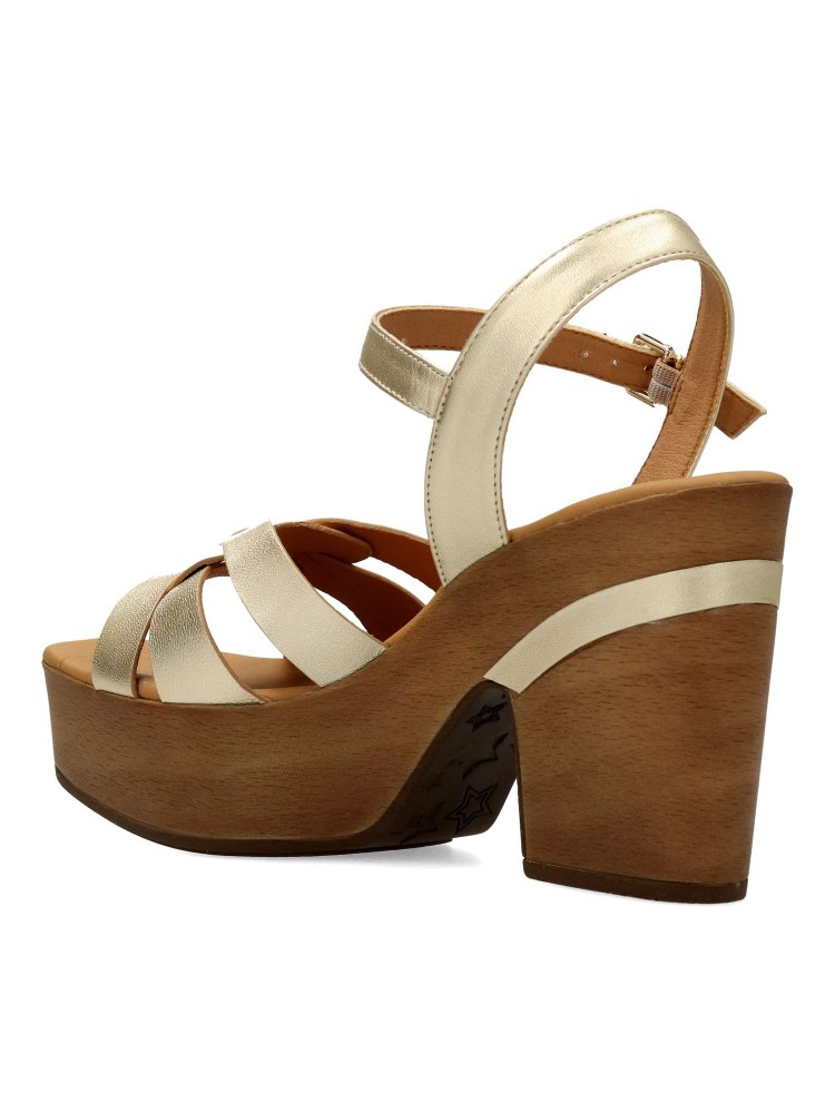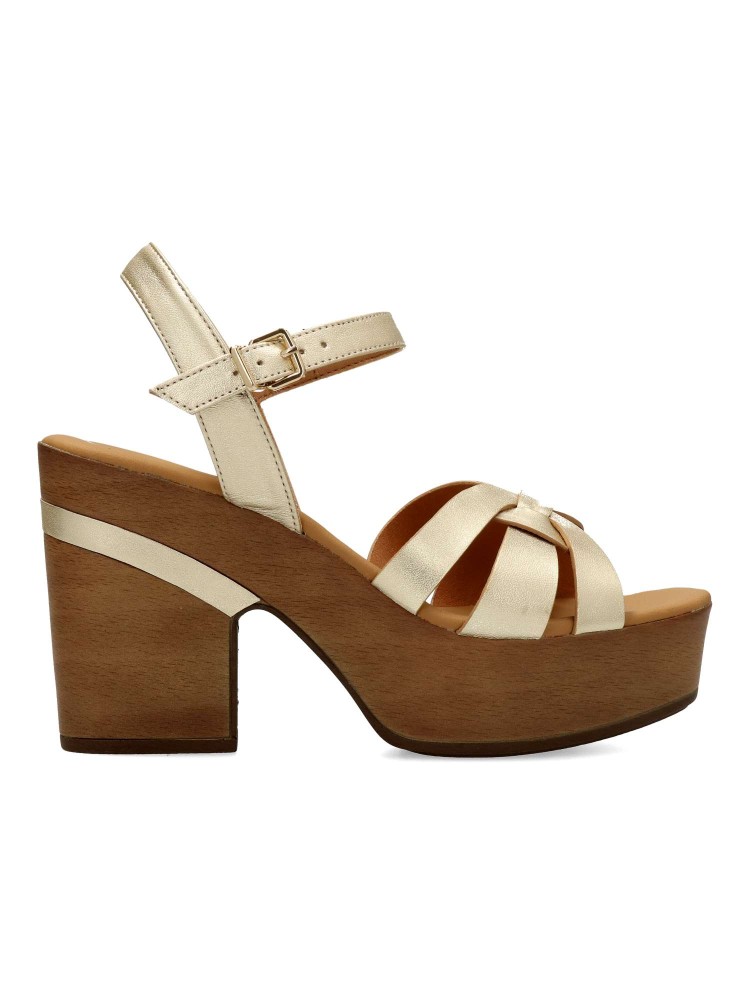 Sandalia cómoda de mujer, con tacón y plataforma efecto madera. Fabricada en piel natural. Color platino. Cierre de hebilla. Planta acolchada. Suela de caucho. Altura tacón 9 cm. Diseño y confort con tus outfits de verano. Hecho en España
