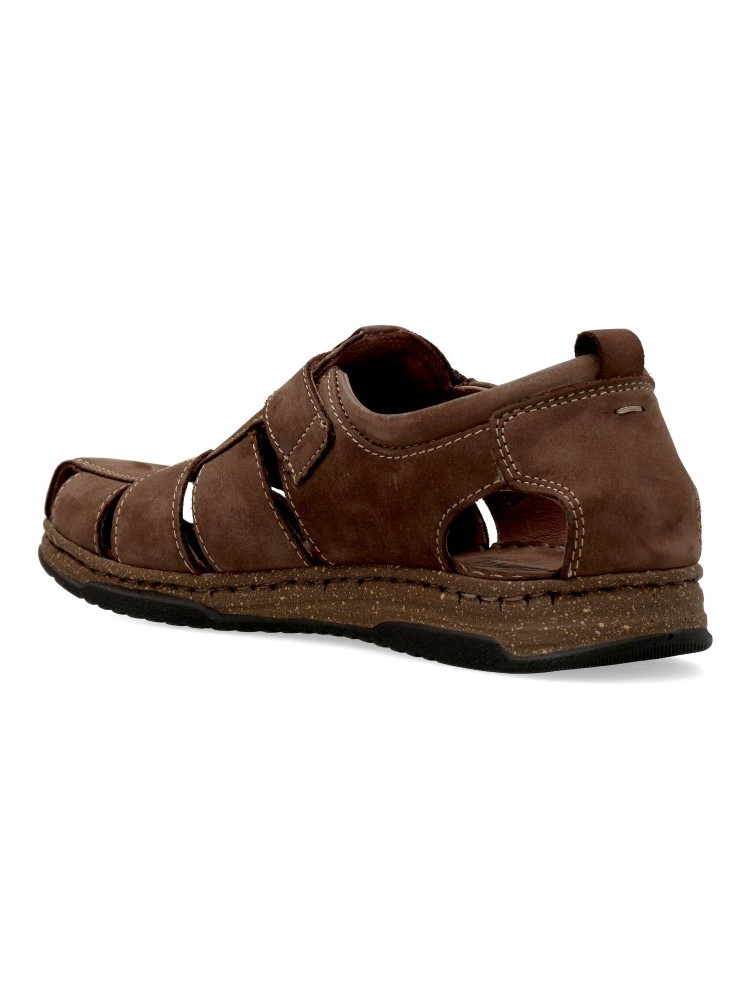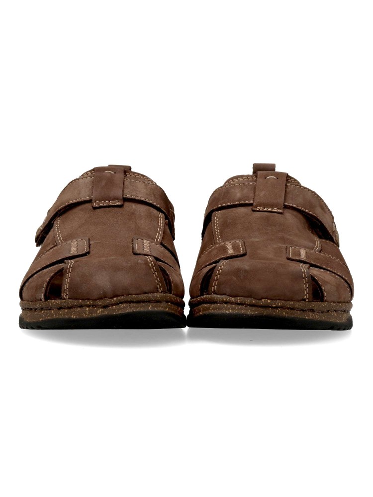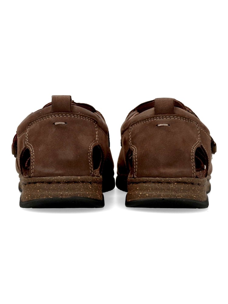 Sandalia cómoda de hombre fabricada en piel de primera calidad, con suela de goma termoplástica. Modelo cerrado con cierre adherrente. Planta de piel acolchada. Disponible en color marrón. Sandalias de verano, que ofrecen comodidad y frescura al caminar.