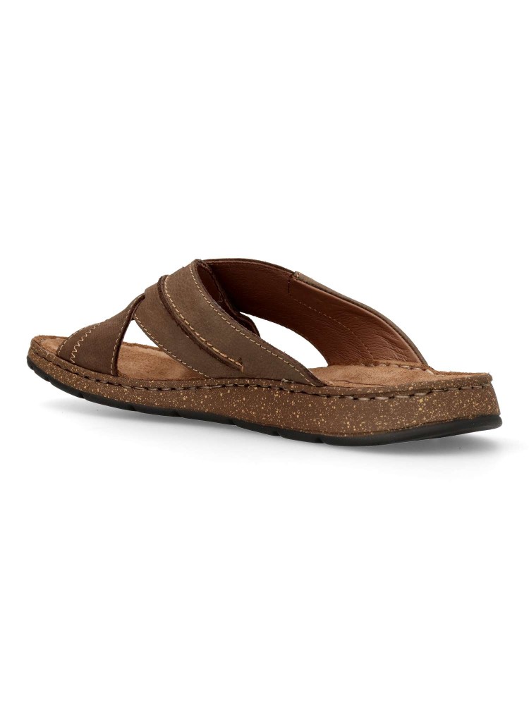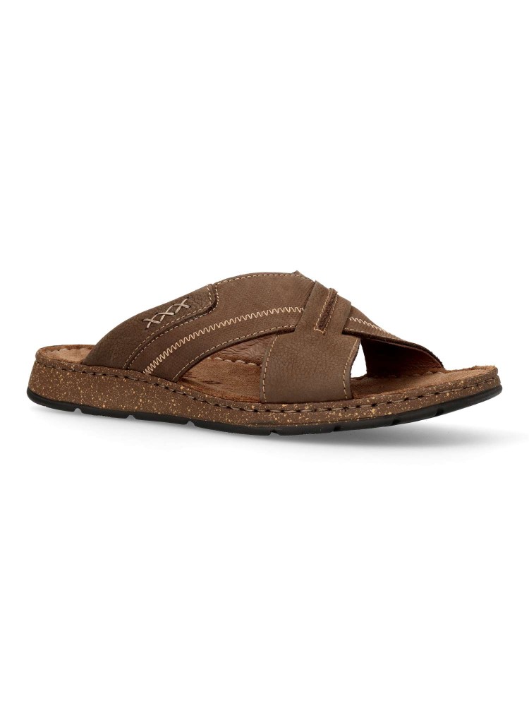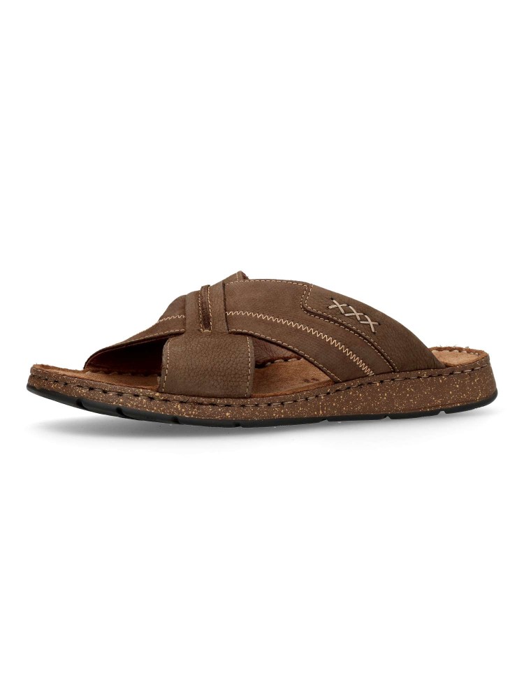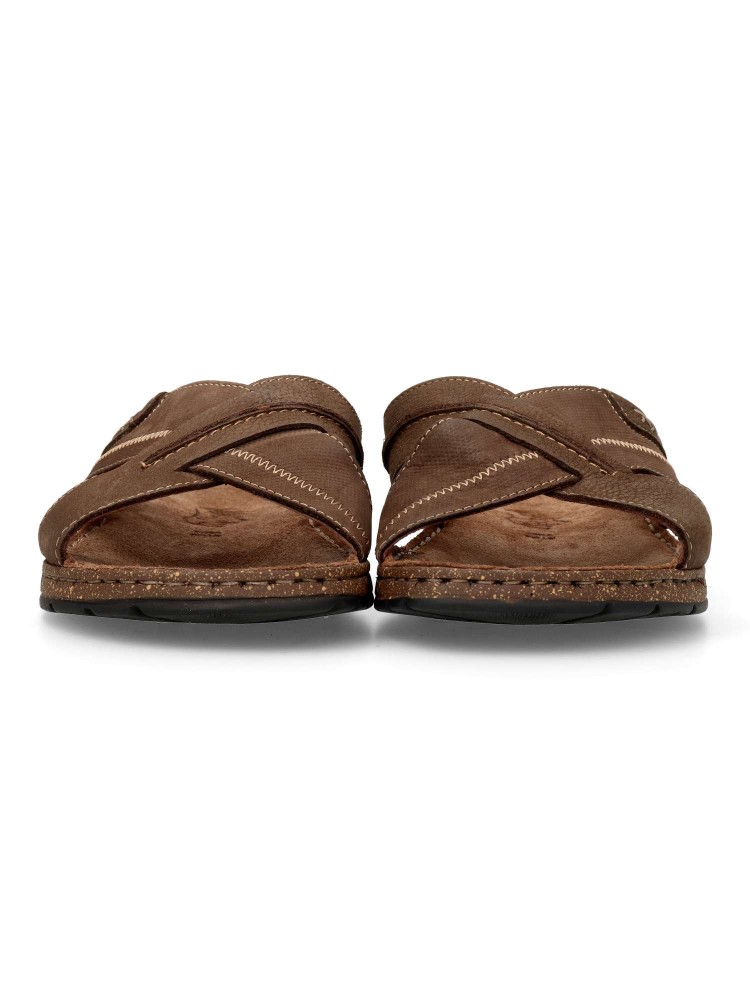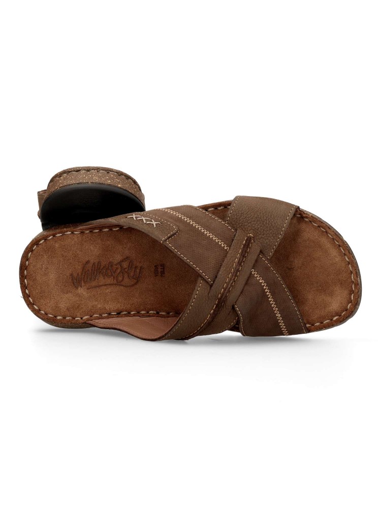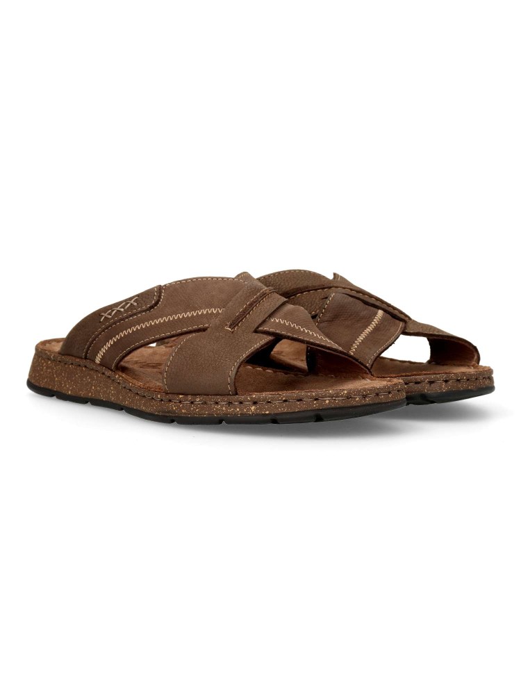 Sandalia cómoda de hombre fabricada en piel de primera calidad, con suela de goma termoplástica. Modelo con pala de tiras cruzadas. Planta de piel acolchada. Color chocolate. Sandalias de verano, para ofrecer comodidad y frescura al caminar.