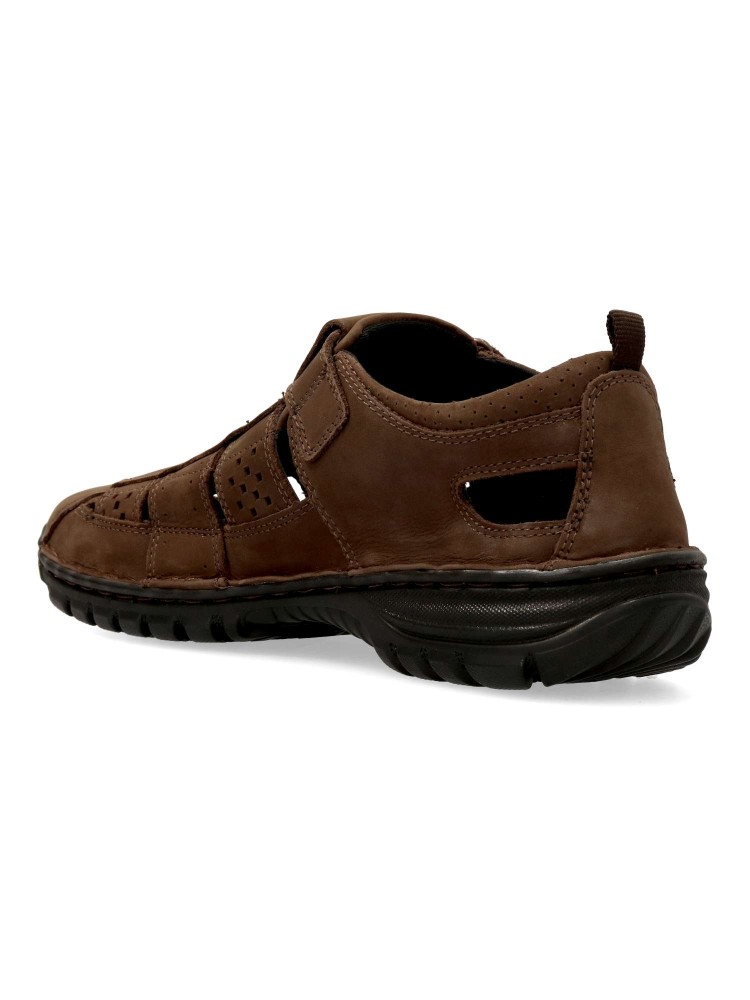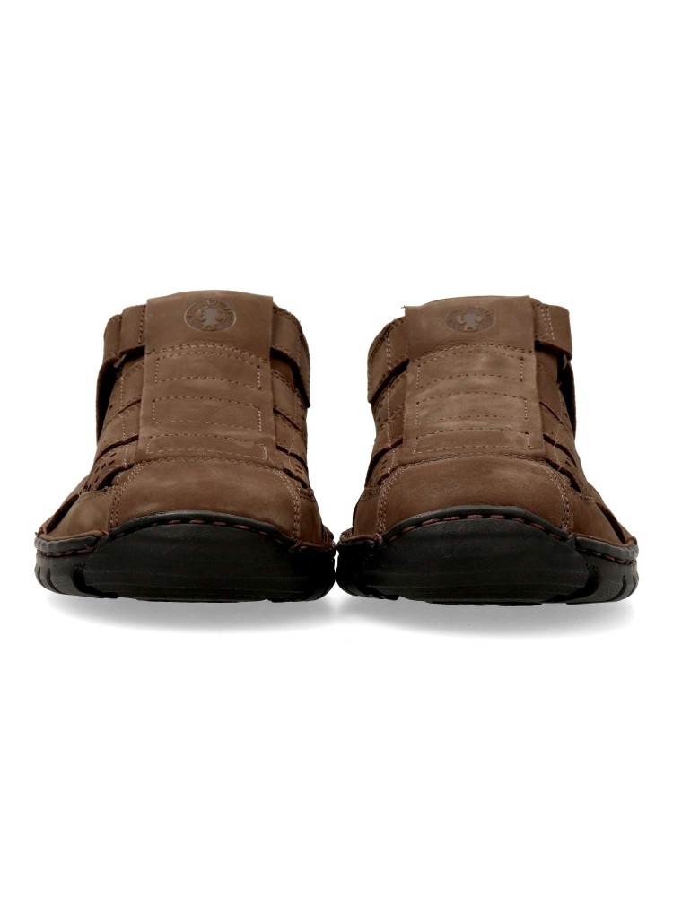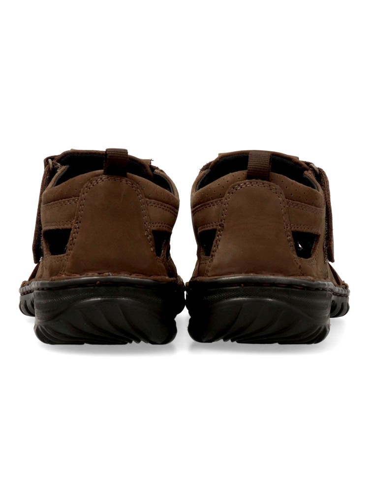 Sandalia cerrada de hombre, estilo casual. Cierre adherente. Fabricada en piel de primera calidad, con suela de goma flexible. Plantilla extraíble de piel. Color marrón. Ideal para disfrutar de tus paseos en verano de una forma cómoda y con estilo.