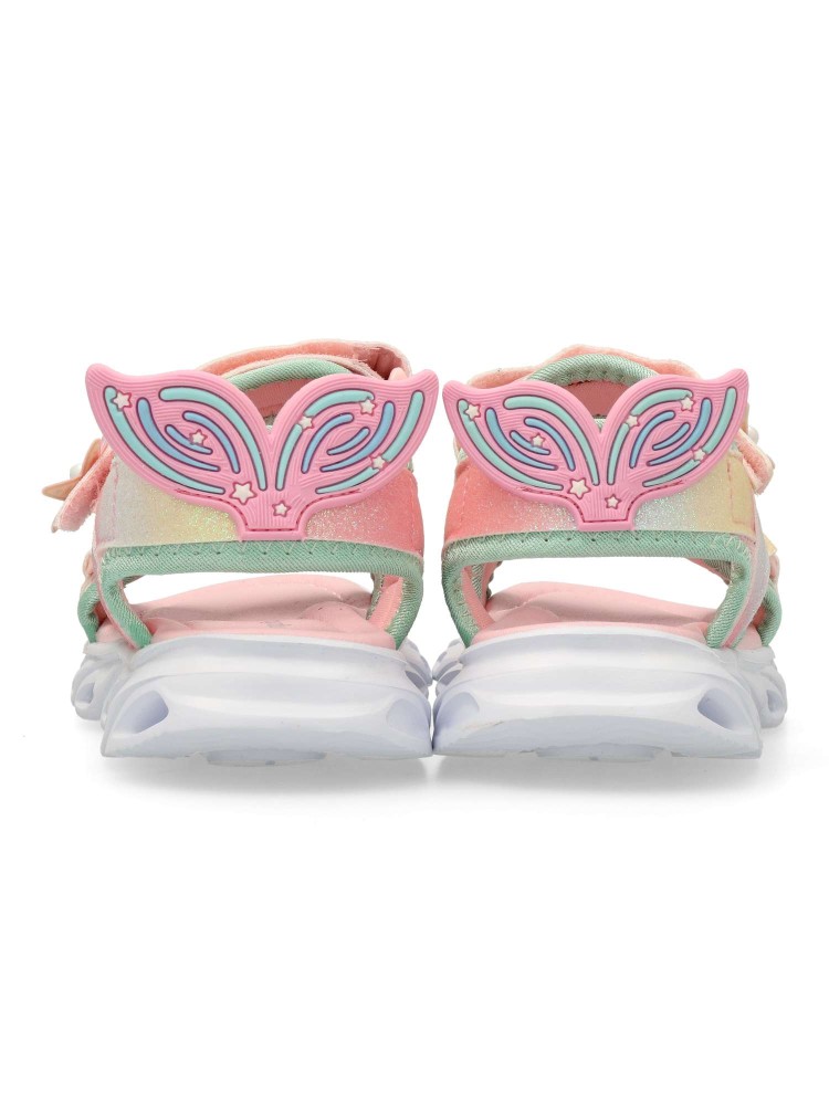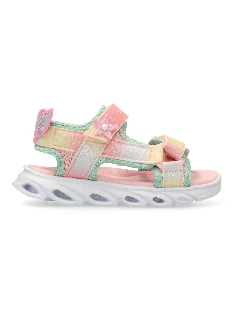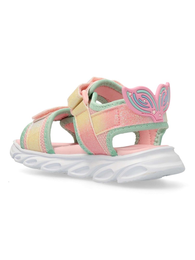 Sandalia de niña estilo casual. Cierre de tiras adherentes. Fabricadas en piel sintética glitter. Diseñadas para brindar sujeción y frescura. Su suela flexible y ligera proporciona un pisado seguro y cómodo, ideal para jugar sin parar. Luces en la suela.