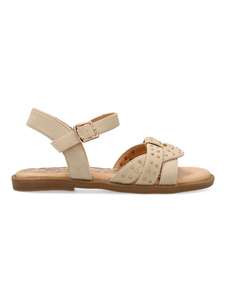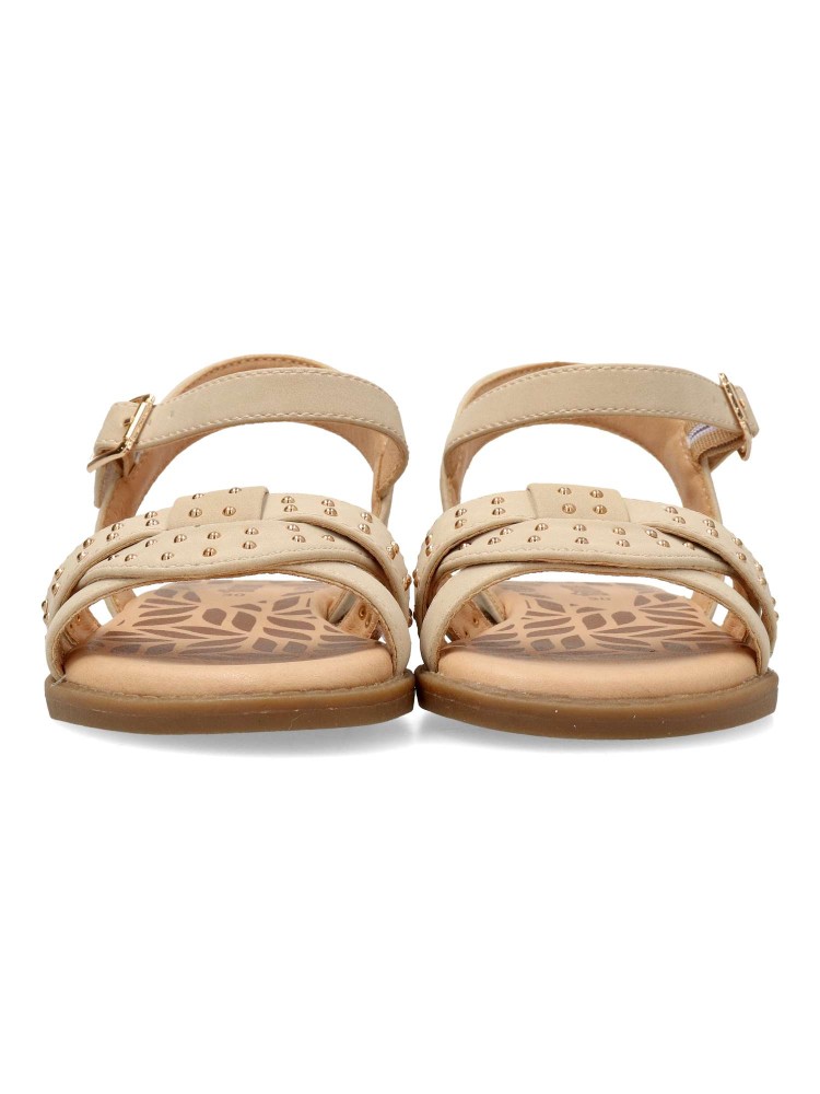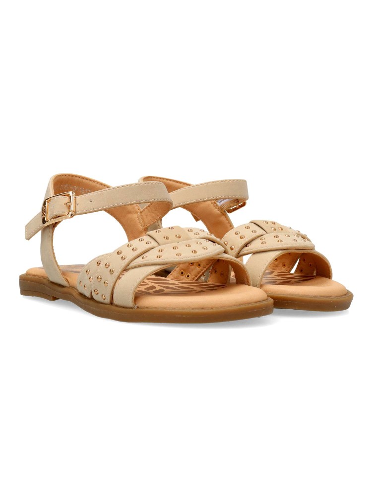 Sandalias planas para niña Mustang, modelo Maria. Diseñada con tiras cruzadas decoradas con pequeñas tachuelas que aportan un toque moderno y divertido. Cierre de hebilla al tobillo. Versátil y fresco para combinar con looks veraniegos. Certificado vegano