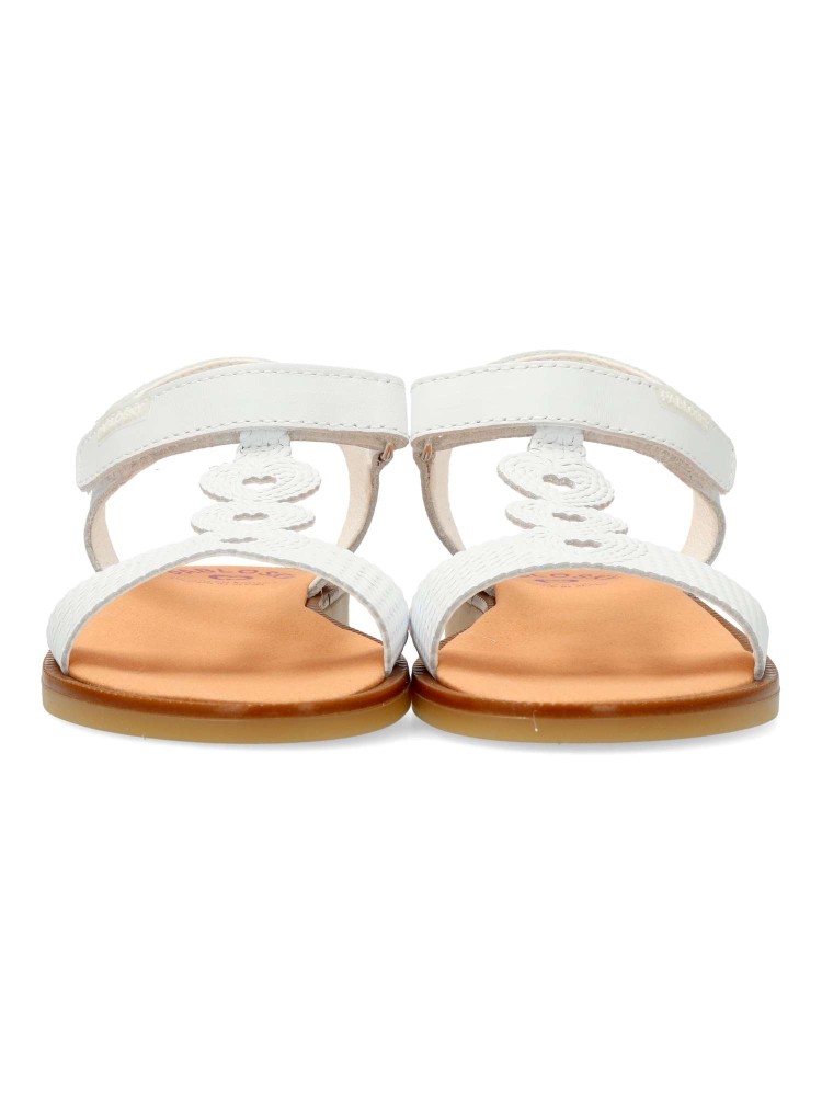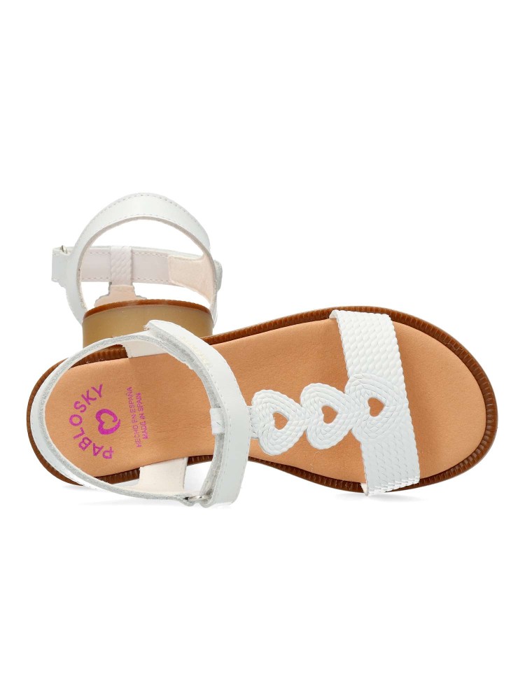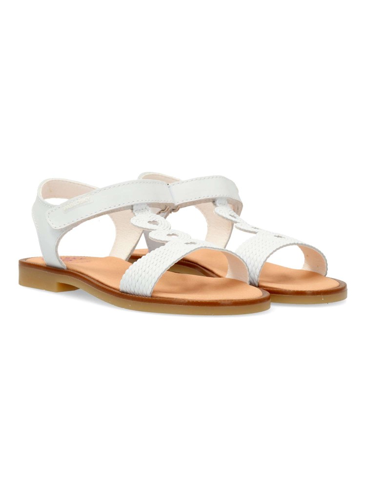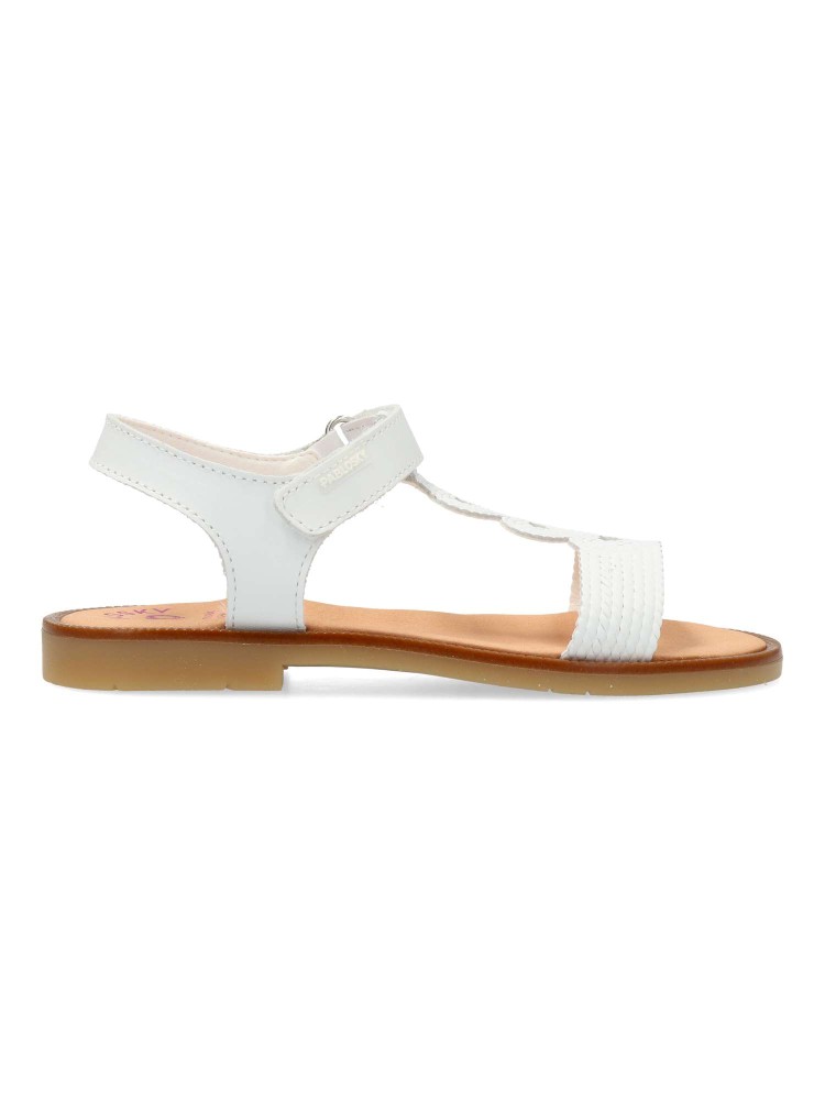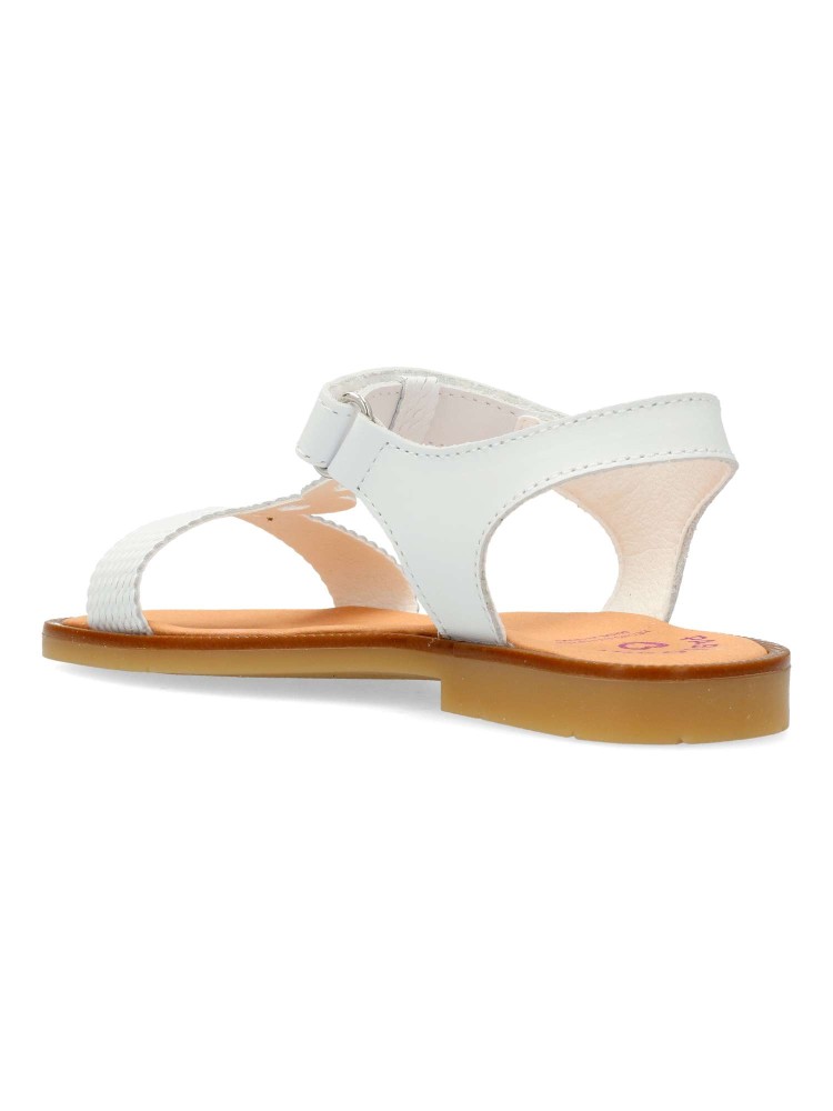 Sandalia de niña con cierre adherente. Color blanco. Comodidad, durabilidad y versatilidad. Fabricado en piel grabada de primera calidad. Plantilla amortiguadora superabsorbente y antibacterias. Piso de goma flexible y antideslizante. Hecho en España.