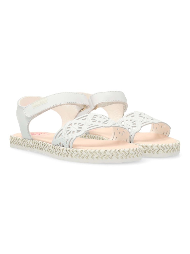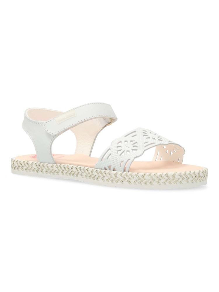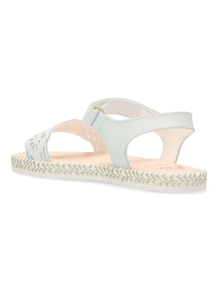 Sandalia de niña con cierre adherente. Color blanco. Comodidad, durabilidad y versatilidad. Fabricado en piel troquelada de primera calidad. Plantilla amortiguadora superabsorbente y antibacterias. Piso de goma flexible y antideslizante. Hecho en España.