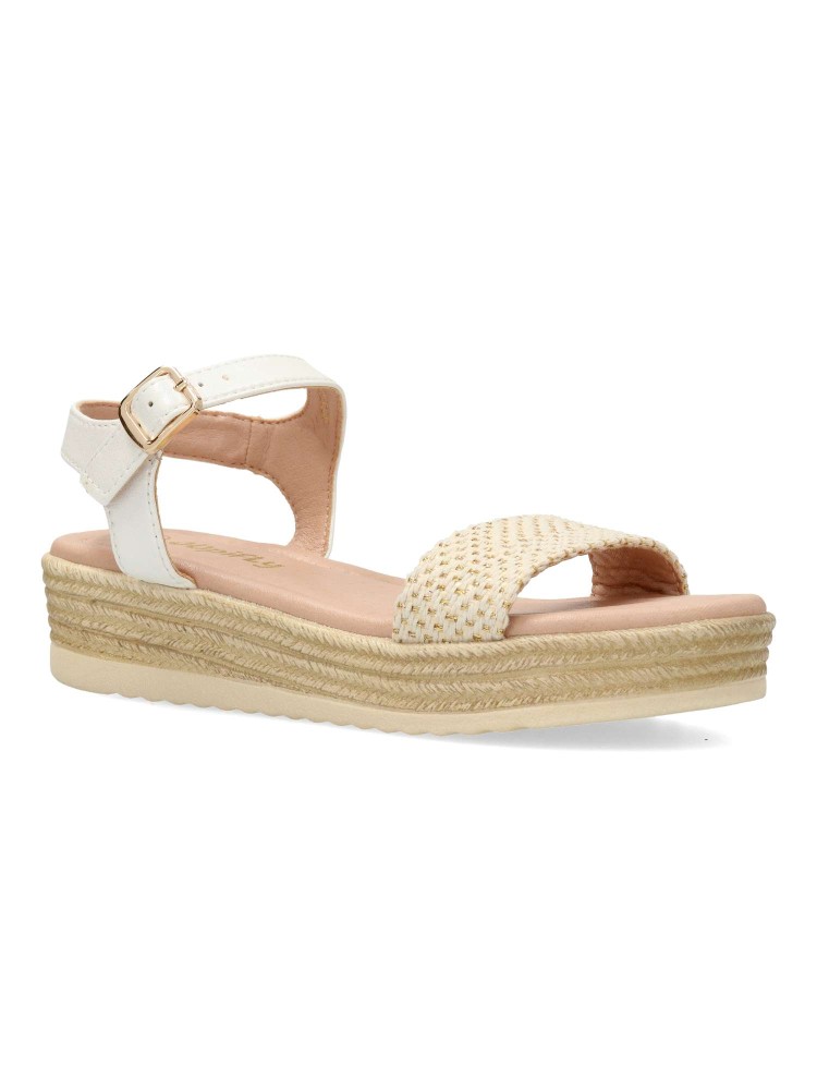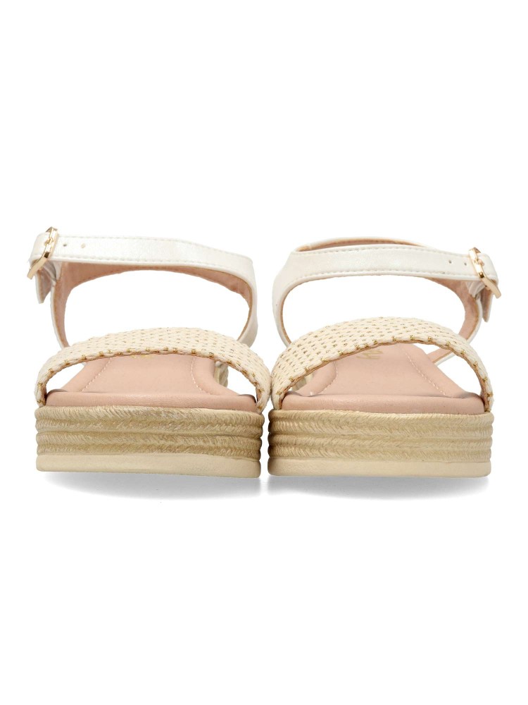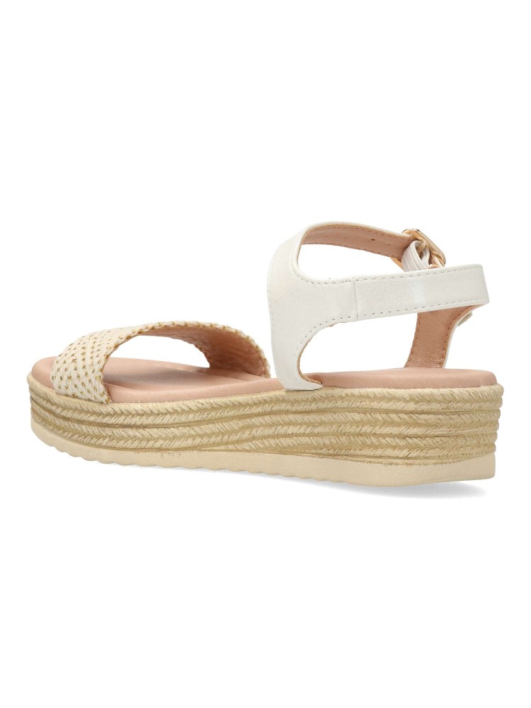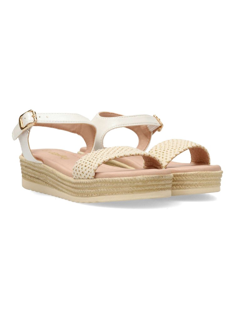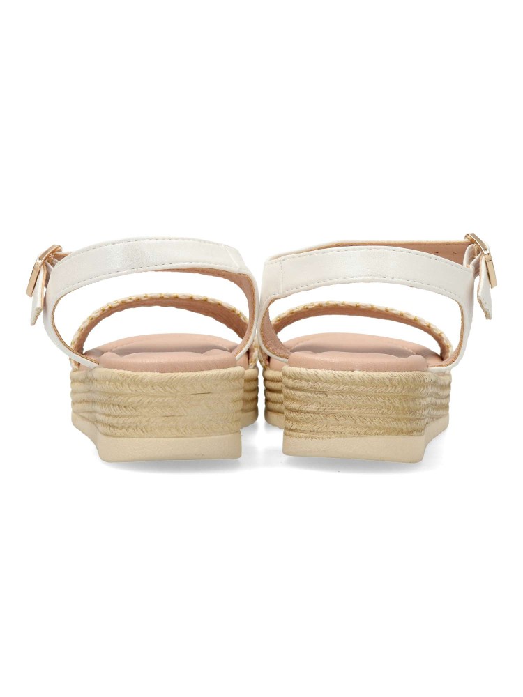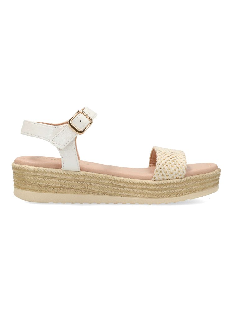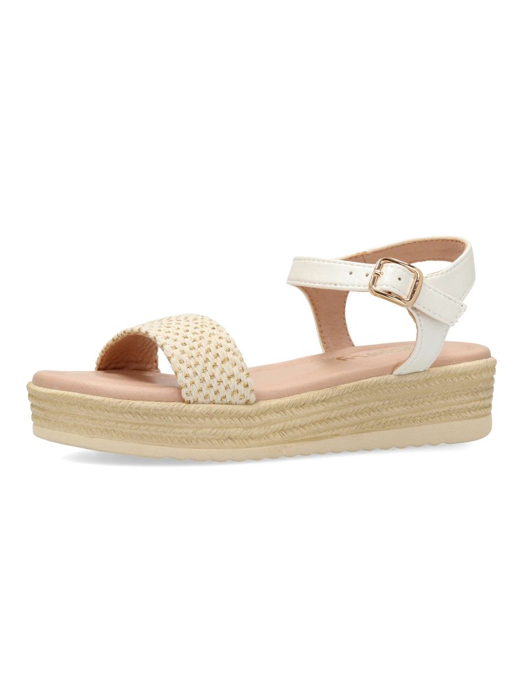 Sandalia alpargata de niña, con cierre de hebilla al tobillo. Fabricada en piel sintética y textil, con suela de goma y plataforma efecto yute. Planta acolchada. Altura 3,5 cm. Color blanco-oro. Diseño y confort, ideal con faldas y conjuntos de verano.