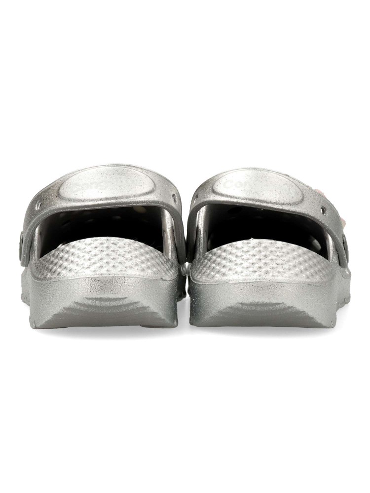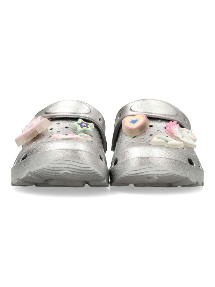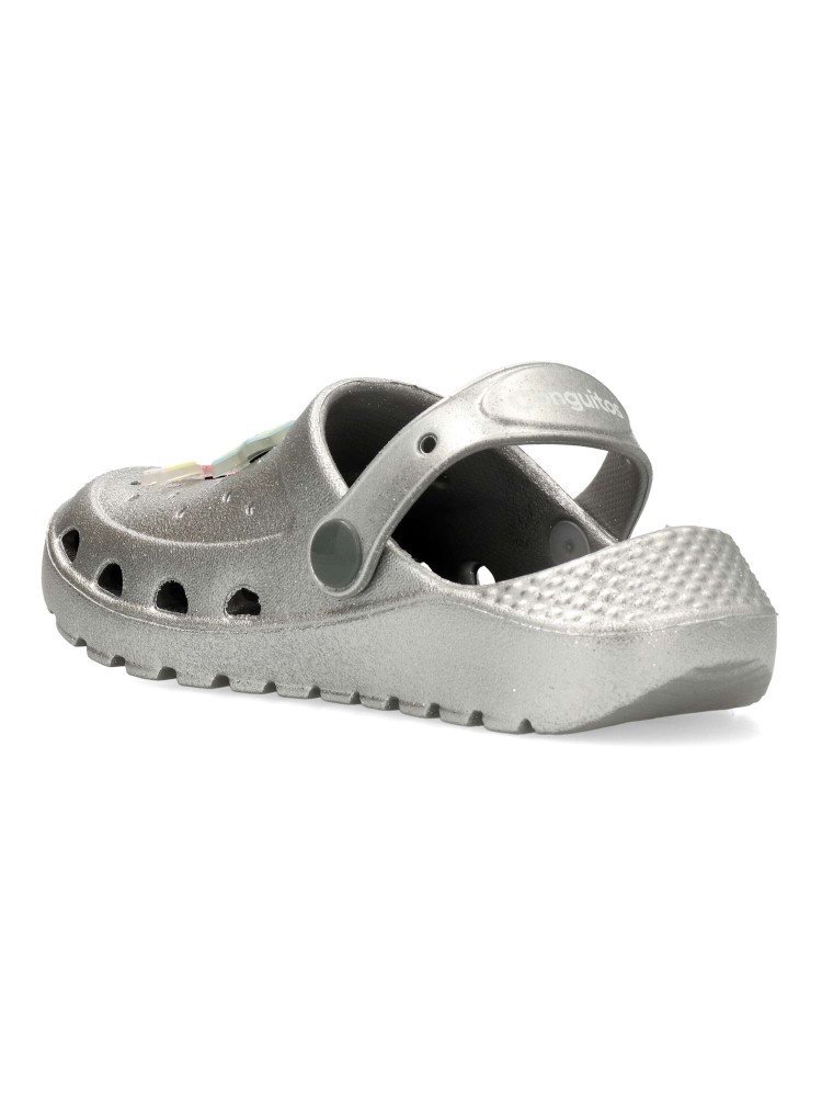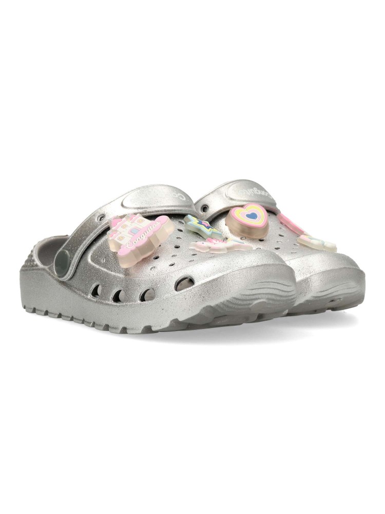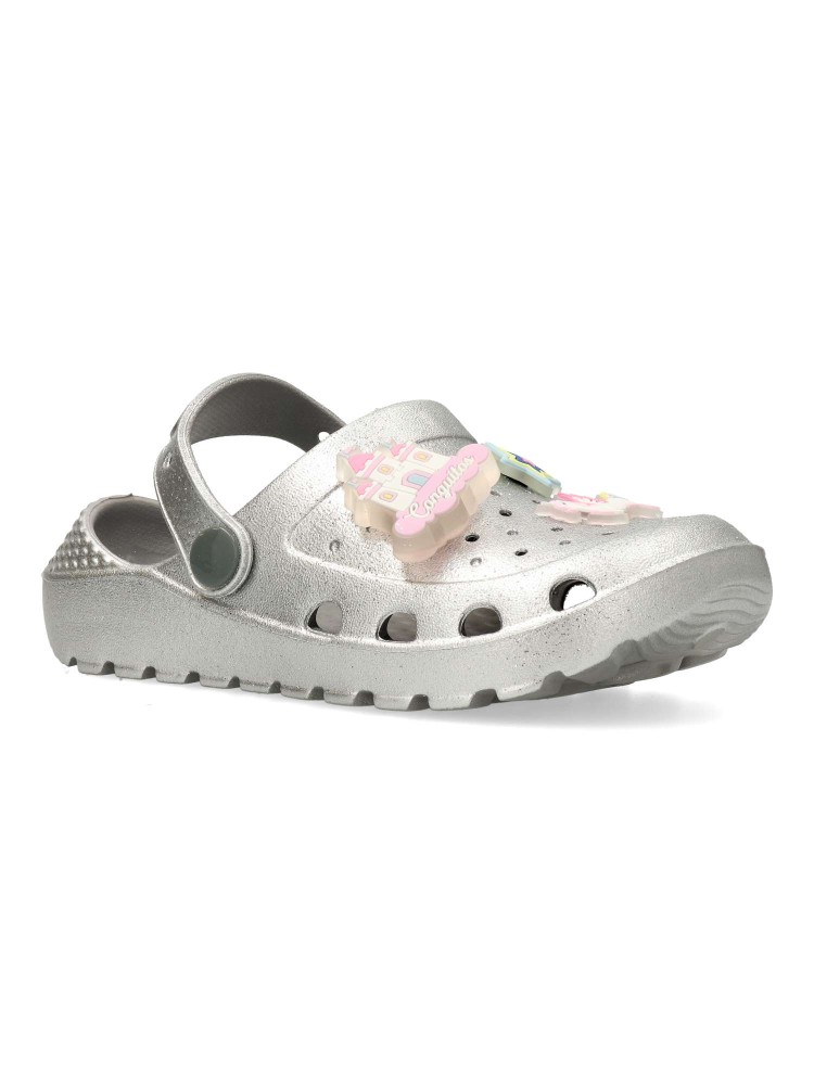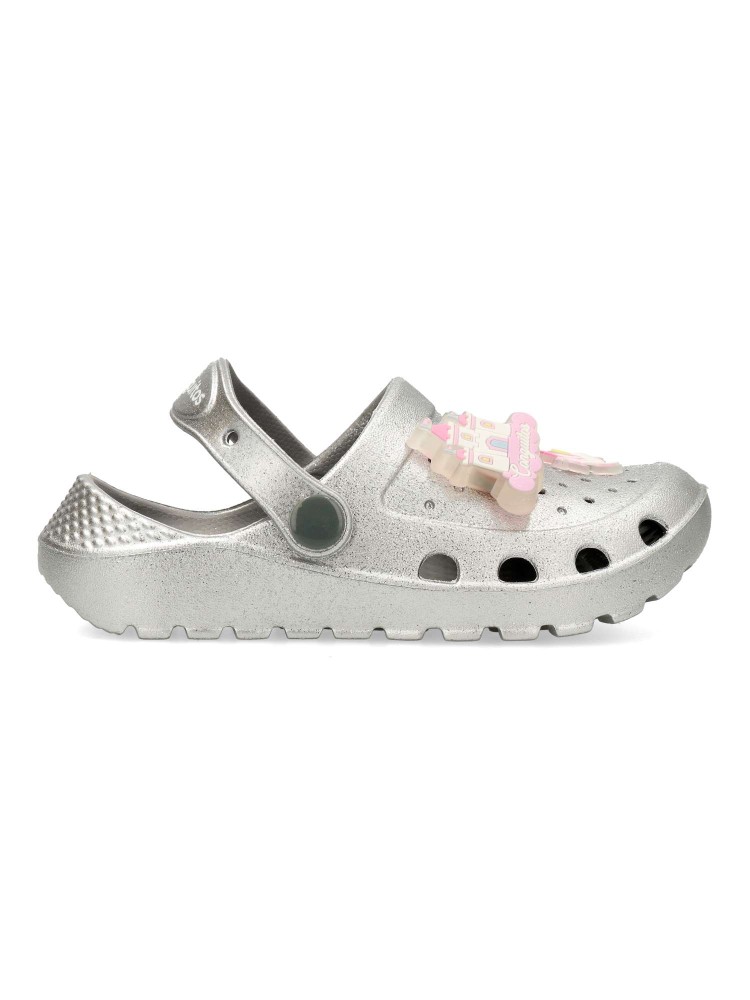 Zuecos luminosos plateados para niña, diseñados para el uso diario con una construcción ligera y flexible. La correa trasera abatible ayuda a mantener el pie más sujeto. El detalle luminoso con adorno inspirado en un castillo aporta un acabado llamativo.