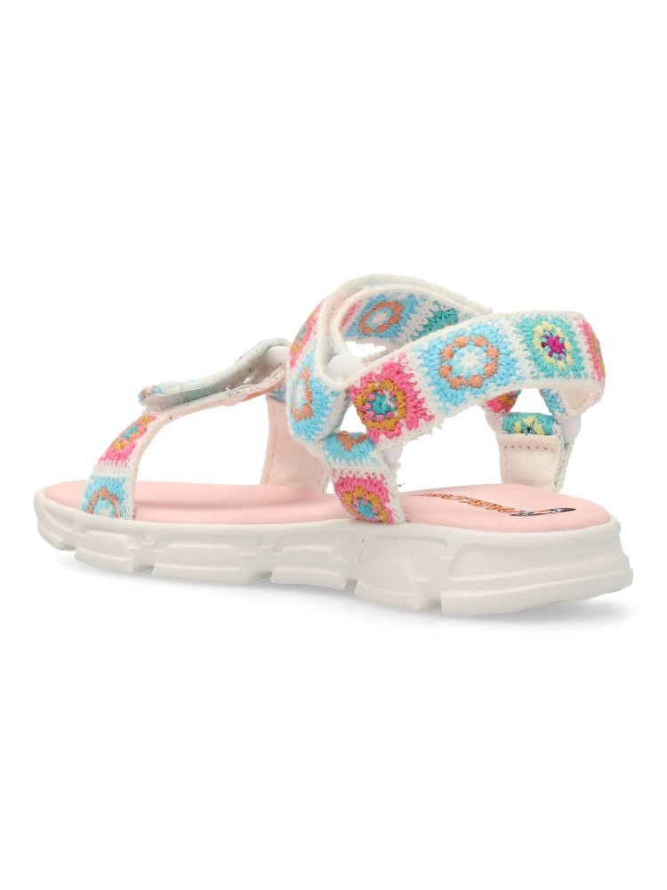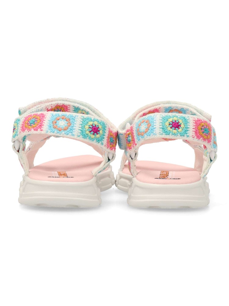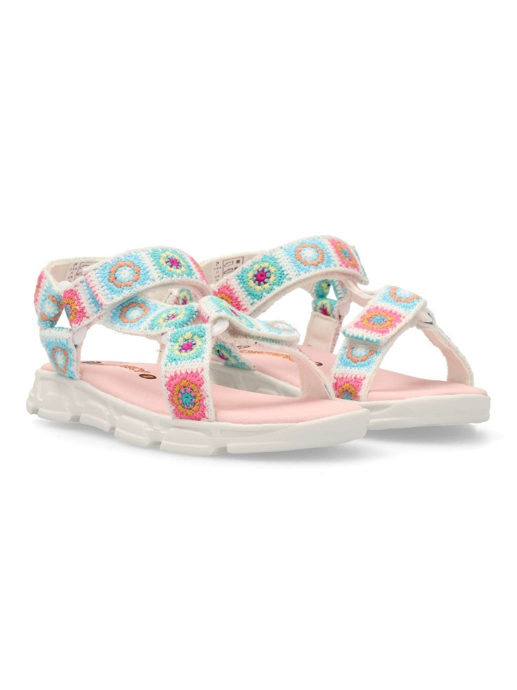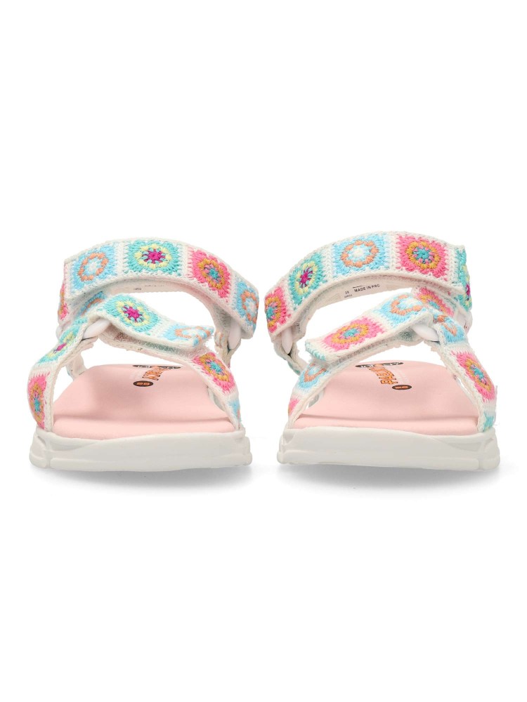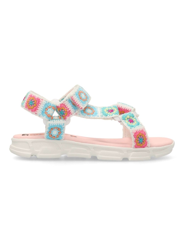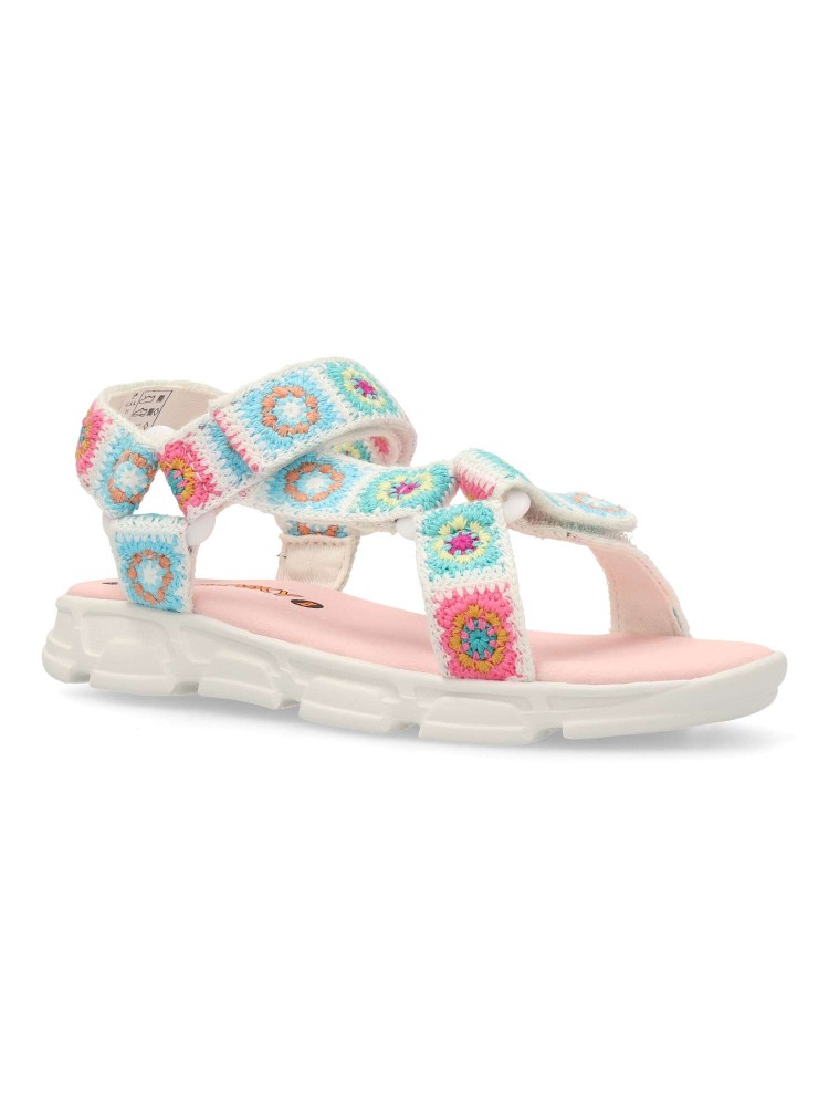 Sandalia de niña con cierre adherente. Color blanco. Comodidad, durabilidad y versatilidad. Californiana con tiras textil crochet. Planta intech amortiguadora superabsorbente y antibacterias. Piso de goma flexible y antideslizante. Hecho en España.