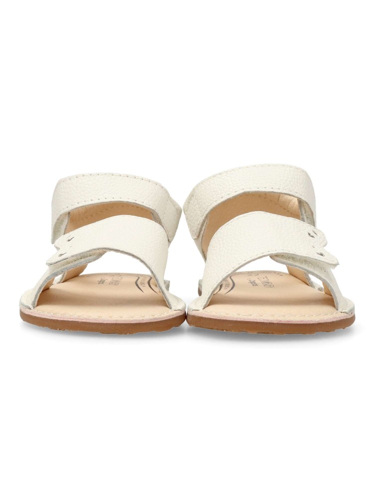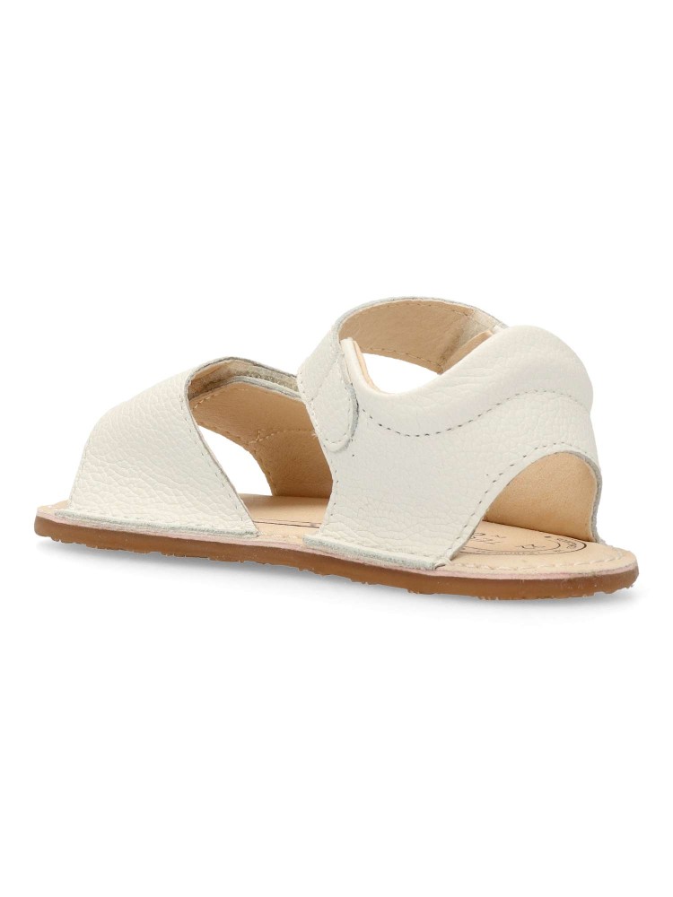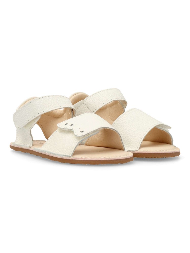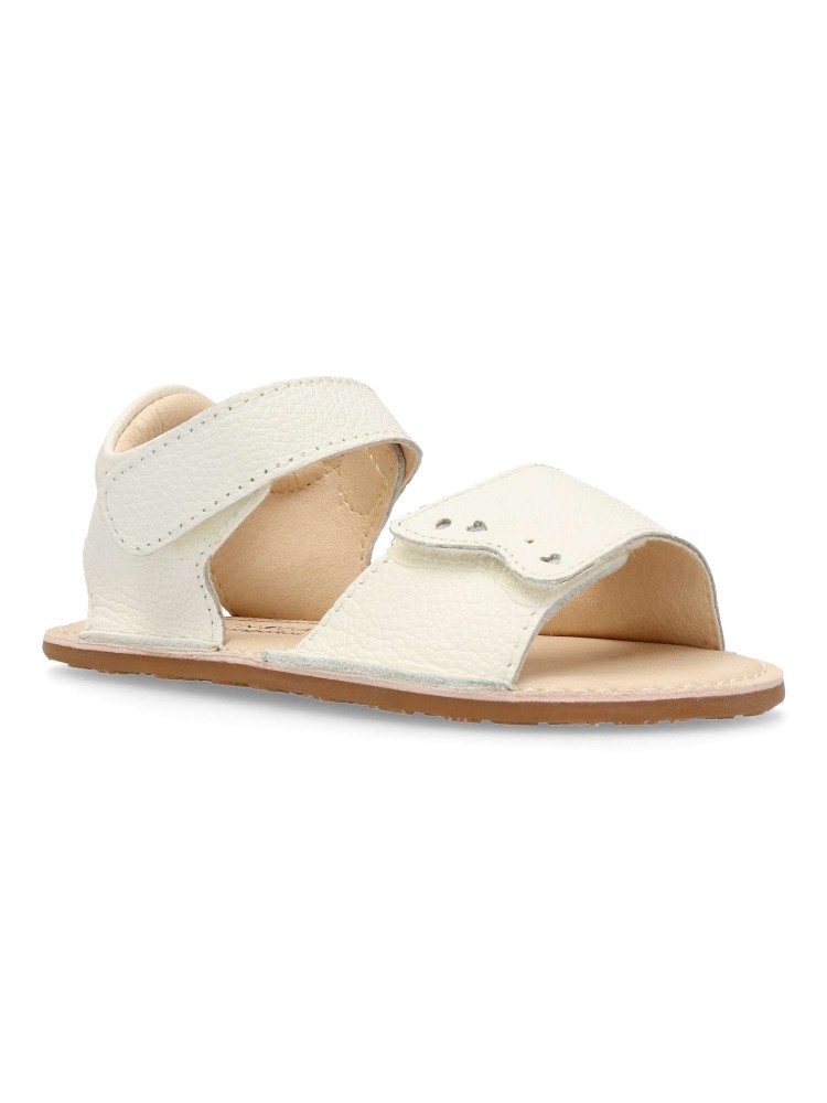 Sandalias barefoot blancas para bebé, confeccionadas en suave piel napa 100 %, con delicados detalles troquelados en forma de corazón. Doble cierre de tira adherente. Diseño barefoot (zero drop y puntera ancha) que respeta el desarrollo natural del pie.