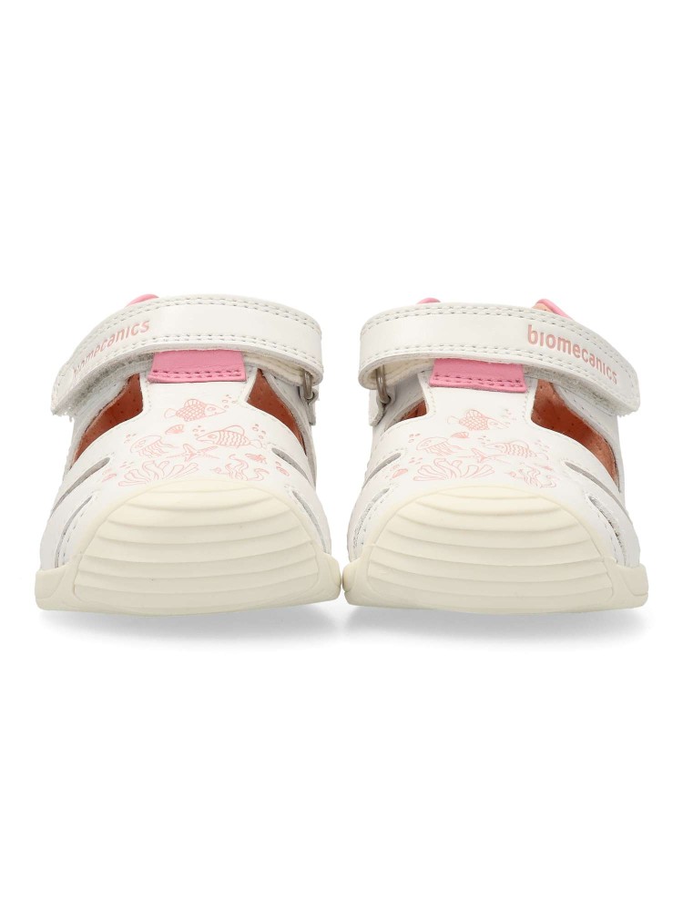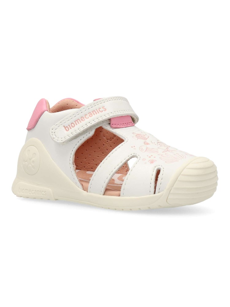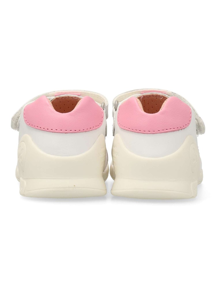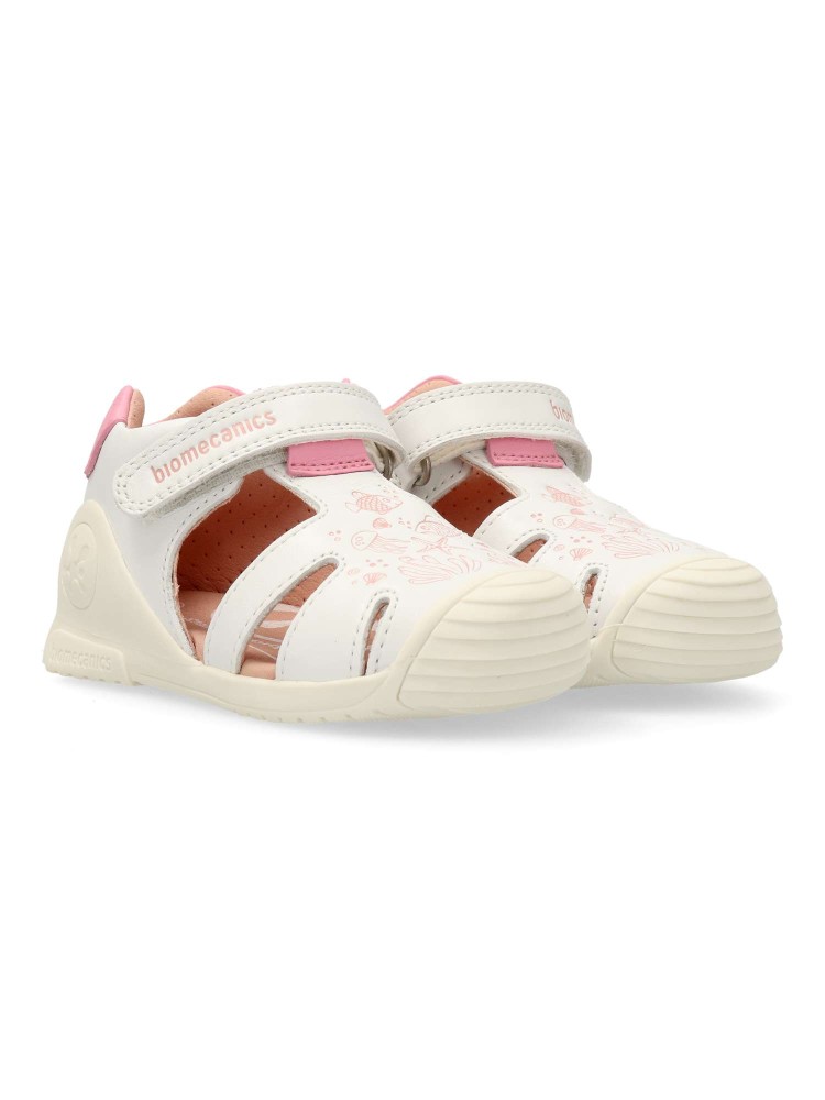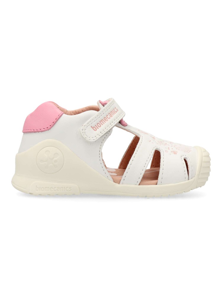 Sandalia cómoda piel para bebe/niña. Color blanco-rosa. Cierre adherente. Puntera y talón reforzados. Dibujo intantil estampado. Biogateo: Máxima estabilidad. Un calzado creado para que los primeros pasos de nuestros hijos sean cómodos y estables.