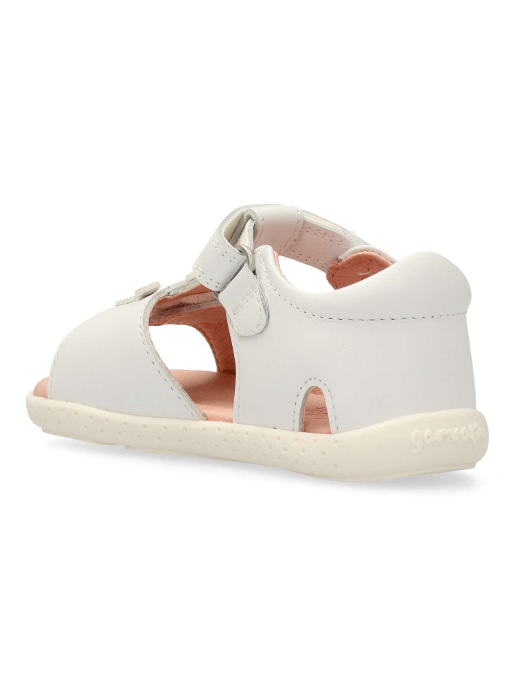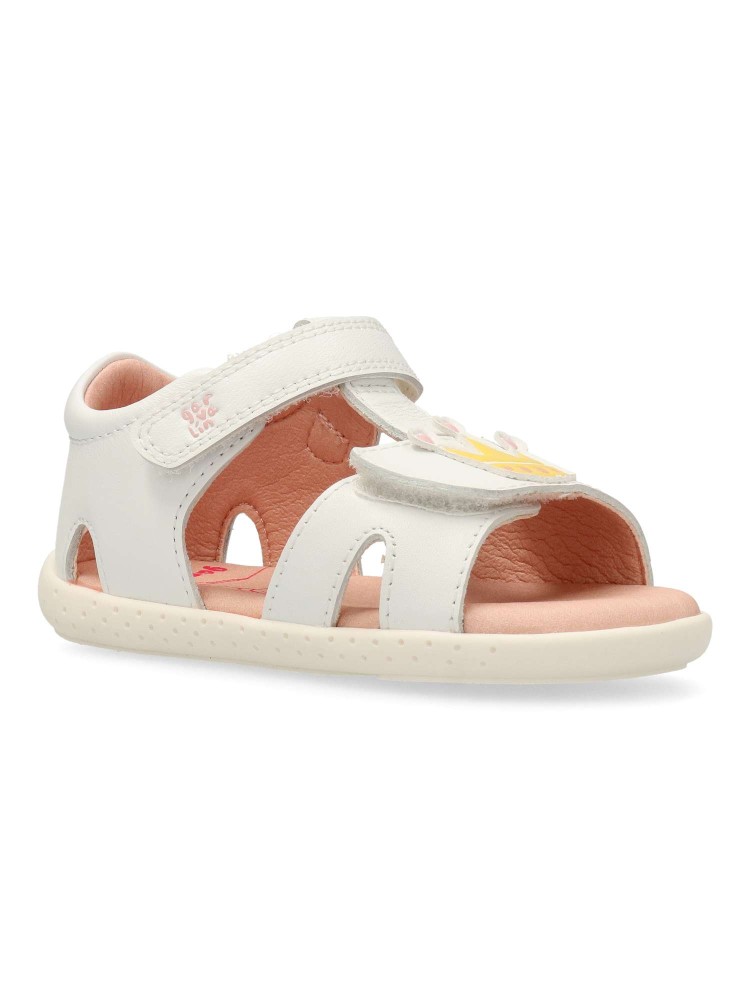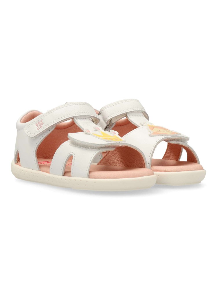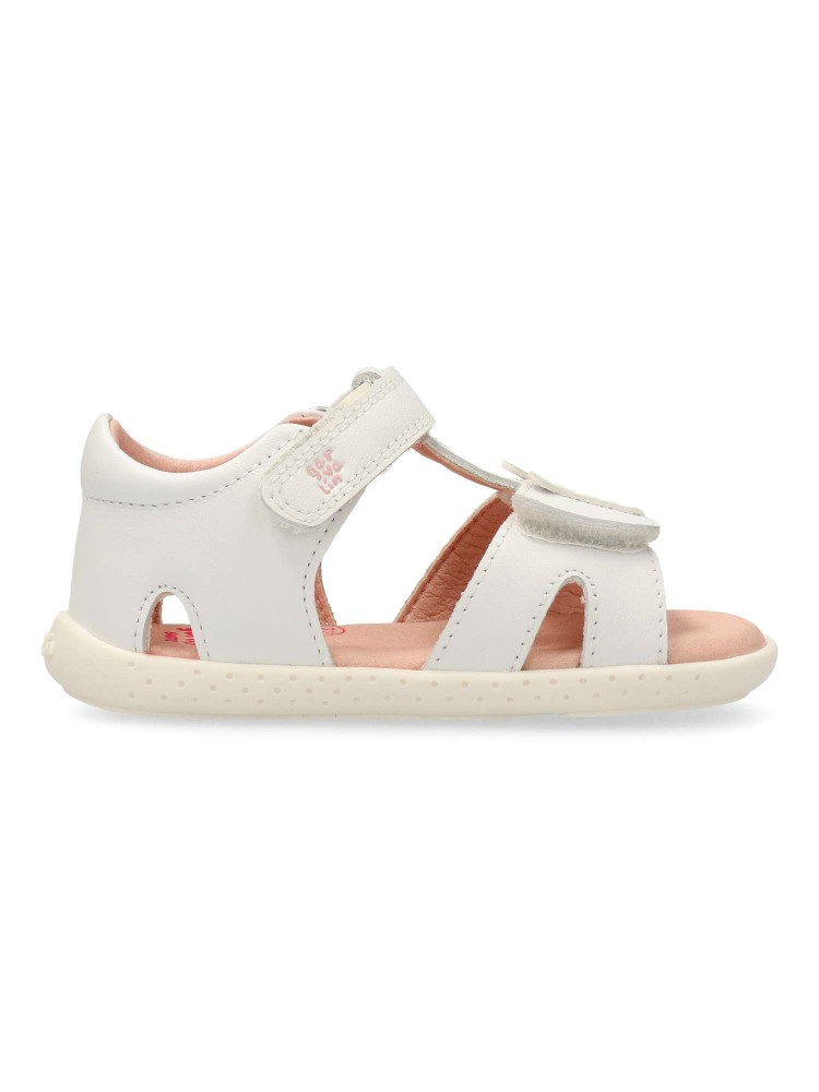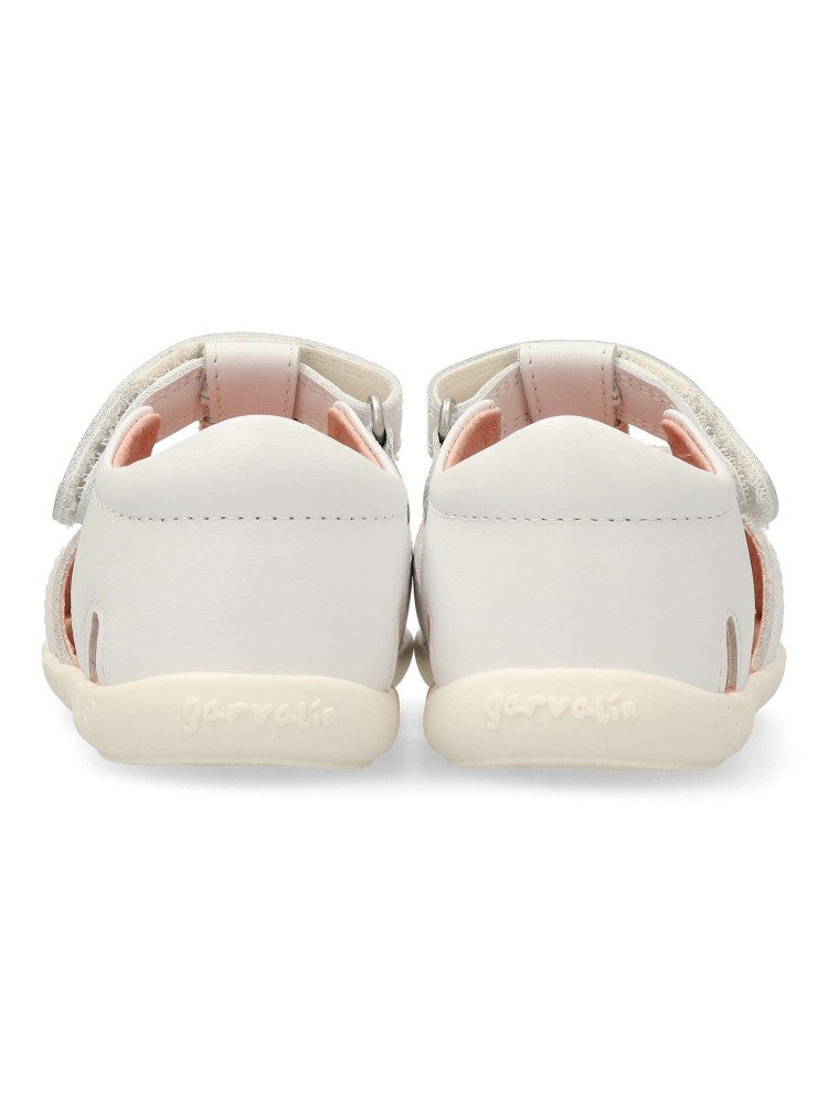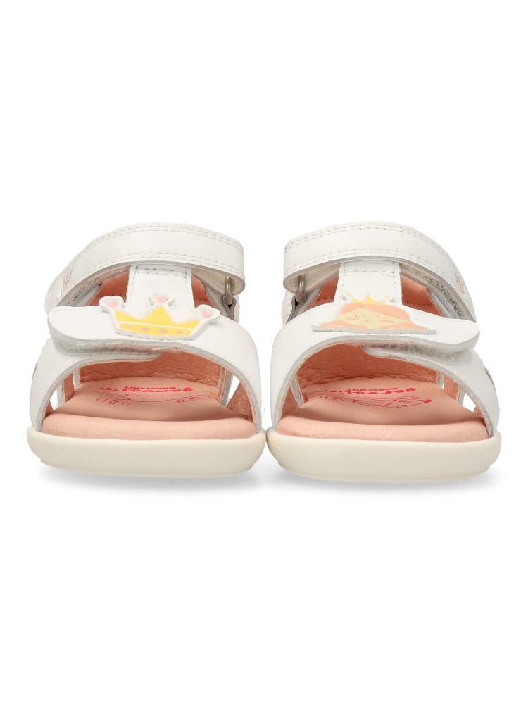 Sandalia cómoda para niña. Fabricadas en piel con suela de goma. Planta acolchada. Color blanco-rosa. Cierre adherente. Modelo transpirable y flexible con plantilla de microfibras antibacterias. Cero Drop. Respetuoso con el desarrollo natural del pie.