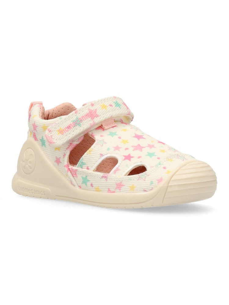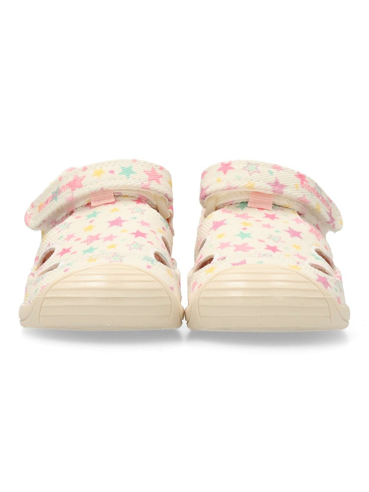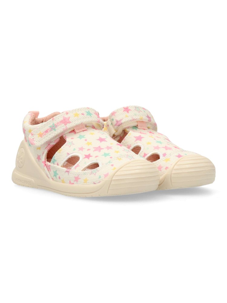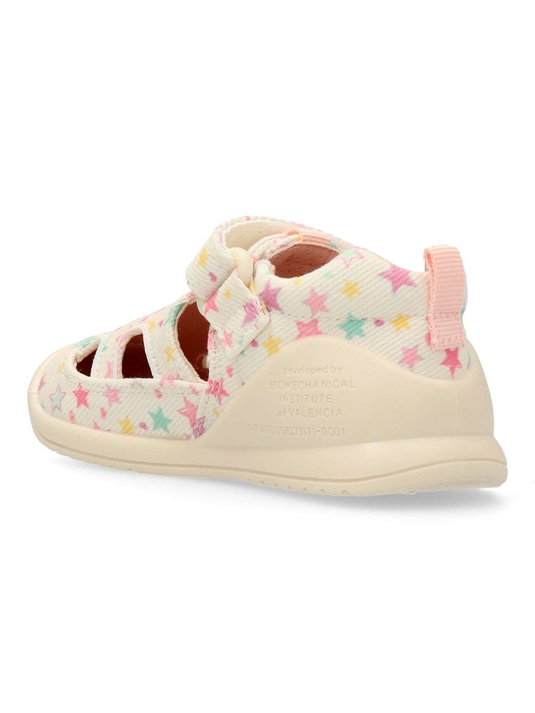 Sandalia cómoda para bebe/niña. Fabricado en textil estampado. Cierre adherente. Puntera y talón reforzados. Lavables en lavadora. Biogateo: Máxima estabilidad. Un calzado creado para que los primeros pasos de nuestros hijos sean cómodos y estables