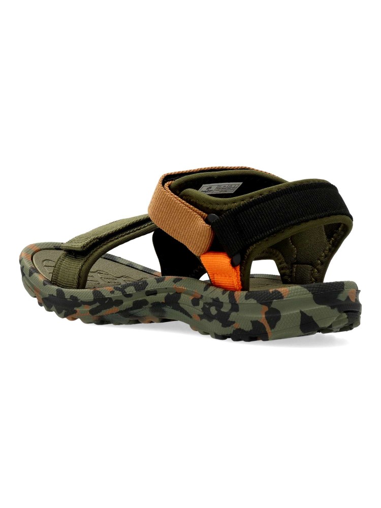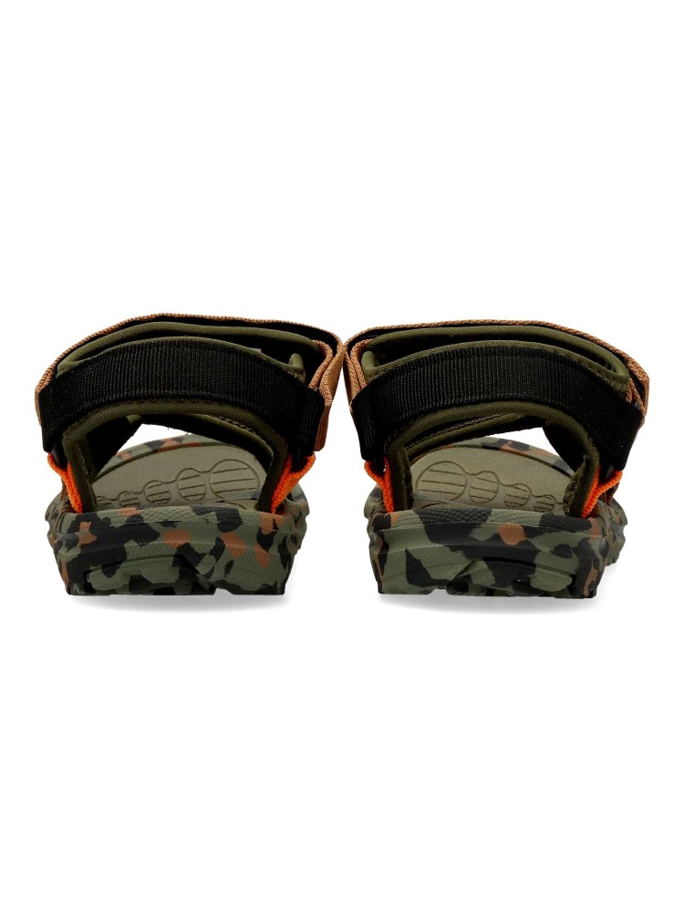 Sandalia deportiva de niño, estilo casual. Cierre adherente ajustable. Modelo cómodo, fabricado en textil color kaki, con suela de goma EVA ligera y flexible. Máximo confort en una sandalia californiana con un diseño fresco y muy original.