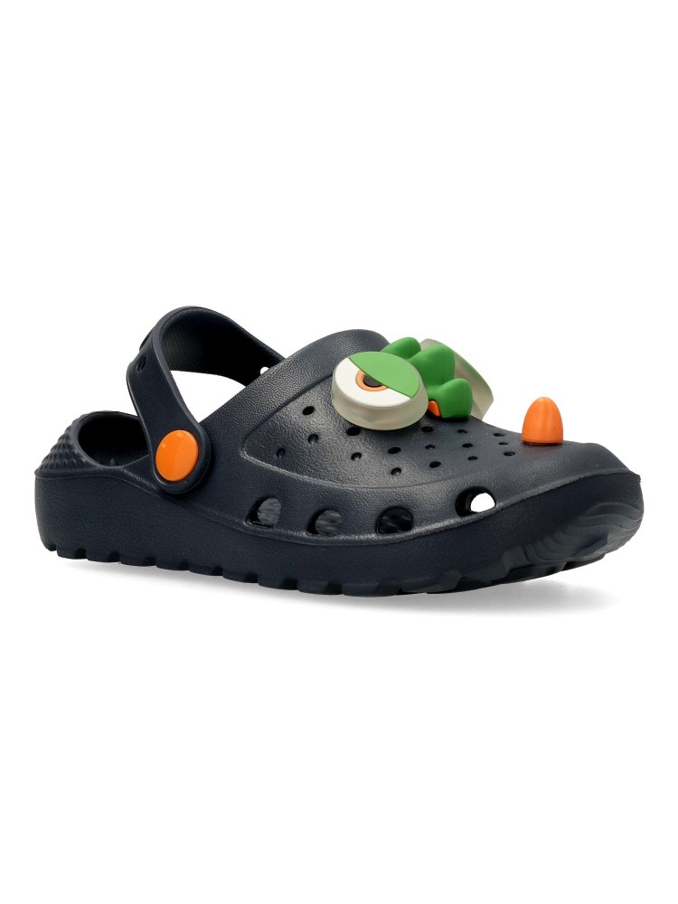Zuecos azul marino con luces para niño, diseñados para el uso diario con una construcción ligera y flexible. La correa trasera abatible ayuda a mantener el pie más sujeto. El detalle luminoso con adorno de dinosaurio aporta un acabado llamativo.