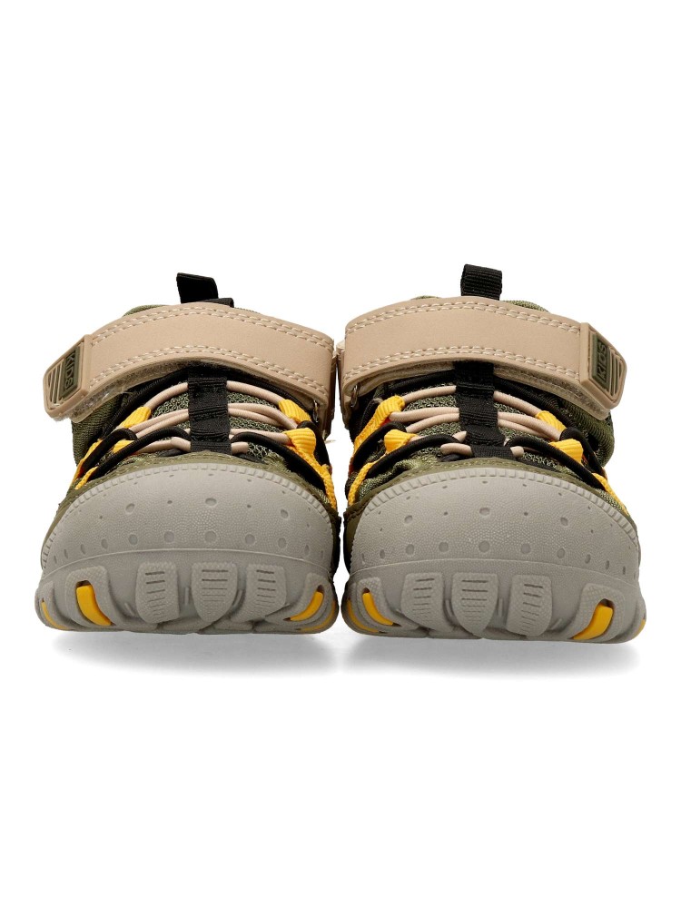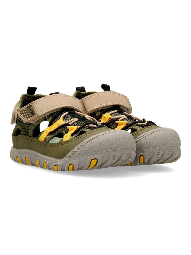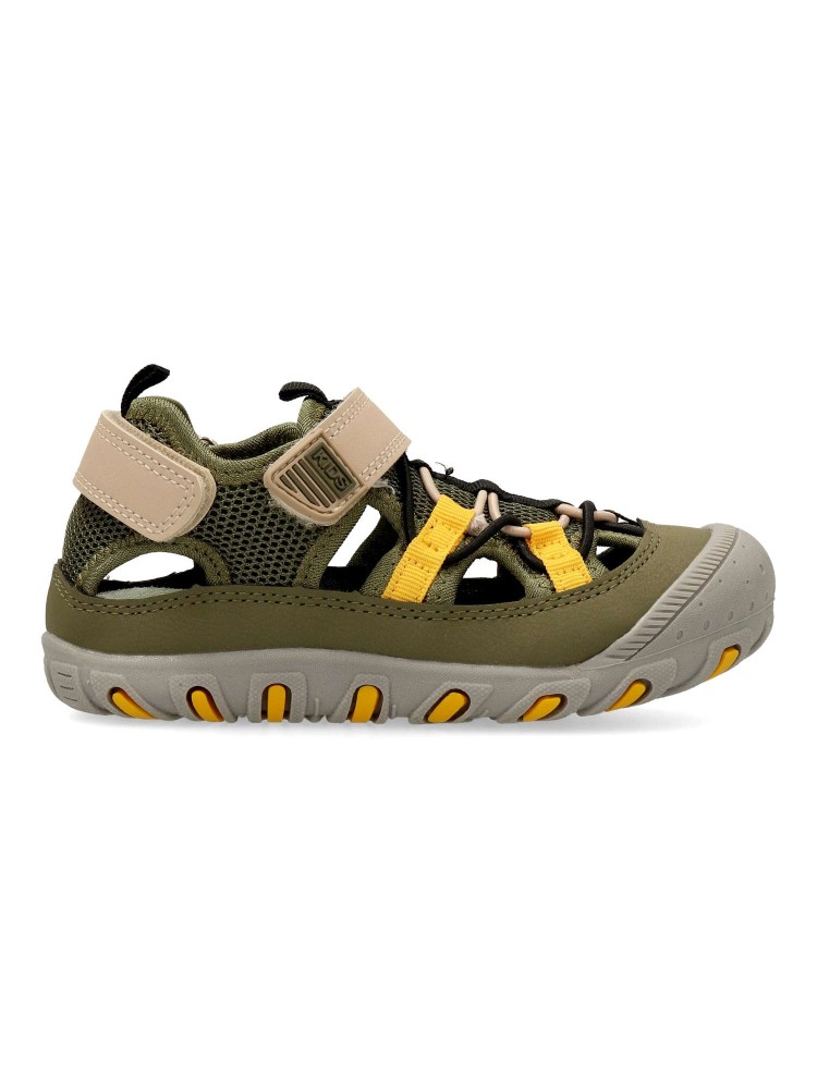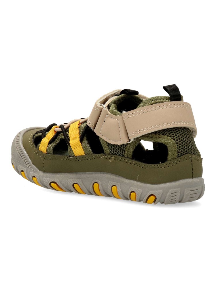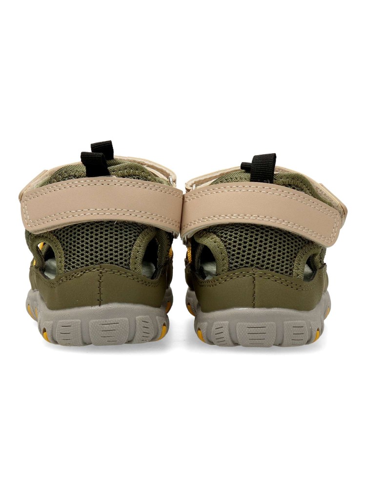 Sandalia cerrada de niño, con cierre de tira adherente. Fabricado en piel sintética y textil, con suela y puntera de goma. Planta de piel acolchada. Color kaki. Sandalias infantiles cómodas y resistentes para que los niños disfruten del verano.