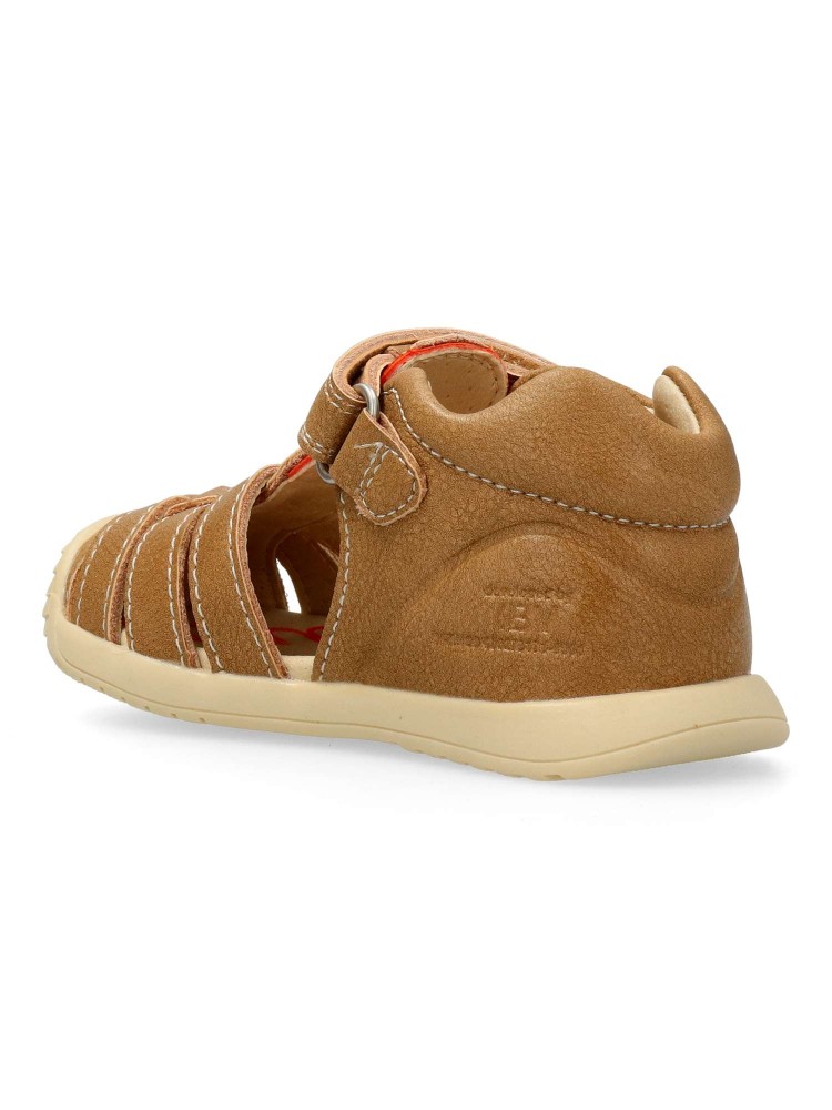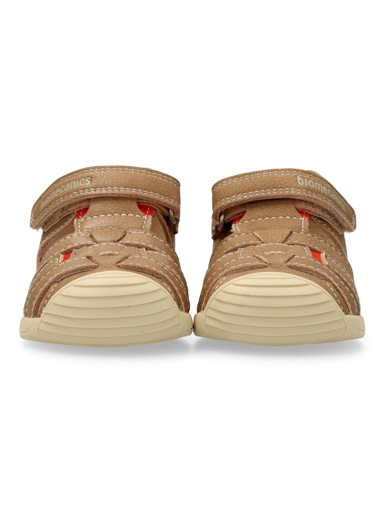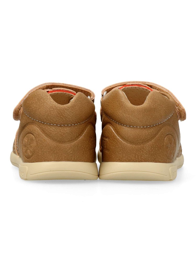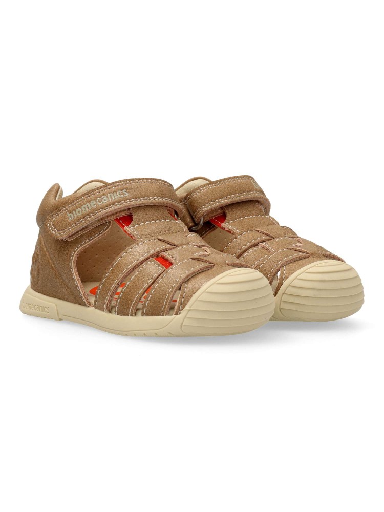 Sandalia cómoda de piel para bebe. Disponible en color natural. Cierre adherente. Puntera y talón reforzados. Biogateo: Máxima estabilidad. Un calzado creado para que los primeros pasos de nuestros hijos sean cómodos y estables. Biomecanics.