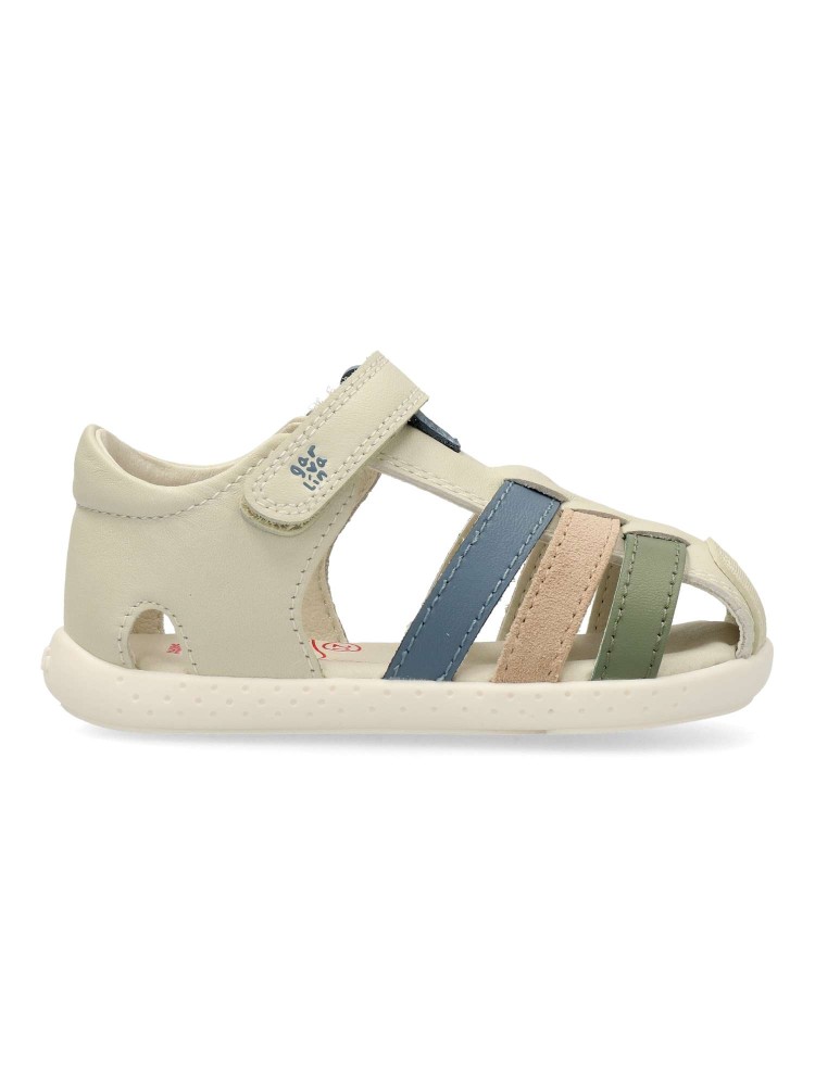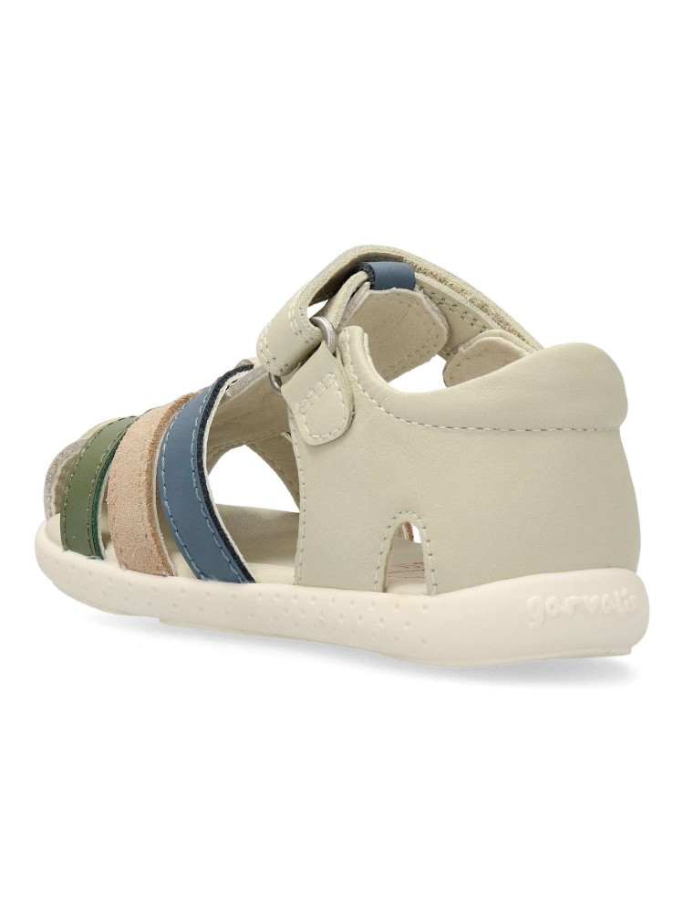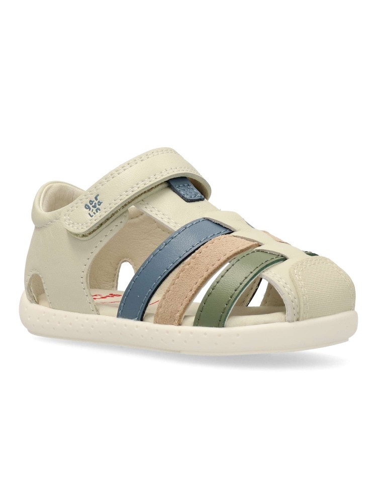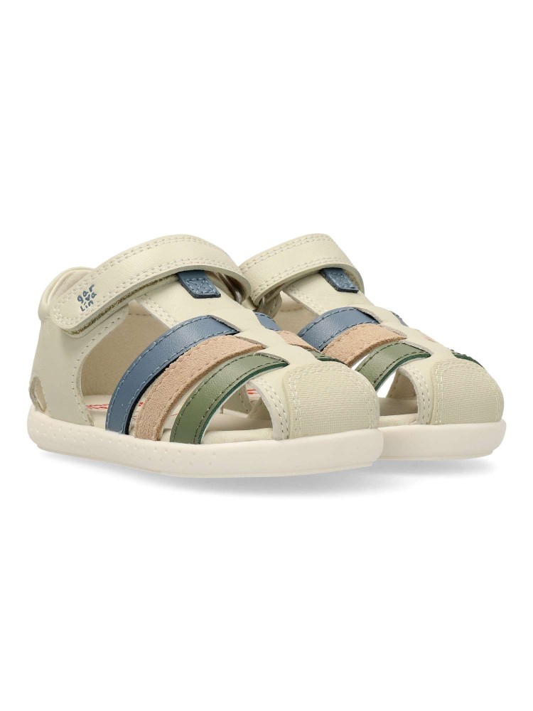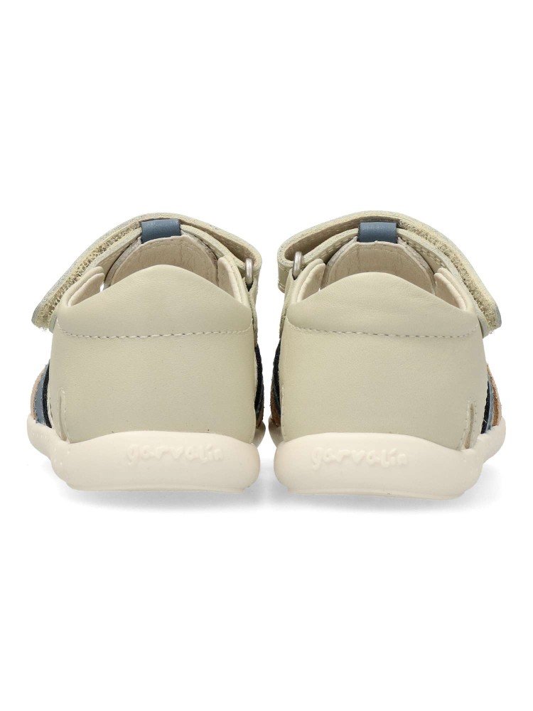 Sandalia cómoda para niño y niña. Fabricadas en piel. Planta acolchada. Color beige. Cierre adherente. Modelo transpirable y flexible con plantilla de microfibras antibacterias. Cero Drop y puntera mas amplia. Respetuoso con el desarrollo natural del pie.