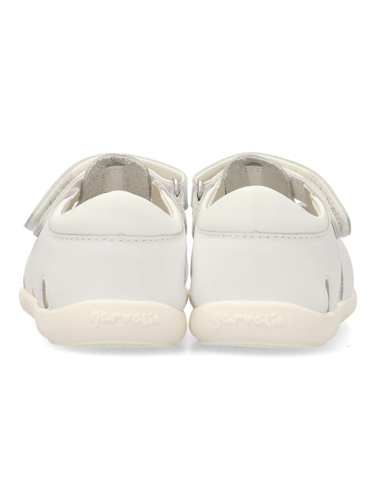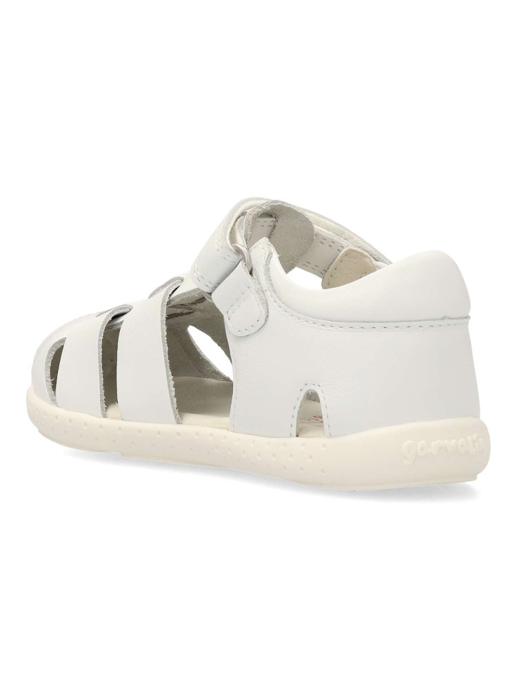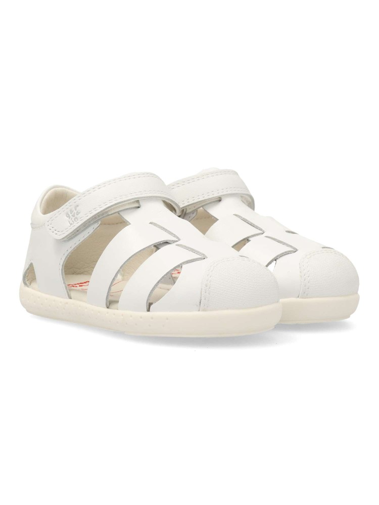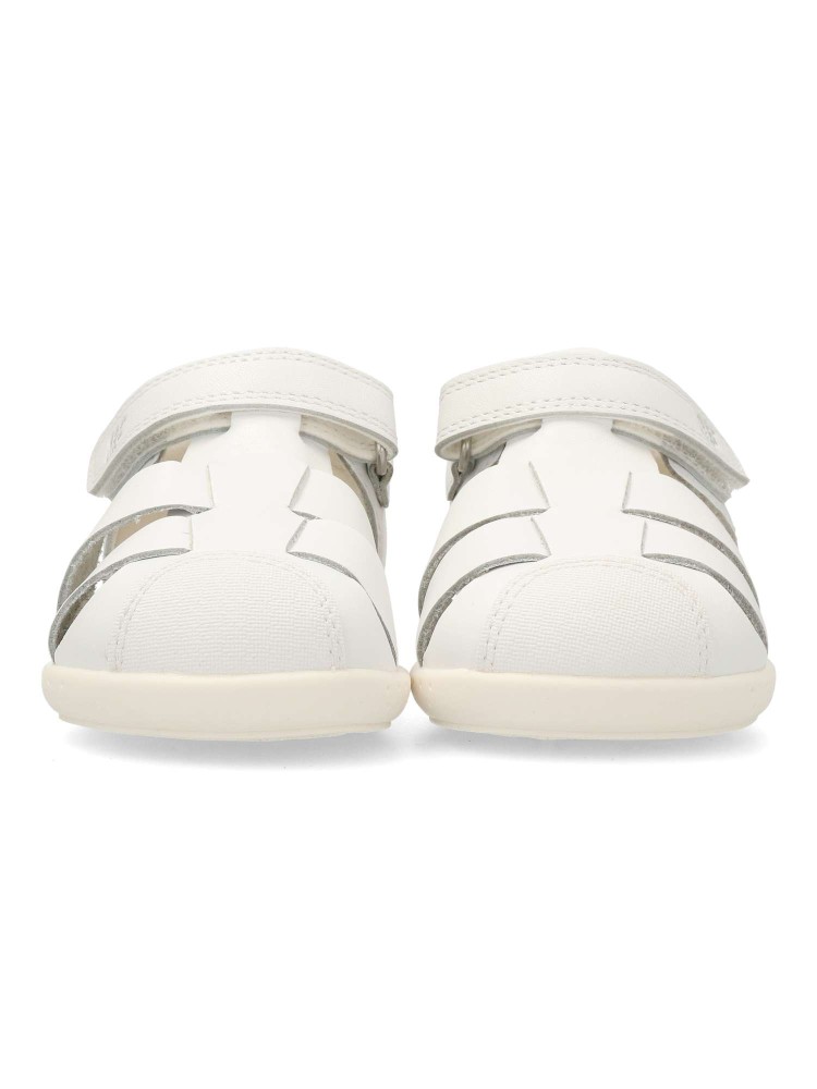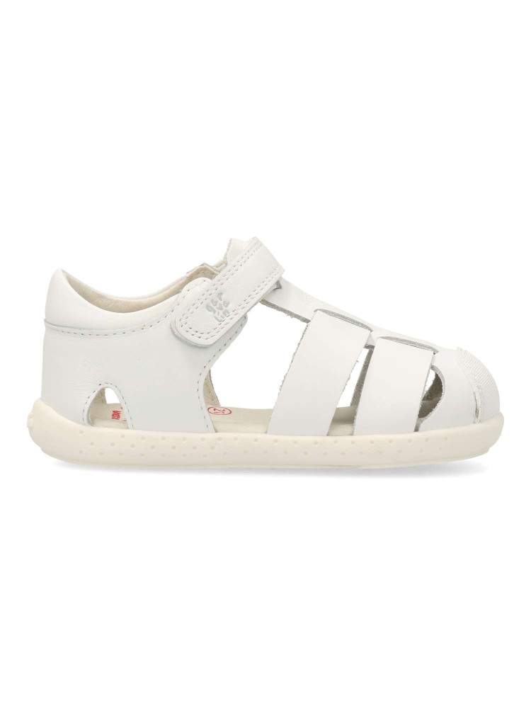 Sandalia cómoda para niño y niña. Fabricadas en piel. Planta acolchada. Color blanco. Cierre adherente. Modelo transpirable y flexible con plantilla de microfibras antibacterias. Cero Drop y puntera mas amplia. Respetuoso con el desarrollo natural del pie