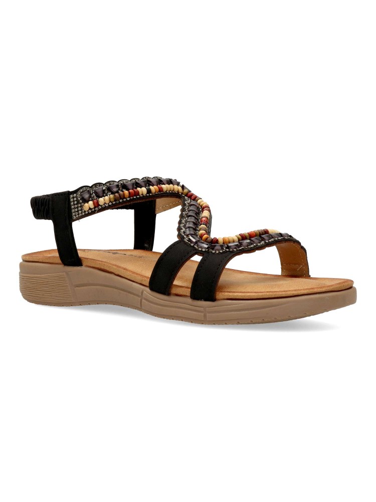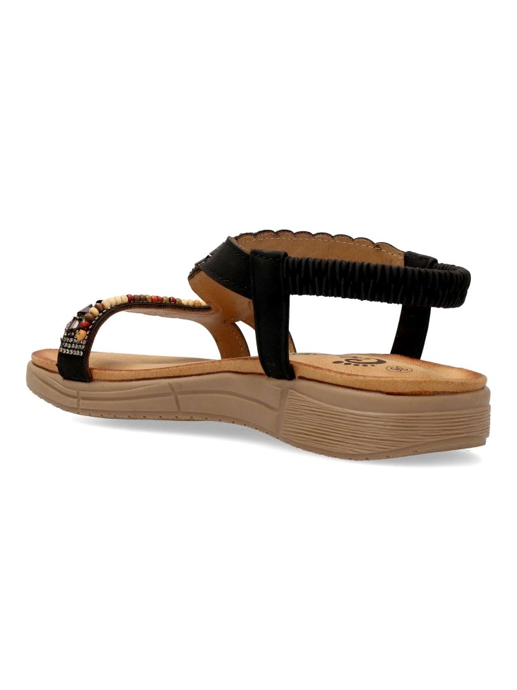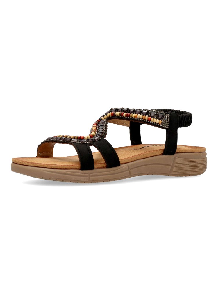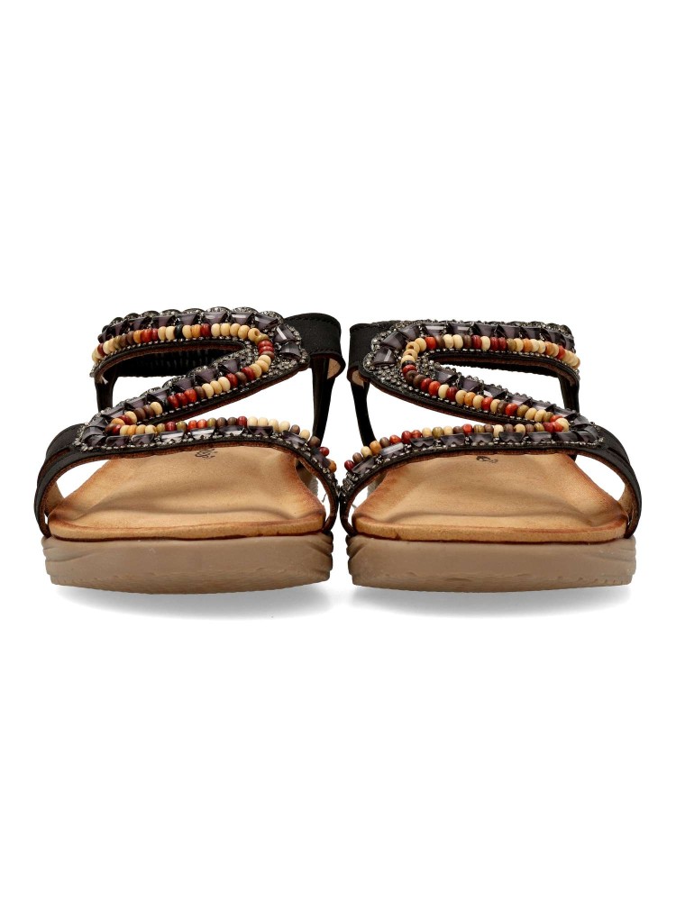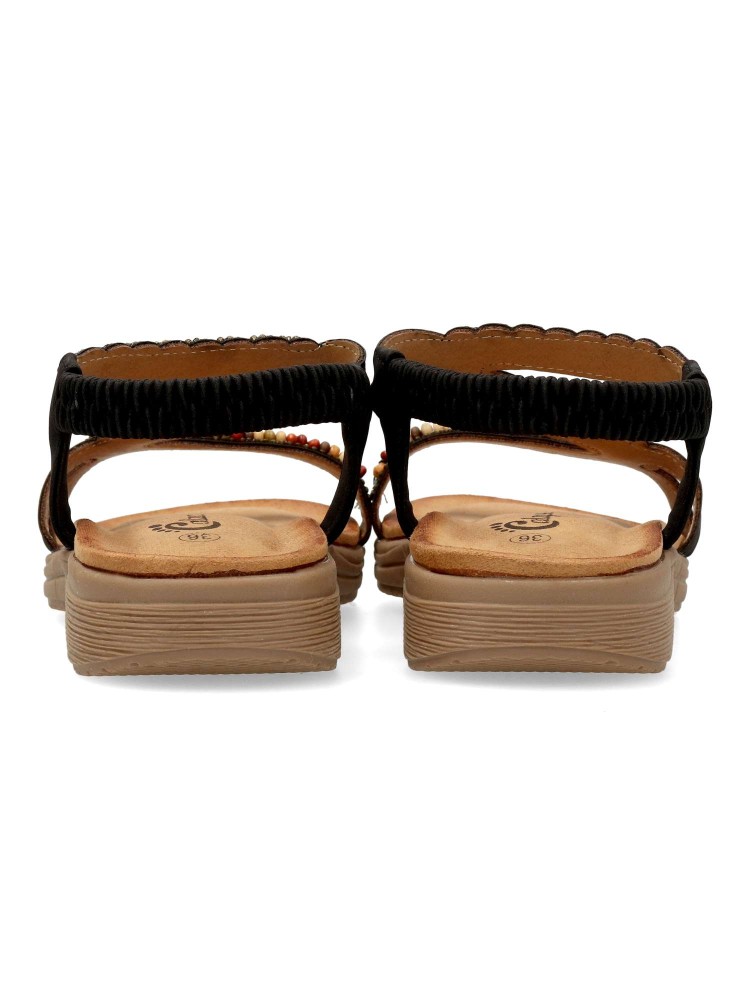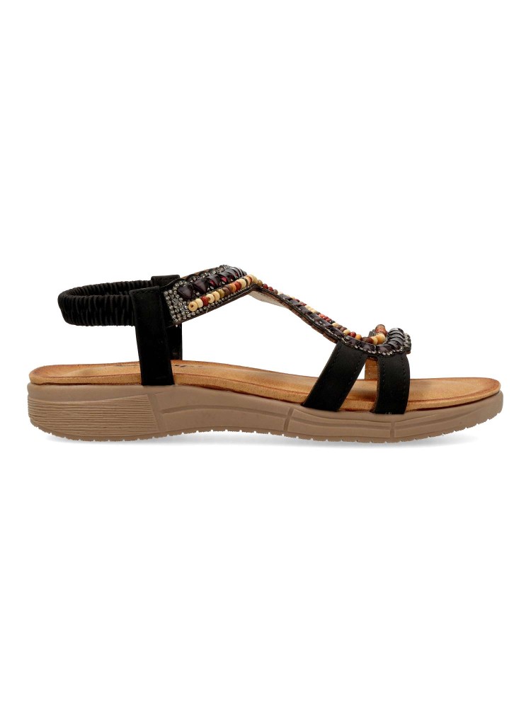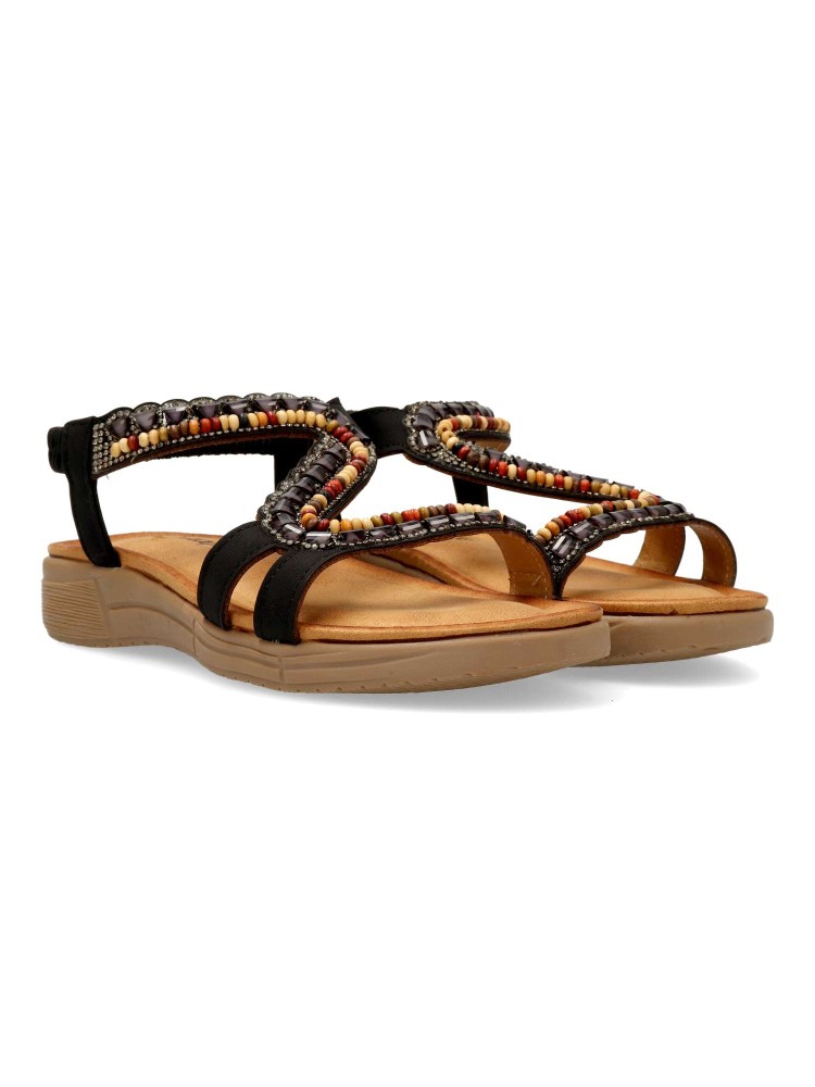 Sandalia cómoda de mujer, estilo étnico. Sujeta al tobillo por un elástico en la talonera. Disponible en color negro. Fabricado en material sintético con suela de goma. Detalle pedrería y distintos adornos. Planta acolchada, confort diario para verano.