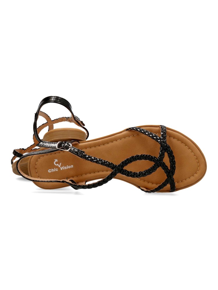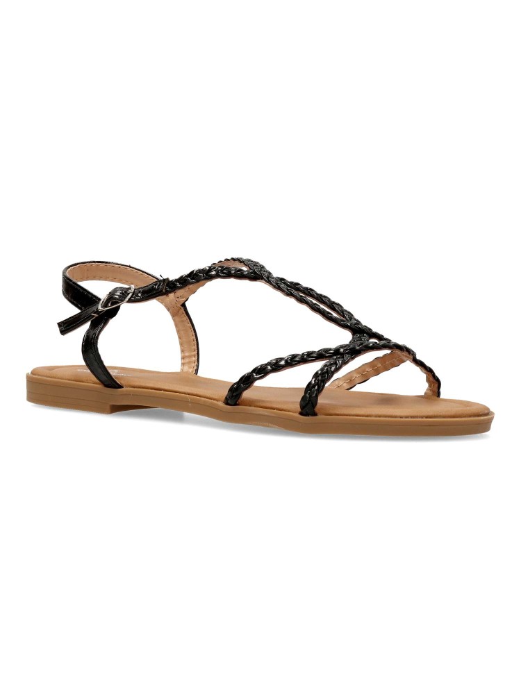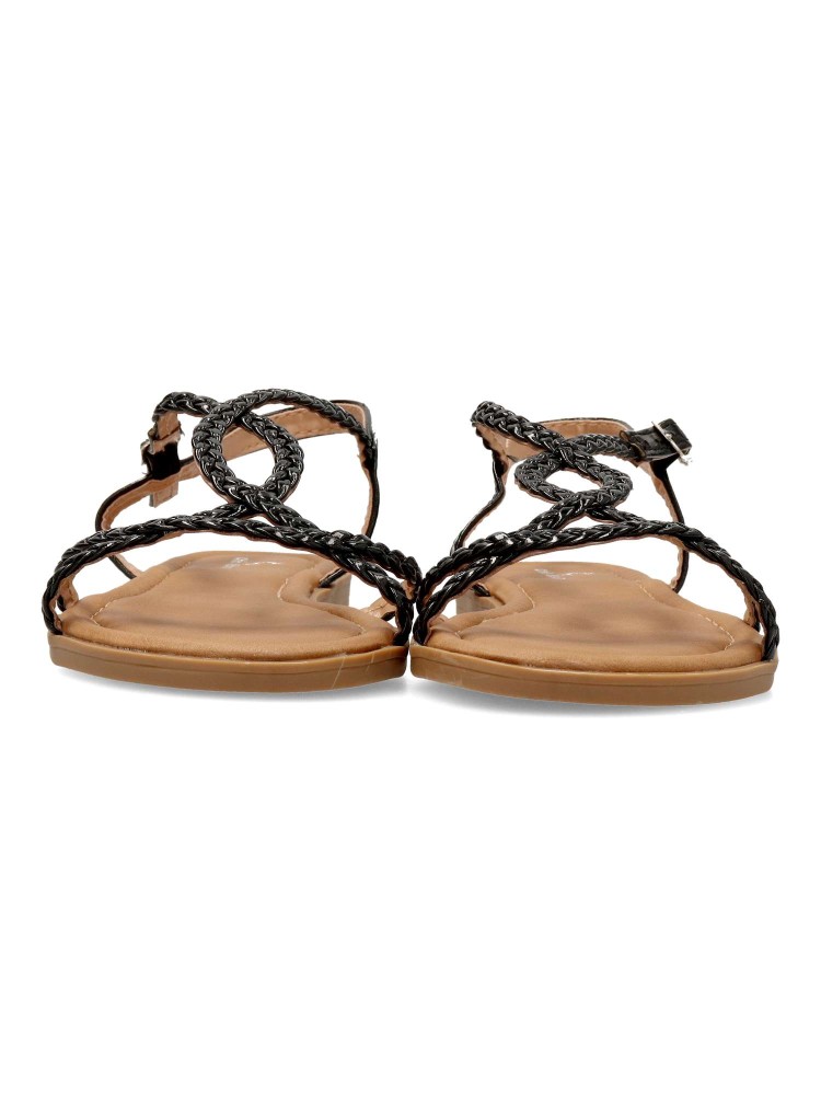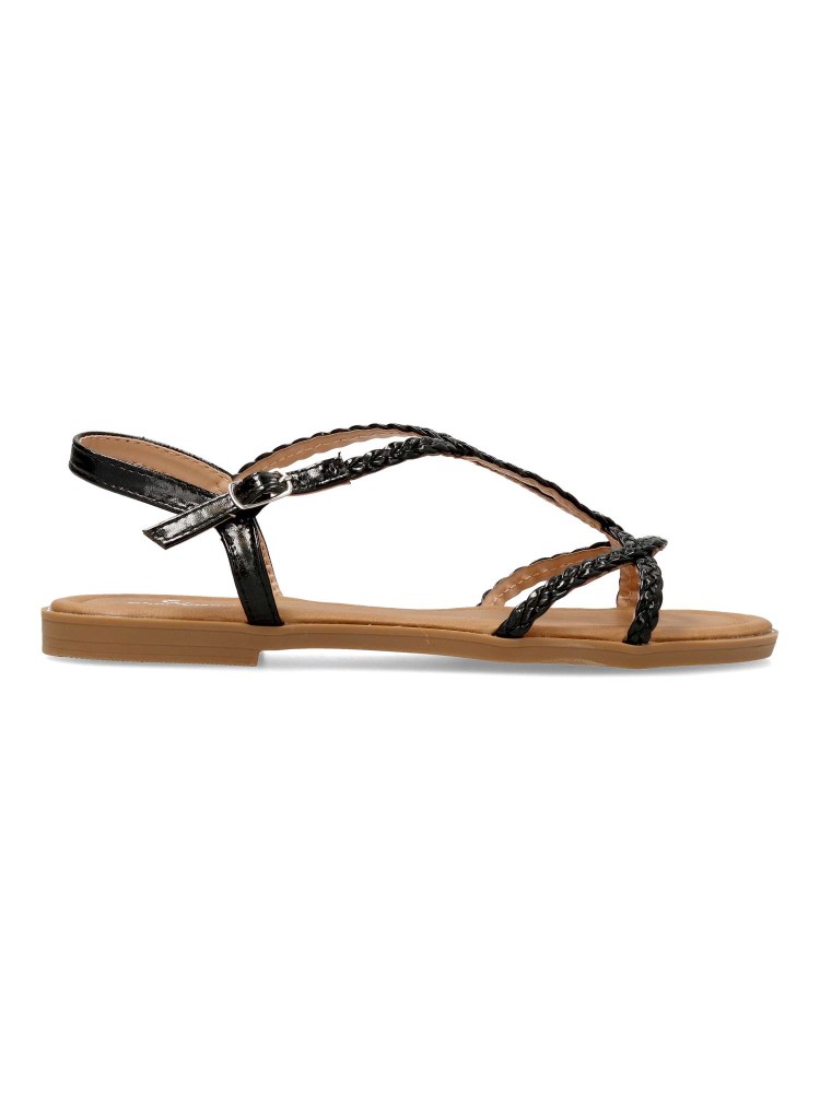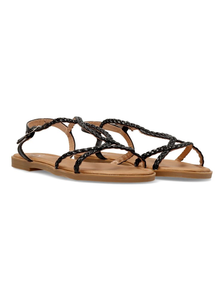 Sandalia cómoda plana para mujer. Modelo de tiras trenzadas, fabricada en piel sintética, con suela de goma. Cierre de hebilla al tobillo. Color negro. Plantilla acolchada. Ideal para combinar con tus vestidos y faldas en verano.