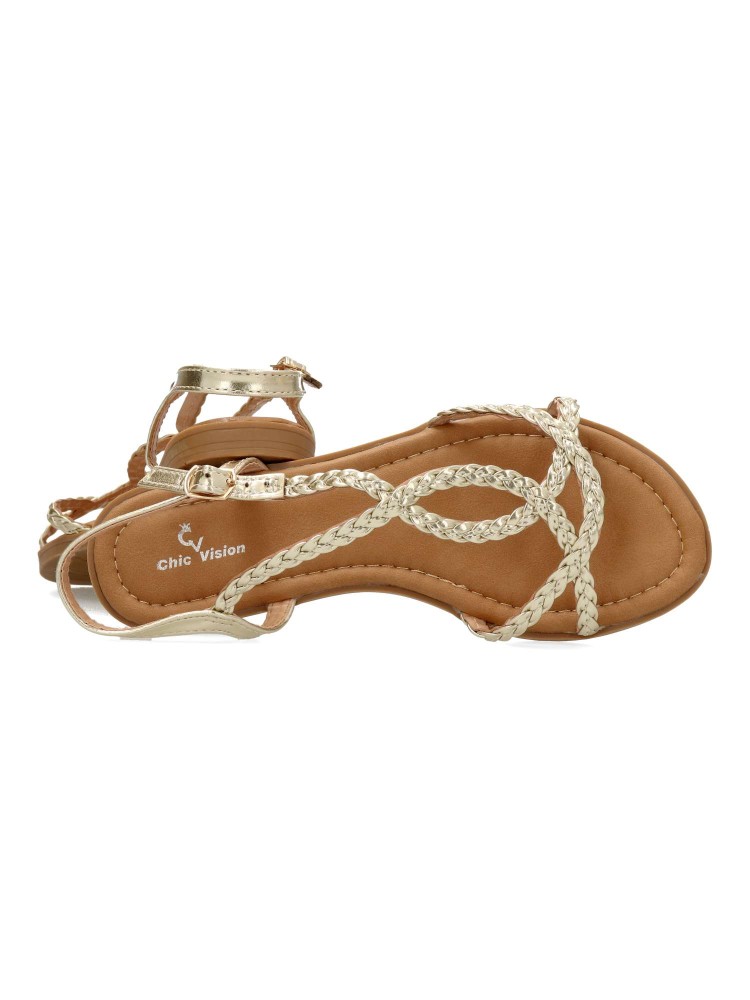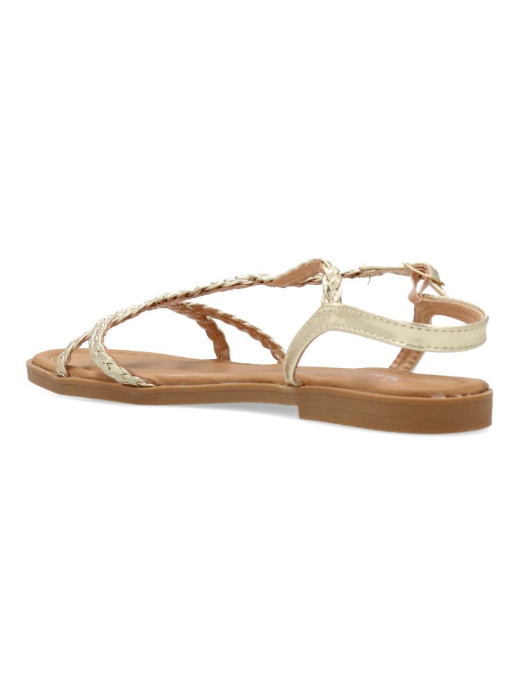 Sandalia cómoda plana para mujer. Modelo de tiras trenzadas, fabricada en piel sintética, con suela de goma. Cierre de hebilla al tobillo. Color oro. Plantilla acolchada. Ideal para combinar con tus vestidos y faldas en verano.