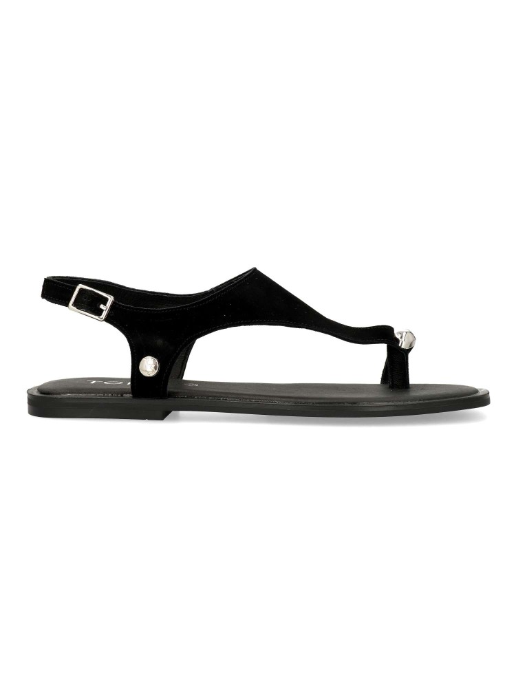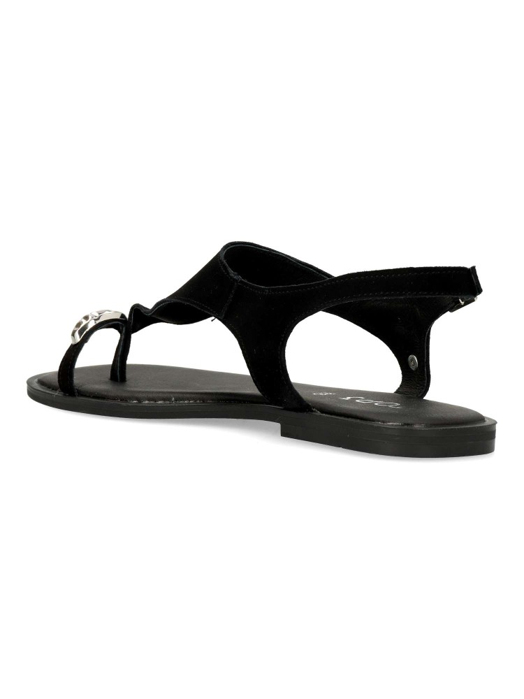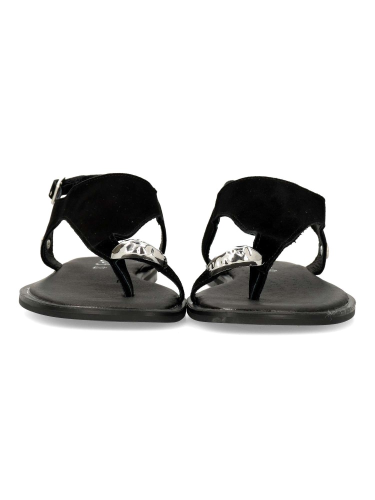 Sandalia plana y cómoda para mujer. Fabricada en piel con detalle metalizado. Planta de piel acolchada y suela de goma. Color negro. Diseño versátil, cómodo, original y elegante, que podrás combinar con todos tus outfits de verano.
