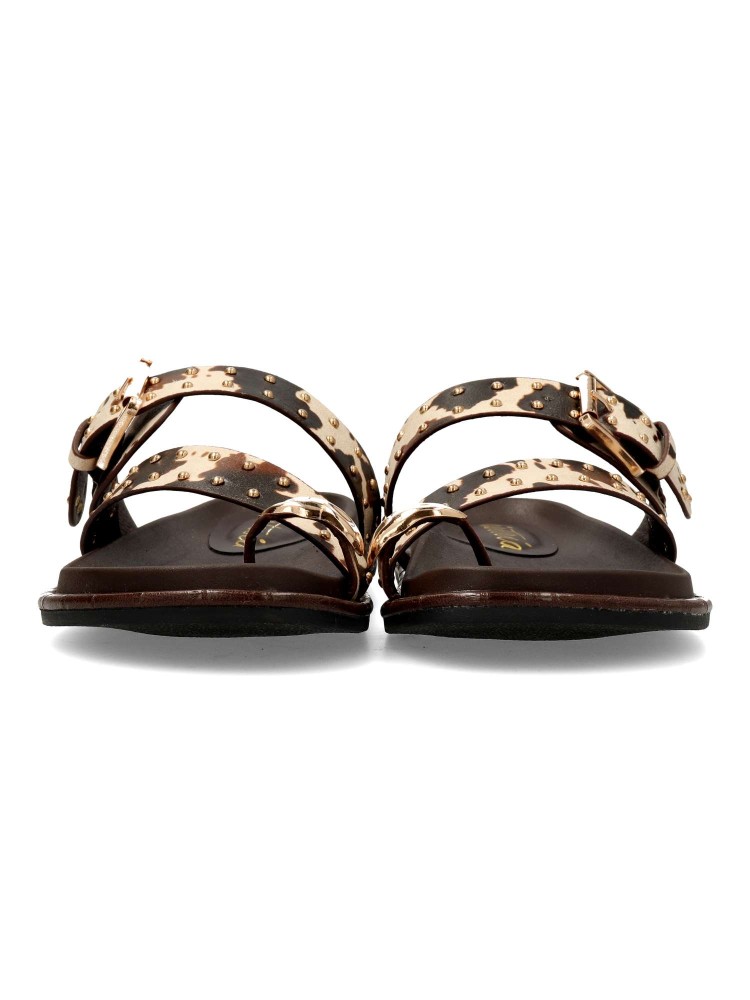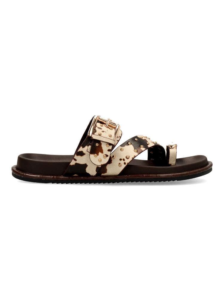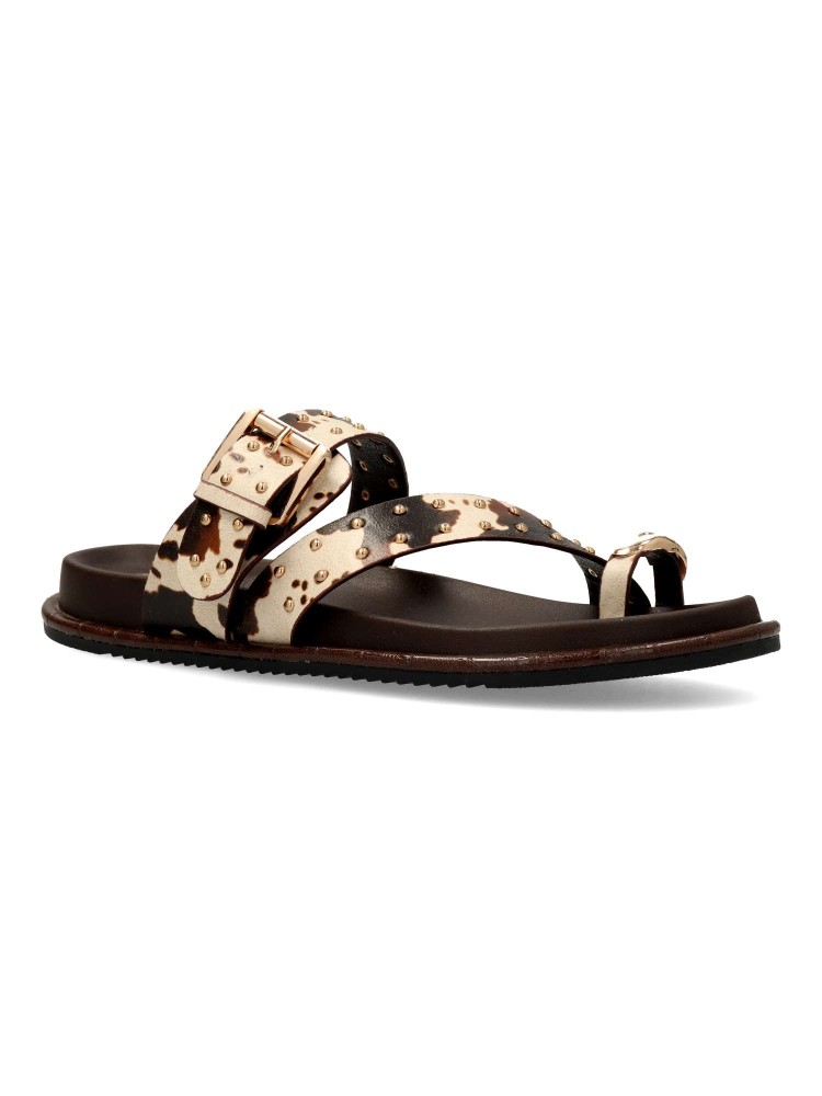 Sandalia plana de tiras para mujer. Fabricada en material sintético estampado vaca, con tachas decorativas. Planta acolchada y suela de goma. Diseño versátil, cómodo y elegante, que podrás combinar con todos tus looks de verano. 100% vegano