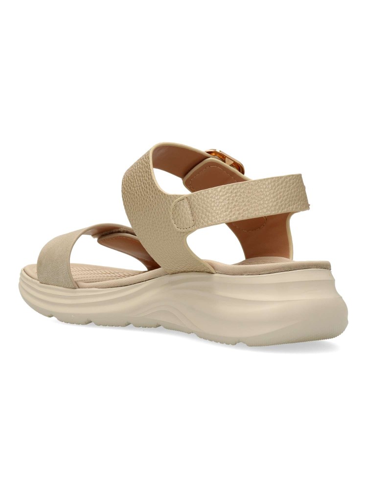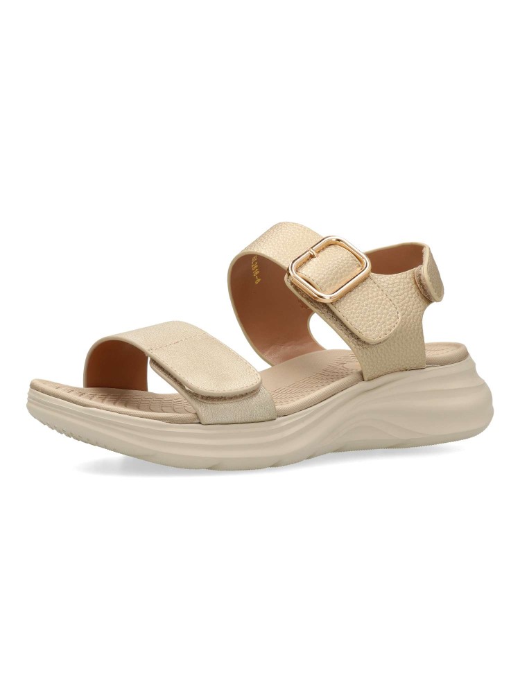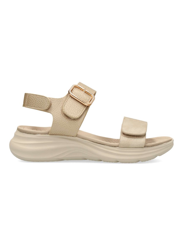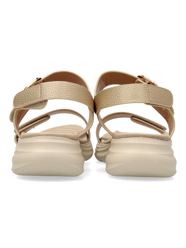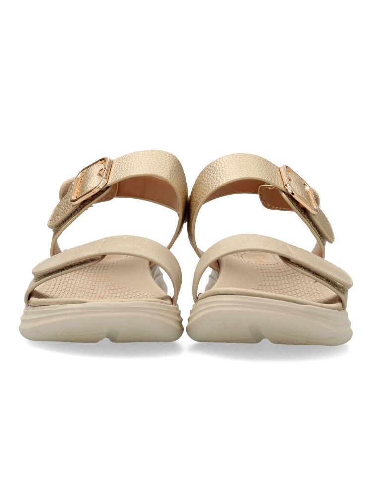 Sandalia cómoda de mujer, con ajuste de tiras adherentes. Fabricado en piel sintética. Suela de goma ligera y flexible. Planta acolchada. Color oro. Máximo confort, en una sandalia versátil, fácil de combinar, ideal en tus paseos de verano.
