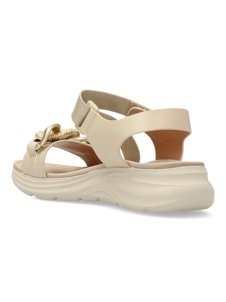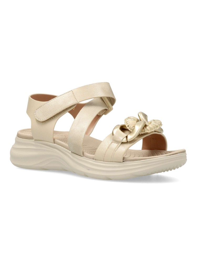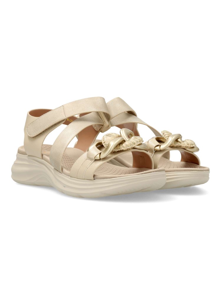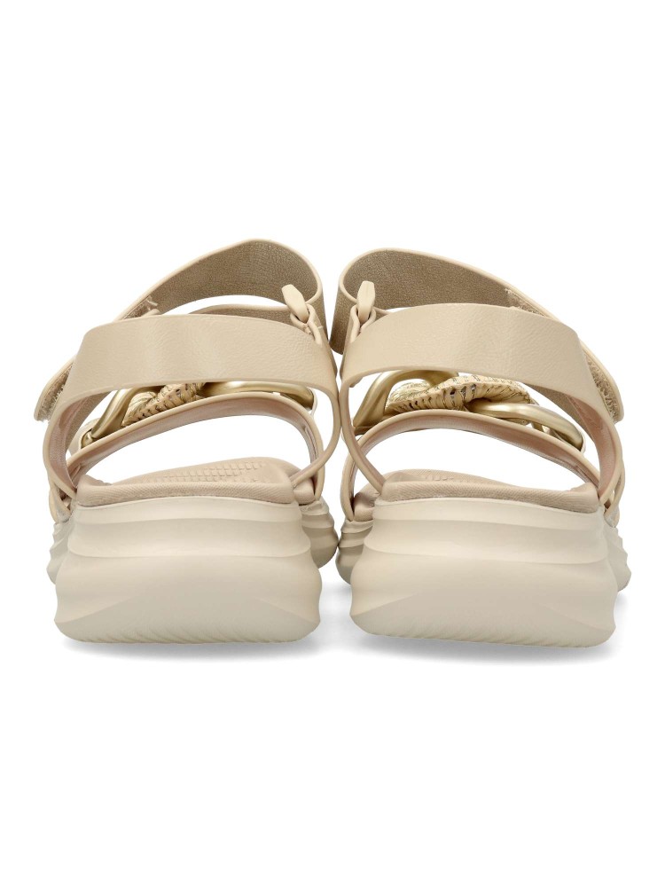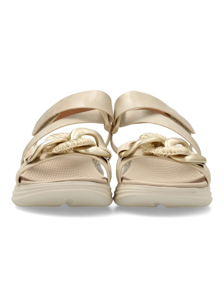 Sandalia cómoda de mujer, con cierre adherente. Fabricado en piel sintética metalizada. Suela de goma ligera y flexible. Planta acolchada. Color beige. Máximo confort, en una sandalia original y versátil. Ideal con tus looks de verano.