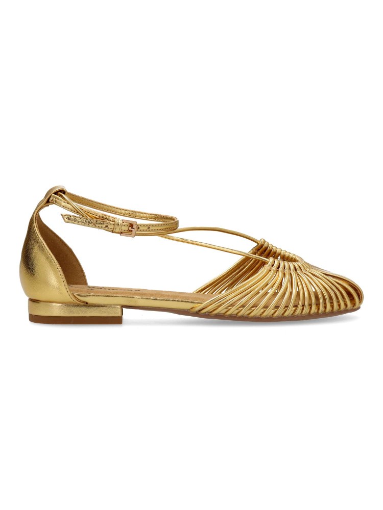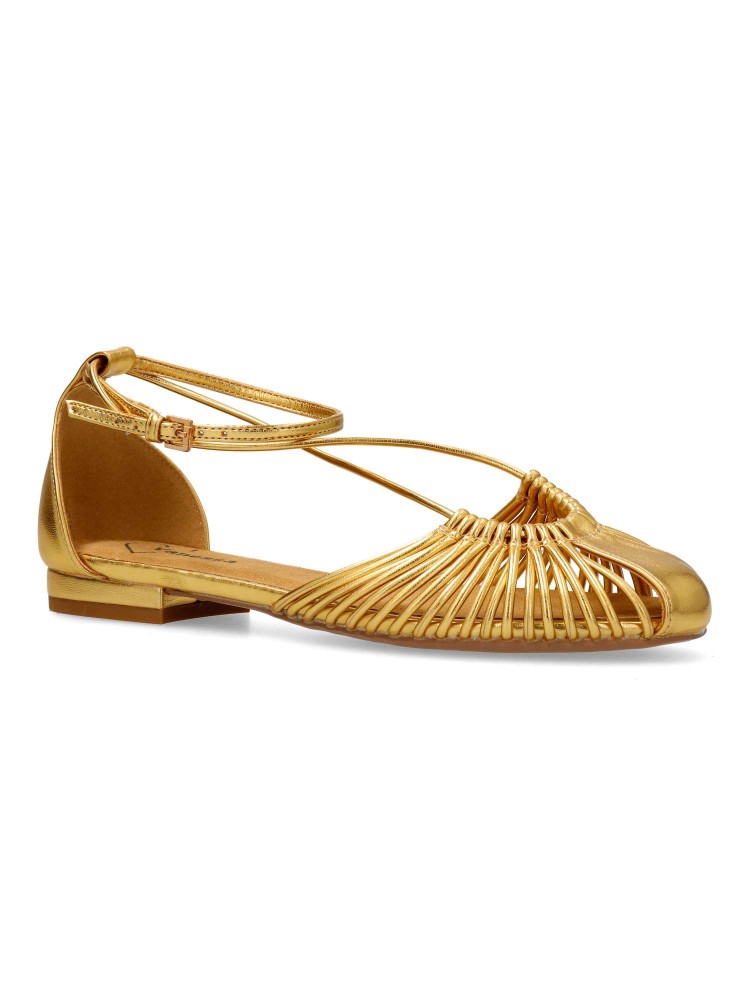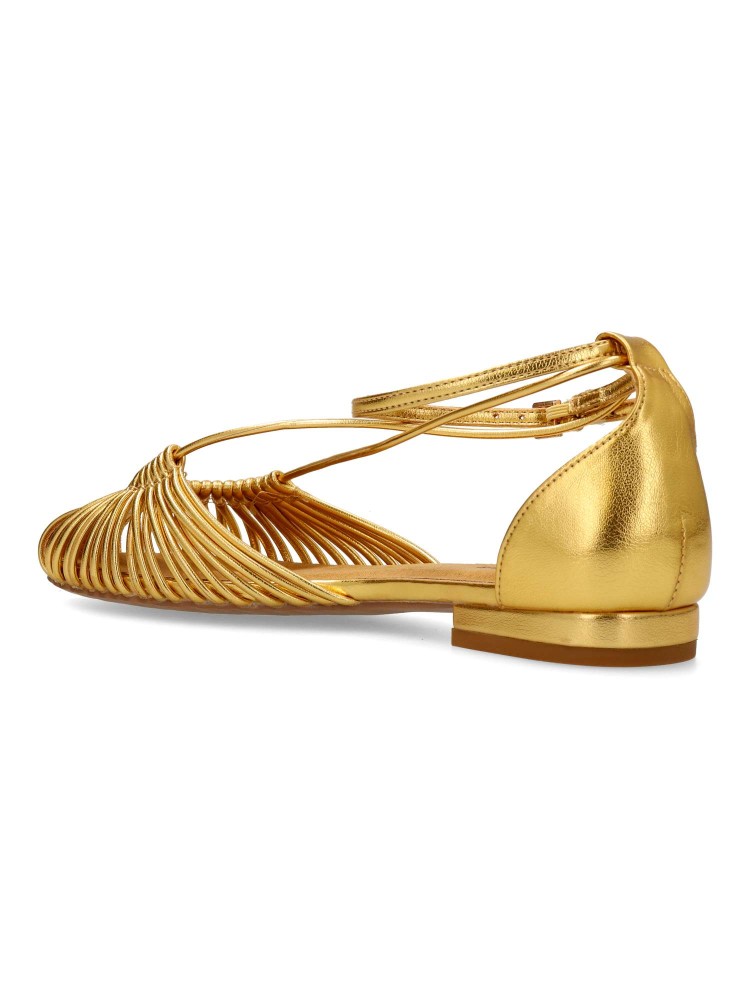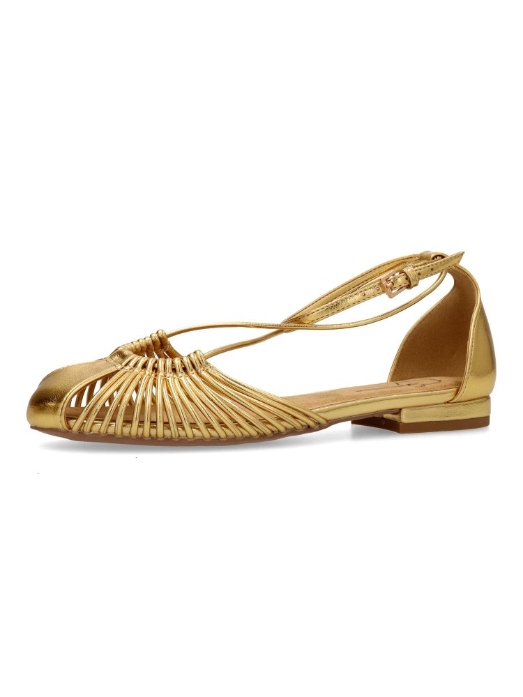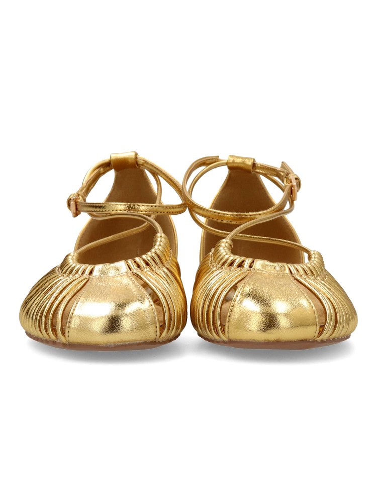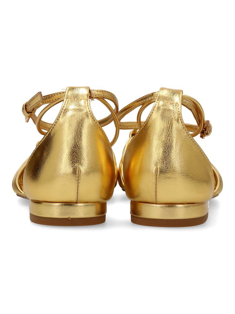 Sandalia plana de mujer, estilo romana. Modelo de tiras cruzadas, fabricada en material sintético con suela de goma. Cierre de hebilla con tira al tobillo. Color oro. Diseño y confort para añadir personalidad a cualquier outfit de temporada.