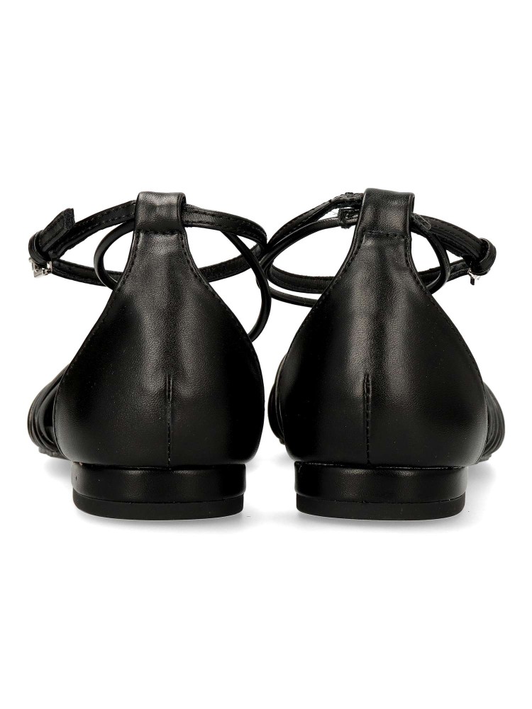 Sandalia plana de mujer, estilo romana. Modelo de tiras cruzadas, fabricada en material sintético con suela de goma. Cierre de hebilla con tira al tobillo. Color negro. Diseño y confort para añadir personalidad a cualquier outfit de temporada.