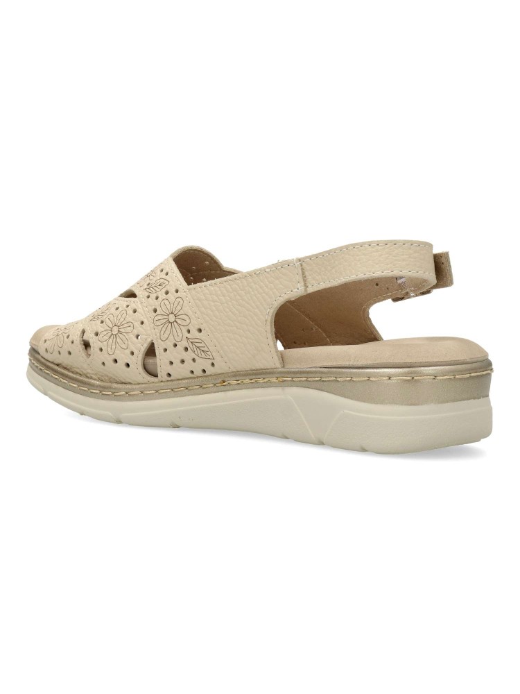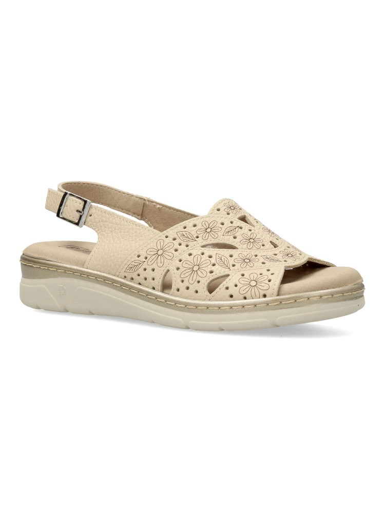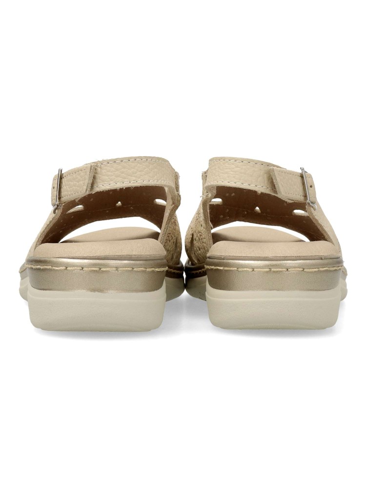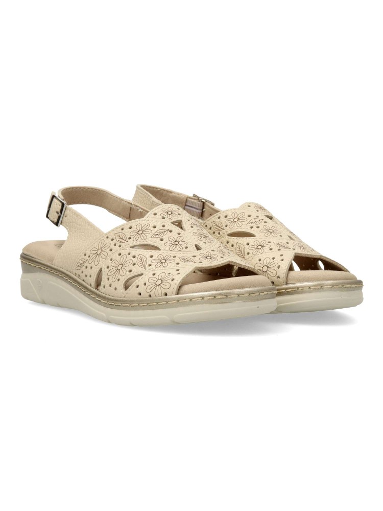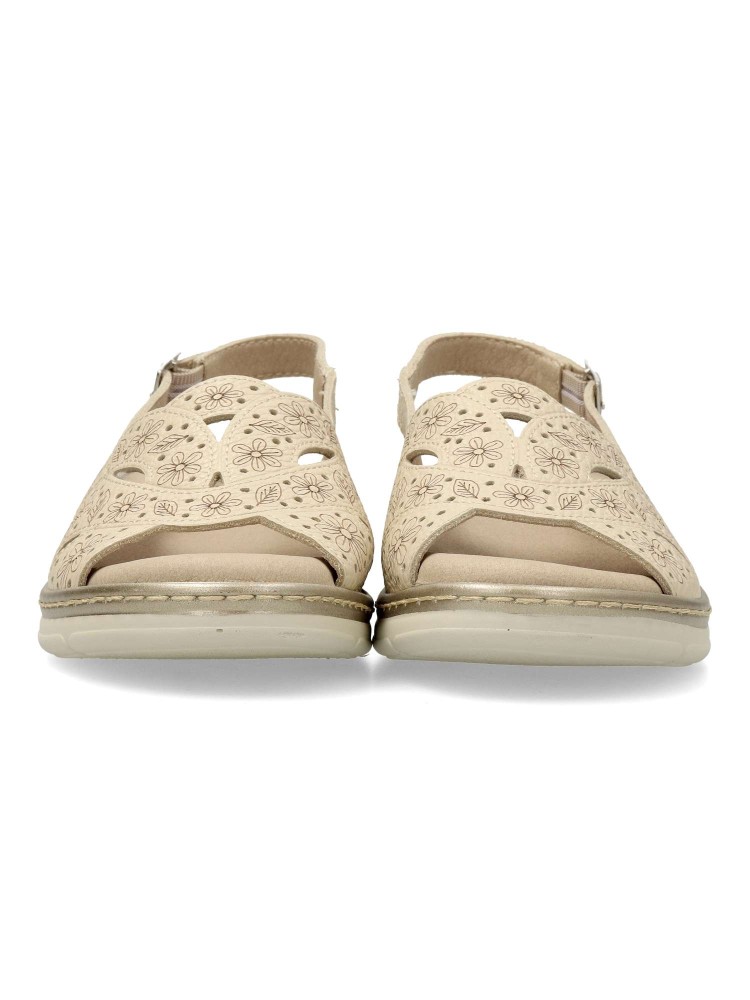 Sandalia cómoda de mujer, con cierre de hebilla. Fabricado en piel natural grabada. Plantilla acolchada y extraíble. Color crema. Puntera y talón descubiertos. Proporcionan una agradable sensación de confort y bienestar. Hecho en España.