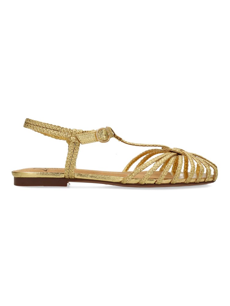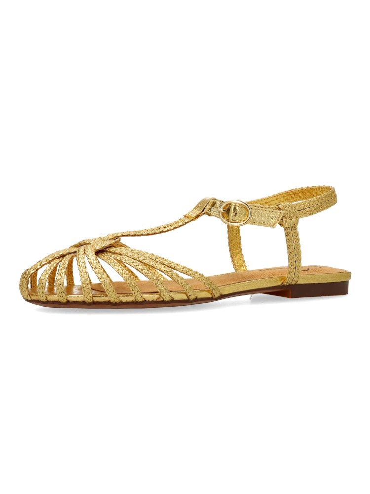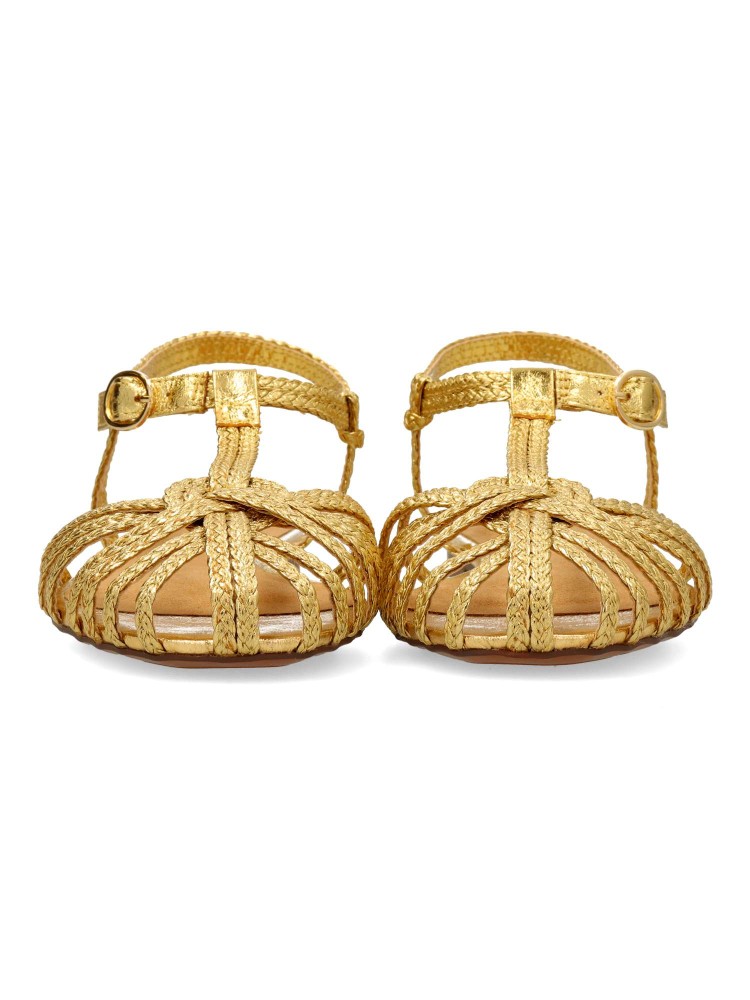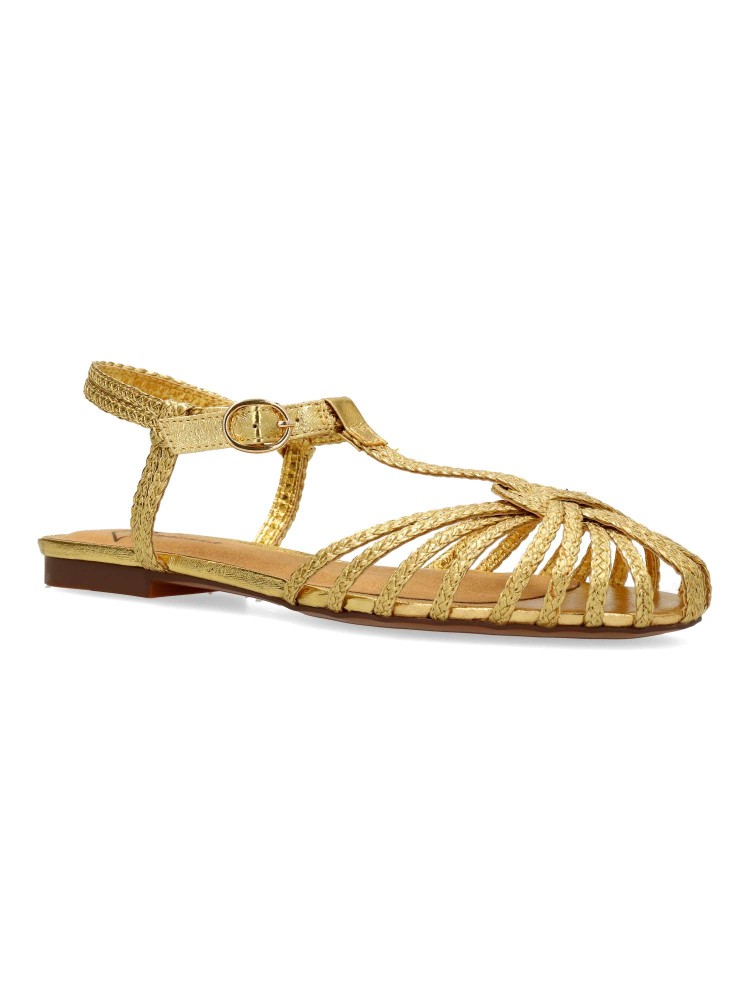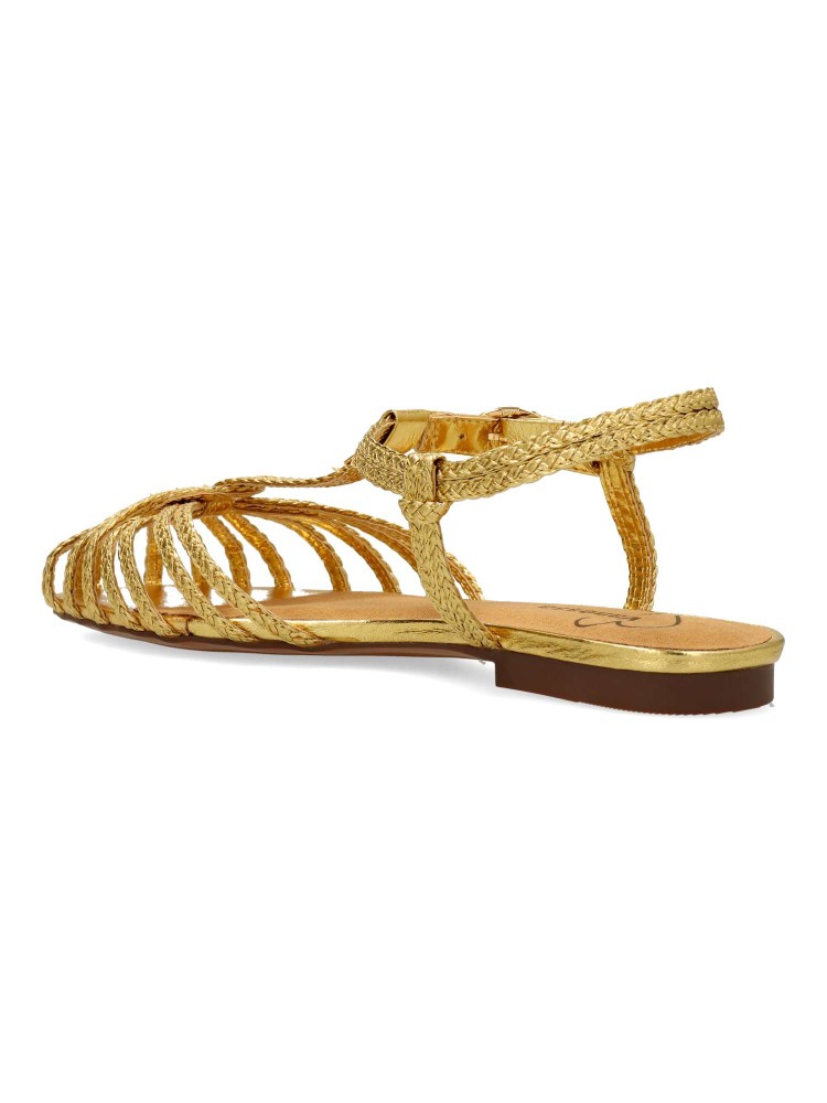 Sandalia plana de mujer destalonada. Modelo de tiras trenzadas, fabricada en material sintético metalizado, con suela de goma. Cierre de hebilla. Color oro. Diseño versátil y elegante, que añade personalidad a cualquier outfit de temporada.