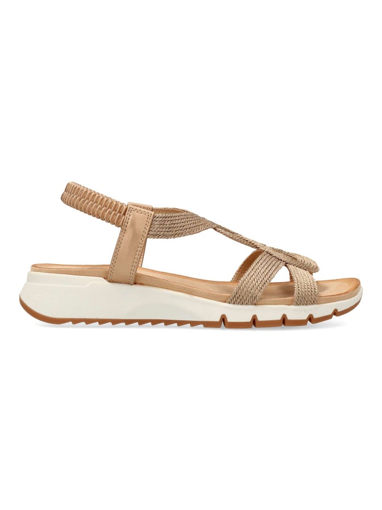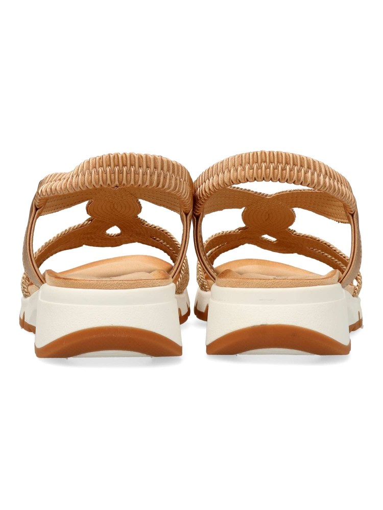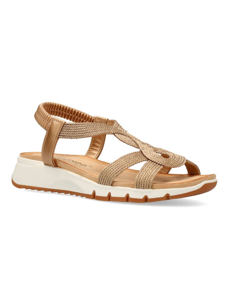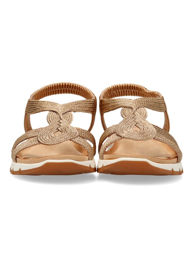 Sandalia cómoda de mujer. Sujeta al tobillo por un elástico en la talonera. Disponible en color bronce. Fabricada con tiras de cuerdas y suela deportiva de goma. Planta acolchada. Confort diario con tus looks de verano. Amarpies confort.