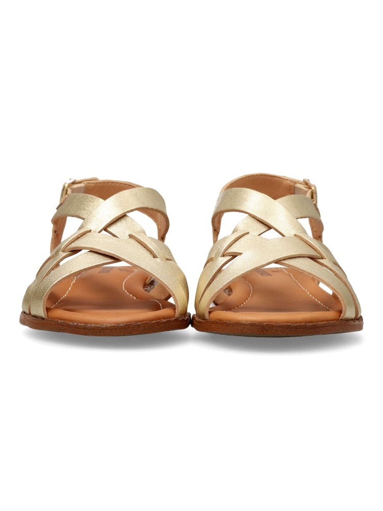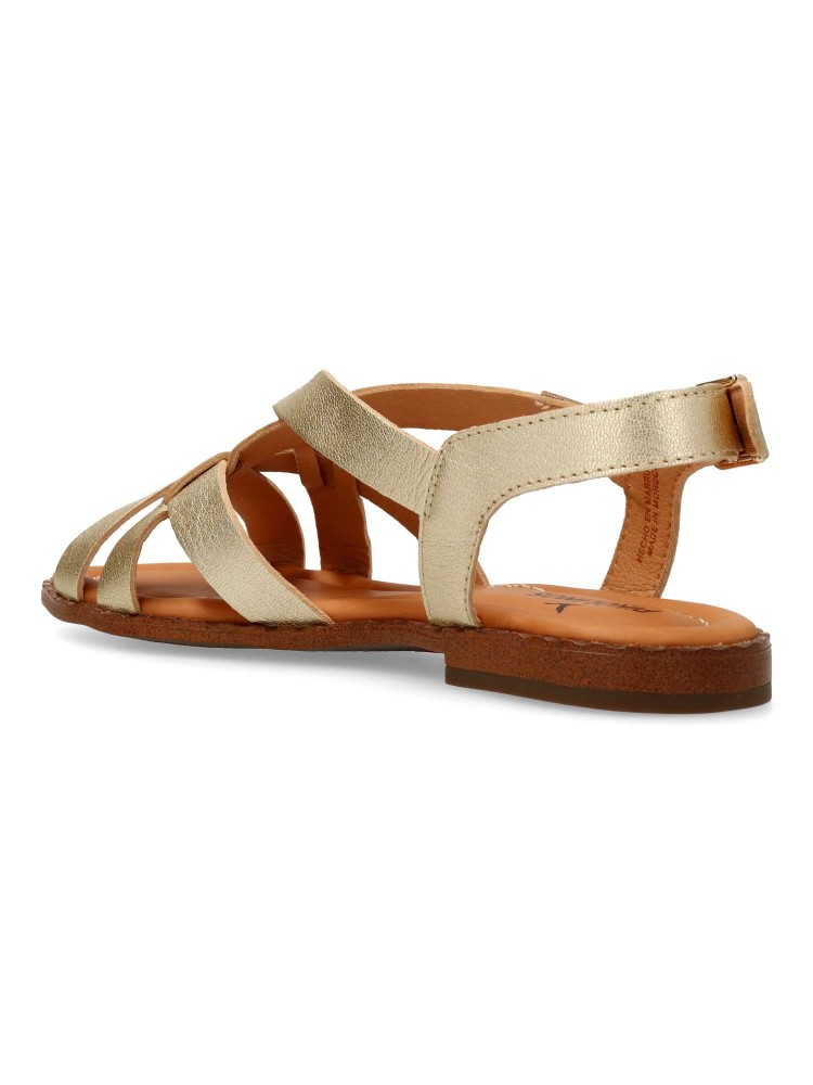 Sandalia plana de tiras cruzadas para mujer -ALGAR-. Cierre de hebilla. Modelo cómodo, fabricado en piel vacuno, con suela de goma antideslizante. Planta acolchada. Color platino. Fácil de combinar con tus looks de verano.