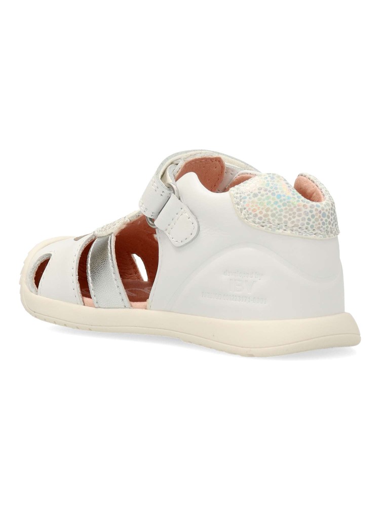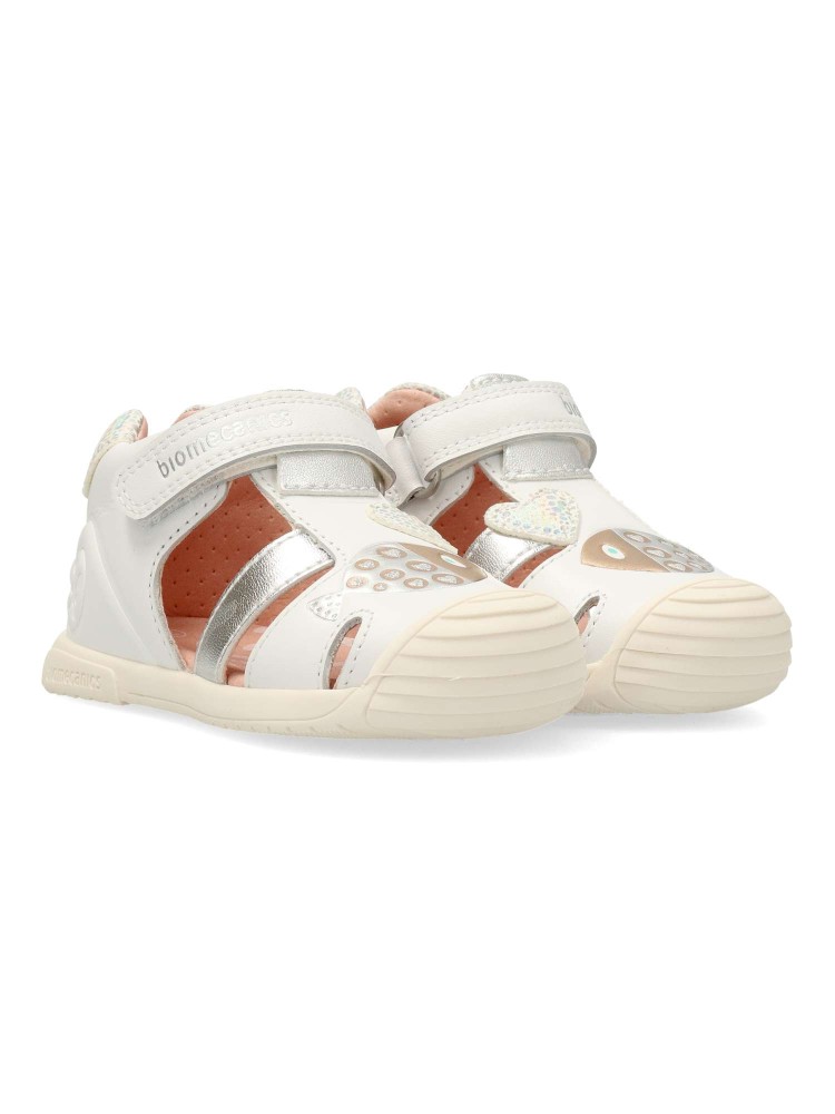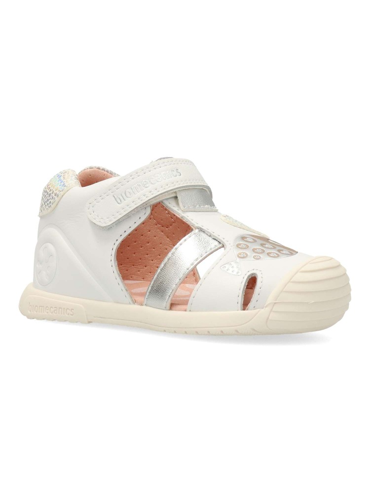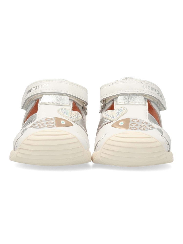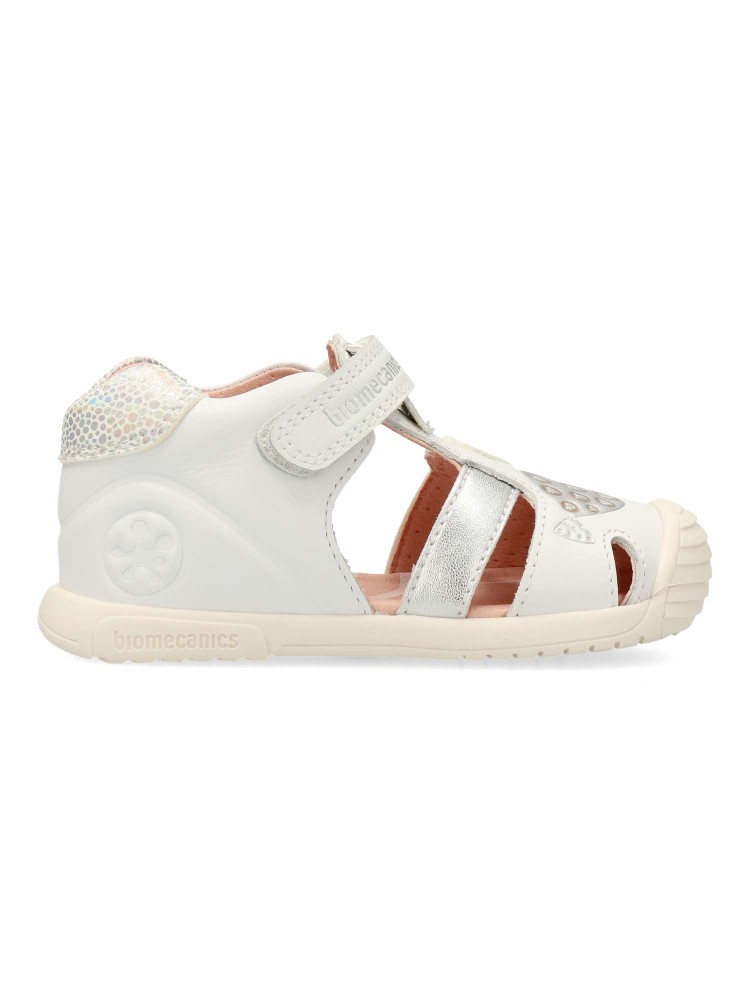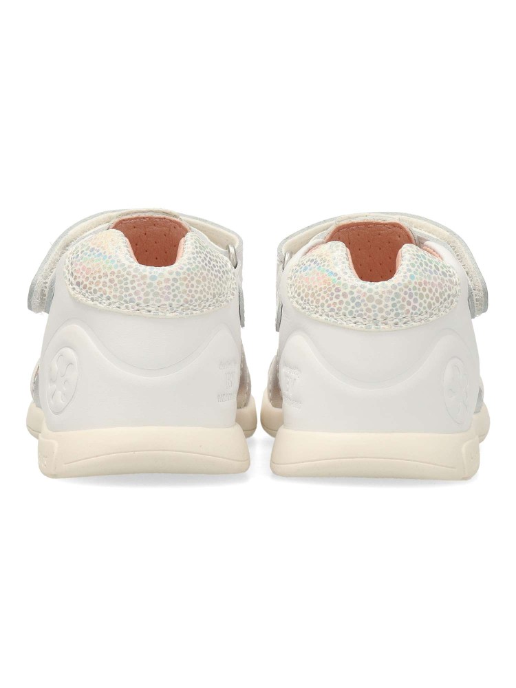 Sandalia cómoda piel para bebe/niña. Color blanco-plata. Cierre adherente. Puntera y talón reforzados. Dibujo intantil estampado. Biogateo: Máxima estabilidad. Un calzado creado para que los primeros pasos de nuestros hijos sean cómodos y estables.